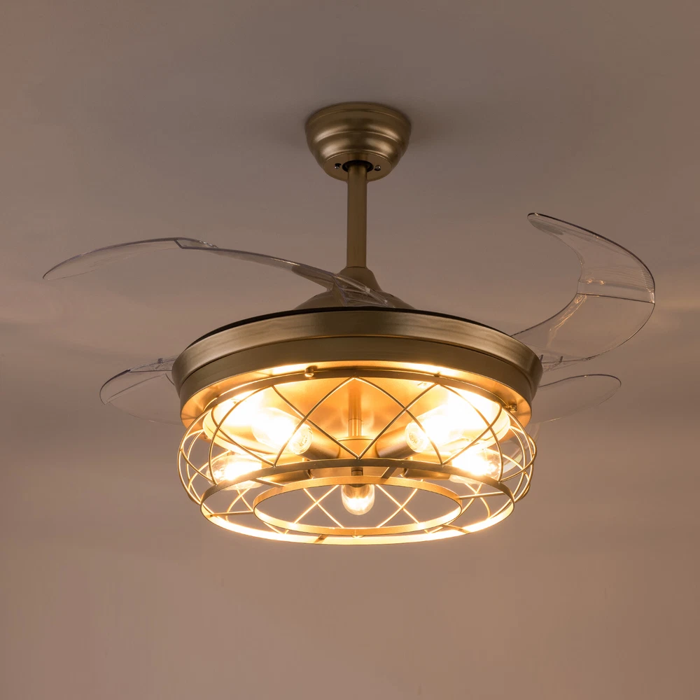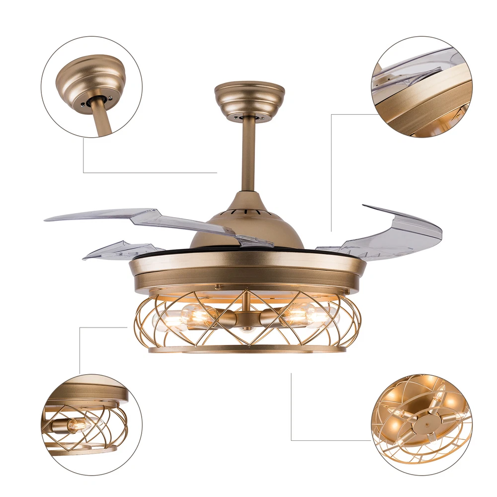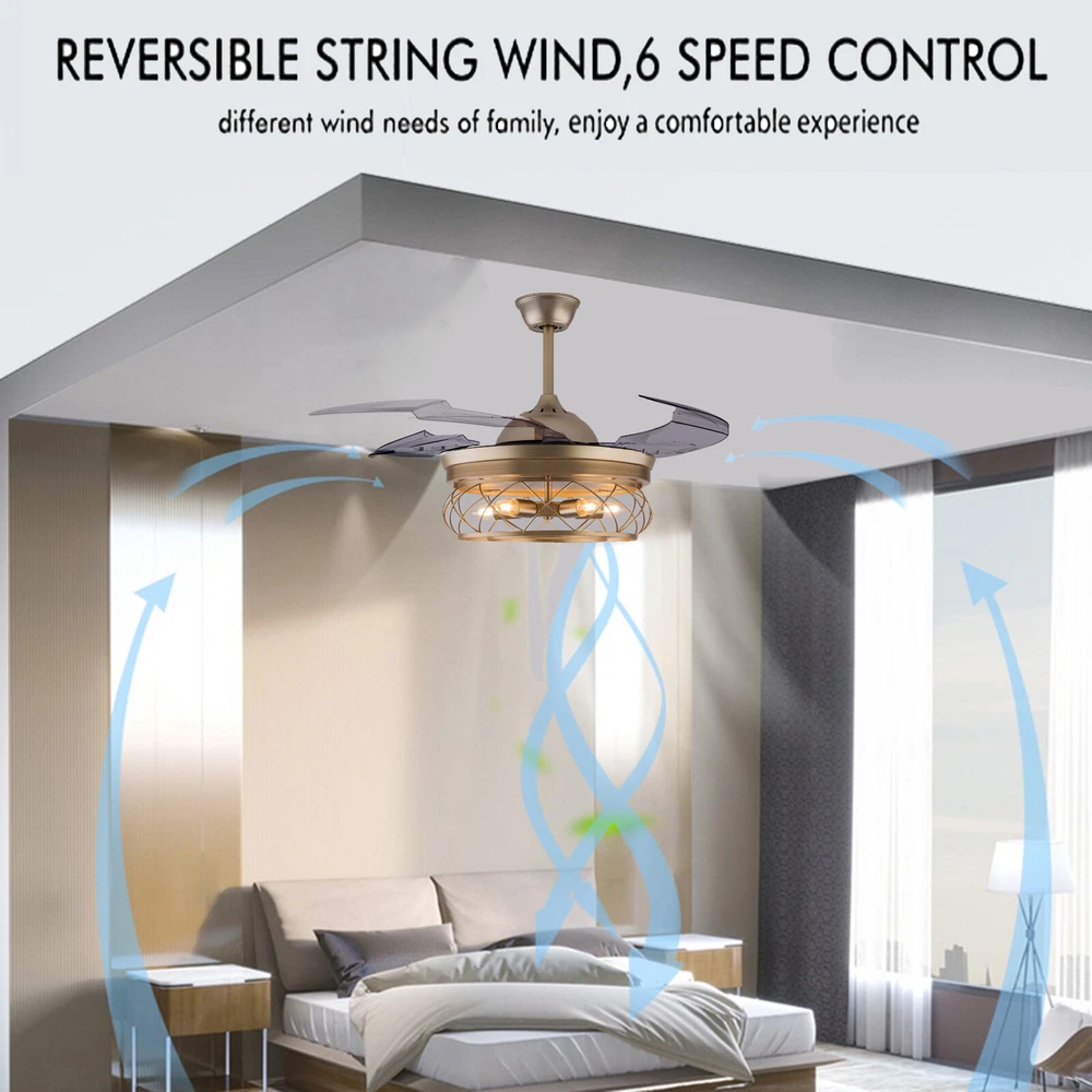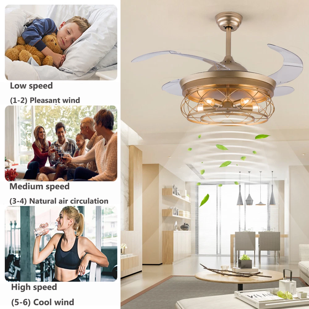 Gold Caged Ceiling Fan Light Farmhouse Chandelier Fan Pedant Lamp Remote Control Description This unique light fixture adds a gorgeous style to any room. It blends well with the theme of the room, which adds a beautiful visual appeal that only this light can create. The high power motor and it can illuminate an area of 107.64-215.28sq.ft after installing 5 bulbs. It is not only a luminaire but also a beautiful decorative piece. Key Features High-quality Material: This product is made of high-quality iron and ABS, and the surface has been baked with a paint process. It has the characteristics of anti-corrosion , anti-rust , and high hardness, which can effectively extend the service life of the product. Two Hight Options: Two different lengths of down rods (4.8ft and 9.8ft) are available between 8.86-9.84ft floor heights. You can choose the height of the down rod according to the room layout and floor height for greater adaptability. Powerful and Comfortable Lighting: 5 E26 lamp holders provide powerful lighting (107.64-215.28sq.ft). The non-visible strobe makes the light more delicate and comfortable, and will not be harsh to the eyes. Stylish Appearance: The simple gold hollowed out shade brings a vintage and industrial look to your home. When the fan is turned off, the fan blades will retract to give you a modern aesthetic. Smart Remote Control: The remote control is so simple to operate that even the elderly and children can easily operate it. It also allows you to regulate the fan, light, and timing (1H/2H/4H) as you like. Two-way Rotation: The normal mode of the fan can bring coolness in summer, while the winter reverse mode can be combined with heating to press down the warm air and increase the air convection rate, creating a 360-degree ambient heating flow. Quiet and Energy Efficient: Inverter motor has low noise(≤32db), and power consumption is about 30% of ordinary motor, which is more energy-saving . 6-speed Wind Adjustment: The ceiling fan has a 6-speed wind adjustment.1~2 gears for sleep wind, soft and soothing; 3~4 gears for comfortable wind; 5~6 gears for strong wind, can effectively drive away the sweltering heat. High Security: The 5.9 inches iron ceiling cover can hold the weight of the lamp more stably, thus better protecting you and your family. Ideal Gift: This product is stylish and high-quality and can be used as a gift for parents, friends, and loved ones, or as a housewarming, birthday, and holiday gift. Details E26 Lamp Head: It can match any E26 bulb and is easy to purchase and replace. ABS Transparent Fan Blade: High-quality ABS material is dirt-resistant and easy to clean, which can be cleaned by gently wiping with a wet rag. Application You can install this unique luminaire on different occasions, such as home, hotel, coffee shop, bar, bookstore, etc. It has a lighting area of 107.64-215.28sq.ft. Specification Material: Iron, ABS Color: Gold Process: Baking Paint Style: Modern Model: YX191 Assembly Required: Yes Mounting Type: Downrod Mount Electric Fan Design: Ceiling Fan Indoor/Outdoor Usage: Indoor Control Mode: Remote Control ( Available to Control Light, Fan, and Timer) Noise: ≤32db Voltage: AC110V Motor Power: 45W Timing Range: 1h, 2h, 4h Light Source: E26*5 ( Not Included ) Number of Speeds: 6 Number of Blades: 4 Applicable Floor Height: 2.7-3m/8.86-9.84ft Lighting Space: 10-20㎡/107.64-215.28sq.ft Base Diameter: 15cm/5.9in Down Rod Length: 12cm/4.8in, 25cm/9.8in Lampshade Size(φ*H):48*18cm/18.5*7.08in Total Height: 45cm/17.71in, 58cm/22.83in Total Diameter (With Fan Blade Open): 107cm/42in Package Included 1 * Retractable Ceiling Fan 1 * Remote Control (2*AAA Battery, Included) 1 * English Manual All Accessories for Installation Notes Please note that each bulb power matched with the product cannot exceed 18W. This product is not waterproof , please install it in a dry environment. Please disconnect the power and wipe with a soft, dry cloth before cleaning the shade or fixture. This product is not dimmable. This product does not contain light sources, please purchase your own. Please allow the slight color difference caused by the shooting light and the 1-3 cm error due to manual measurement, and make sure you do not mind before ordering. Payment Delivery details Terms of sales About us Contact us Payment We accept ebay payment 。 Fees such as import duties, taxes are not included in the item price or shipping costs. These charges are the buyer's responsibility. Delivery details Shipping: 2-9 working days to: USA Terms of sales We maintain high standards of excellence and strive for hundred percent customer satisfaction. Feedback is very important to us. We hope that you contact us immediately before you give neutral or negative feedback, so that we can address your concerns. It is impossible to address issues if we do not know about them! About us Your satis faction is our ultimate goal. We work hard to earn your trust and future business. Our certified technicians have tested each item before shipping. The unit comes with 1 year limited warranty on all manufacturing defects. a) If you receive a defective item, you may return it or ask for a discount. Please contact us within 14 days after you receive the package. b) What you returned must be intact and in its original packaging as re? u. Customer is responsible for shipping costs of the returned item. c) We will cover the cost of shipping back t with the shipping rate indicated in the registration page. We will send you a new unit or refund the full payment you paid. Thank you. Contact us Business Hour Business Hour: Monday To Friday: 8:30 AM to 5:00 PM (Beijing China time) Due to time zones, our reply to your questions may not be immediately. But within above working time, we will reply your email within 24 hours. If it's non-workdays, please kindly be patient and wait till Monday. Please contact us with ebay message. Please feel free to contact us if you have any questions. Monday To Frida