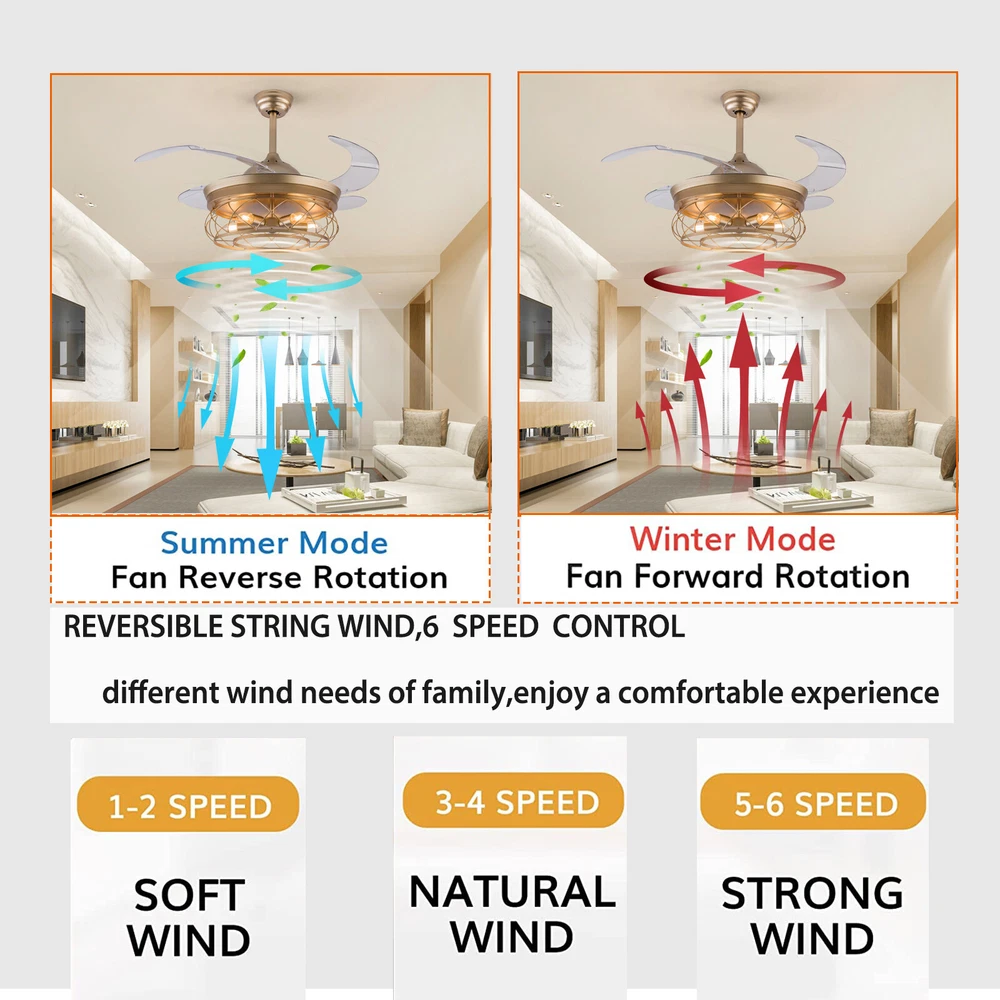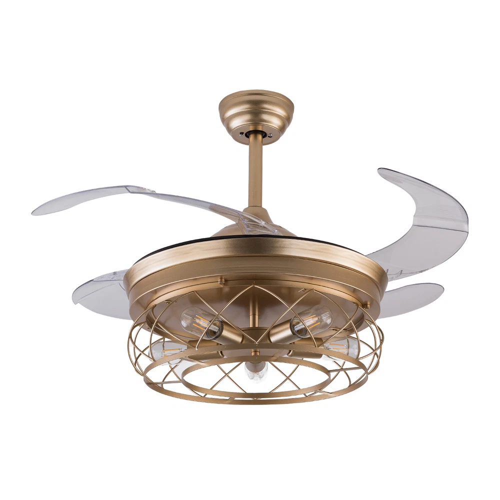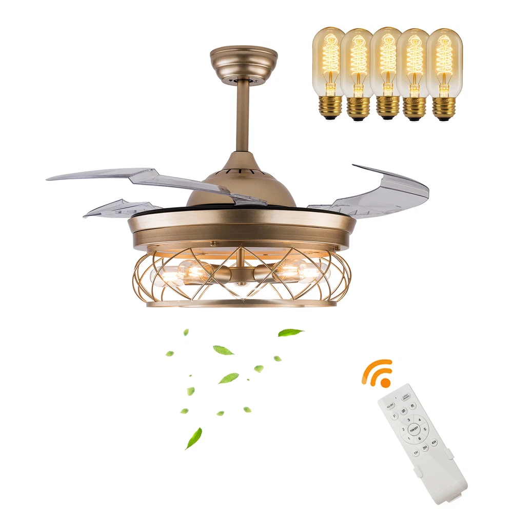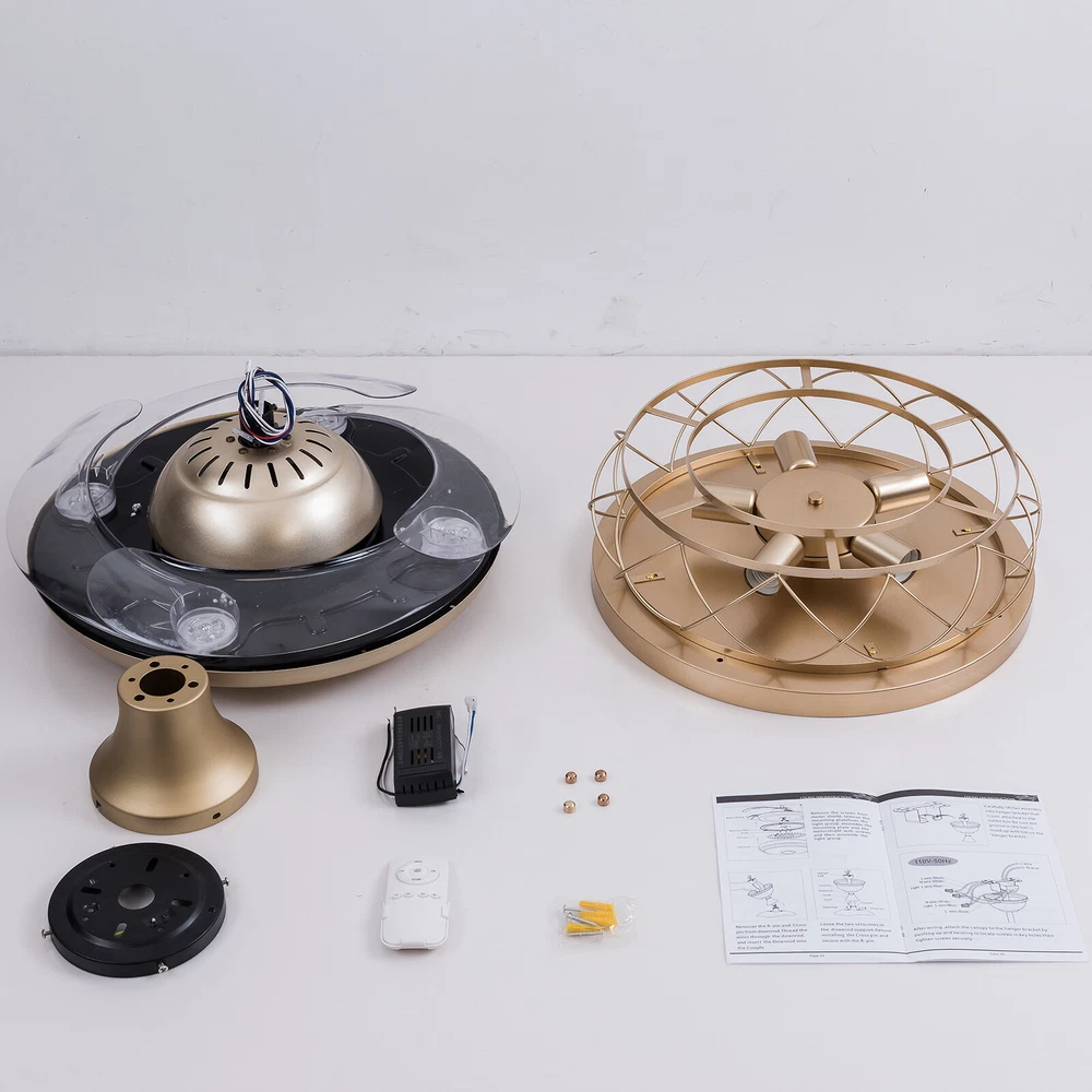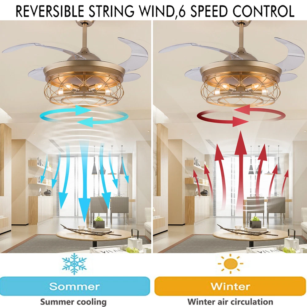 Gold Caged Ceiling Fan Light Farmhouse Chandelier Fan Pedant Lamp Remote Control Description This unique light fixture adds a gorgeous style to any room. It blends well with the theme of the room, which adds a beautiful visual appeal that only this light can create. The high power motor and it can illuminate an area of 107.64-215.28sq.ft after installing 5 bulbs. It is not only a luminaire but also a beautiful decorative piece. Key Features High-quality Material: This product is made of high-quality iron and ABS, and the surface has been baked with a paint process. It has the characteristics of anti-corrosion , anti-rust , and high hardness, which can effectively extend the service life of the product. Two Hight Options: Two different lengths of down rods (4.8ft and 9.8ft) are available between 8.86-9.84ft floor heights. You can choose the height of the down rod according to the room layout and floor height for greater adaptability. Powerful and Comfortable Lighting: 5 E26 lamp holders provide powerful lighting (107.64-215.28sq.ft). The non-visible strobe makes the light more delicate and comfortable, and will not be harsh to the eyes. Stylish Appearance: The simple gold hollowed out shade brings a vintage and industrial look to your home. When the fan is turned off, the fan blades will retract to give you a modern aesthetic. Smart Remote Control: The remote control is so simple to operate that even the elderly and children can easily operate it. It also allows you to regulate the fan, light, and timing (1H/2H/4H) as you like. Two-way Rotation: The normal mode of the fan can bring coolness in summer, while the winter reverse mode can be combined with heating to press down the warm air and increase the air convection rate, creating a 360-degree ambient heating flow. Quiet and Energy Efficient: Inverter motor has low noise(≤32db), and power consumption is about 30% of ordinary motor, which is more energy-saving . 6-speed Wind Adjustment: The ceiling fan has a 6-speed wind adjustment.1~2 gears for sleep wind, soft and soothing; 3~4 gears for comfortable wind; 5~6 gears for strong wind, can effectively drive away the sweltering heat. High Security: The 5.9 inches iron ceiling cover can hold the weight of the lamp more stably, thus better protecting you and your family. Ideal Gift: This product is stylish and high-quality and can be used as a gift for parents, friends, and loved ones, or as a housewarming, birthday, and holiday gift. Details E26 Lamp Head: It can match any E26 bulb and is easy to purchase and replace. ABS Transparent Fan Blade: High-quality ABS material is dirt-resistant and easy to clean, which can be cleaned by gently wiping with a wet rag. Application You can install this unique luminaire on different occasions, such as home, hotel, coffee shop, bar, bookstore, etc. It has a lighting area of 107.64-215.28sq.ft. Specification Material: Iron, ABS Color: Gold Process: Baking Paint Style: Modern Model: YX191 Assembly Required: Yes Mounting Type: Downrod Mount Electric Fan Design: Ceiling Fan Indoor/Outdoor Usage: Indoor Control Mode: Remote Control ( Available to Control Light, Fan, and Timer) Noise: ≤32db Voltage: AC110V Motor Power: 45W Timing Range: 1h, 2h, 4h Light Source: E26*5 ( Not Included ) Number of Speeds: 6 Number of Blades: 4 Applicable Floor Height: 2.7-3m/8.86-9.84ft Lighting Space: 10-20㎡/107.64-215.28sq.ft Base Diameter: 15cm/5.9in Down Rod Length: 12cm/4.8in, 25cm/9.8in Lampshade Size(φ*H):48*18cm/18.5*7.08in Total Height: 45cm/17.71in, 58cm/22.83in Total Diameter (With Fan Blade Open): 107cm/42in Package Included 1 * Retractable Ceiling Fan 1 * Remote Control (2*AAA Battery, Included) 1 * English Manual All Accessories for Installation Notes Please note that each bulb power matched with the product cannot exceed 18W. This product is not waterproof , please install it in a dry environment. Please disconnect the power and wipe with a soft, dry cloth before cleaning the shade or fixture. This product is not dimmable. This product does not contain light sources, please purchase your own. Please allow the slight color difference caused by the shooting light and the 1-3 cm error due to manual measurement, and make sure you do not mind before ordering. Payment Delivery details Terms of sales About us Contact us Payment We accept ebay payment 。 Fees such as import duties, taxes are not included in the item price or shipping costs. These charges are the buyer's responsibility. Delivery details Shipping: 2-9 working days to: USA Terms of sales We maintain high standards of excellence and strive for hundred percent customer satisfaction. Feedback is very important to us. We hope that you contact us immediately before you give neutral or negative feedback, so that we can address your concerns. It is impossible to address issues if we do not know about them! About us Your satis faction is our ultimate goal. We work hard to earn your trust and future business. Our certified technicians have tested each item before shipping. The unit comes with 1 year limited warranty on all manufacturing defects. a) If you receive a defective item, you may return it or ask for a discount. Please contact us within 14 days after you receive the package. b) What you returned must be intact and in its original packaging as re? u. Customer is responsible for shipping costs of the returned item. c) We will cover the cost of shipping back t with the shipping rate indicated in the registration page. We will send you a new unit or refund the full payment you paid. Thank you. Contact us Business Hour Business Hour: Monday To Friday: 8:30 AM to 5:00 PM (Beijing China time) Due to time zones, our reply to your questions may not be immediately. But within above working time, we will reply your email within 24 hours. If it's non-workdays, please kindly be patient and wait till Monday. Please contact us with ebay message. Please feel free to contact us if you have any questions. Monday To Frida