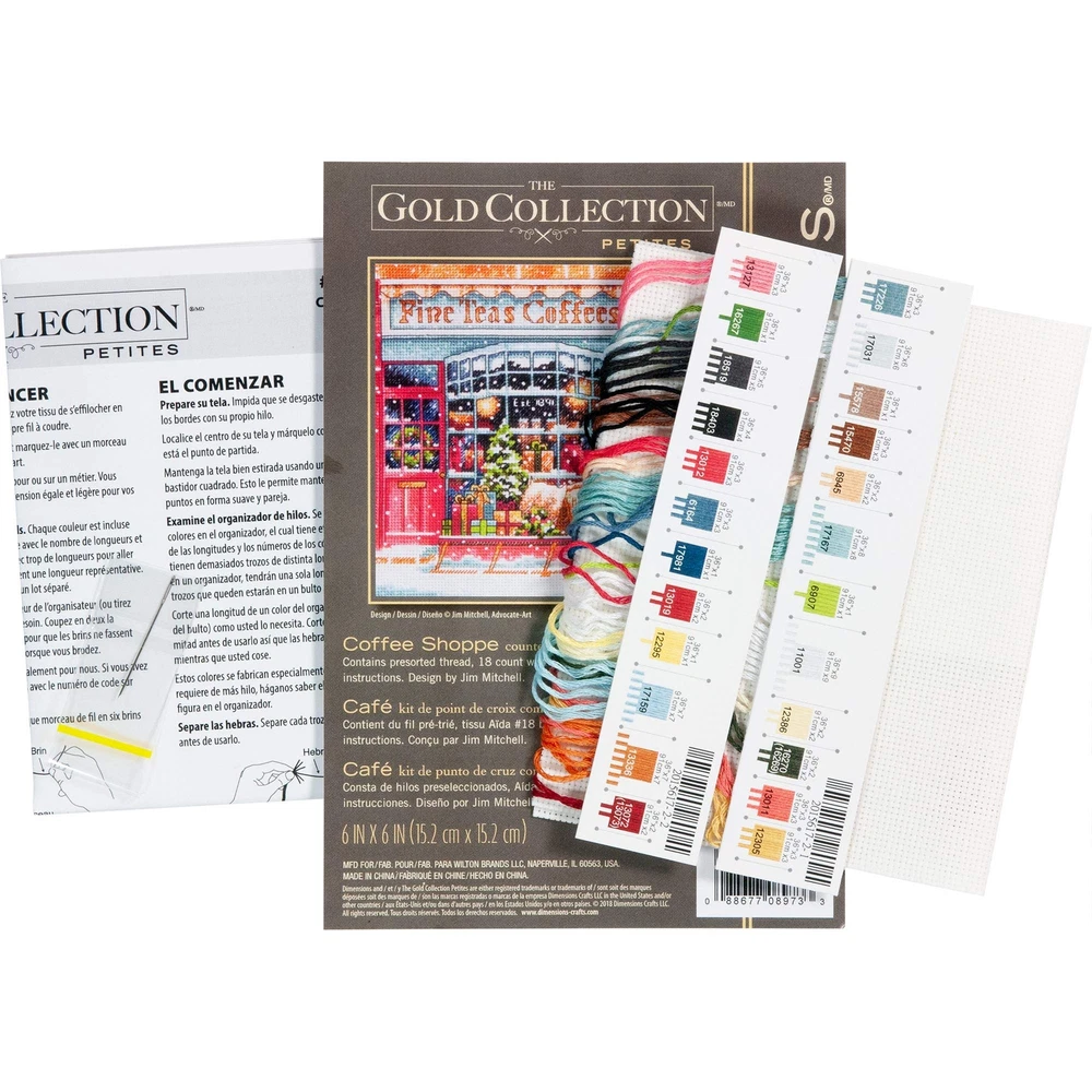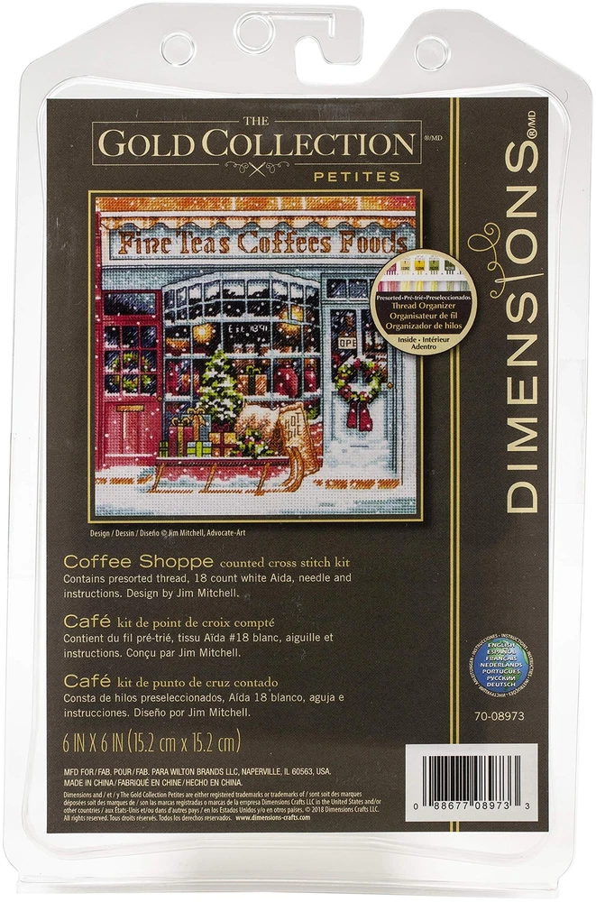 This Gold Petite Collection 'Coffee Shoppe' Counted Cross Stitch Kit serves as a challenging project for experienced needlecrafters and a stunning decoration that's sure to impress. This advanced cross stitch pattern features a beautiful store front that reads '' Fine Teas-Coffees-Food.'' You can see through the window panes, various boxes and wrapped gifts along with a sleigh filled with wrapped presents parked in the front. The beautiful details of this store front give a nostalgic feel of the holidays. Includes presorted thread, 18 count white Aida, (1) needle, and complete instructions. Small cross stitch patter measures 6'' x 6'' when complete. Includes presorted thread, 18 count white Aida, (1) needle, and complete instructions. When finished, small cross stitch pattern measures 6'' x 6'' The Gold Petite Collection advanced cross stitch kit features a beautiful store front that reads ''Fine Teas Coffees Food.'' You can see through the window panes, where various boxes and wrapped gifts rest along with a sleigh filled with wrapped presents parked out front. Cross stitch frame is not included in this embroidery kit.