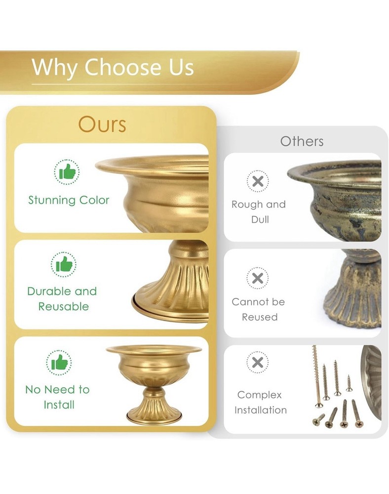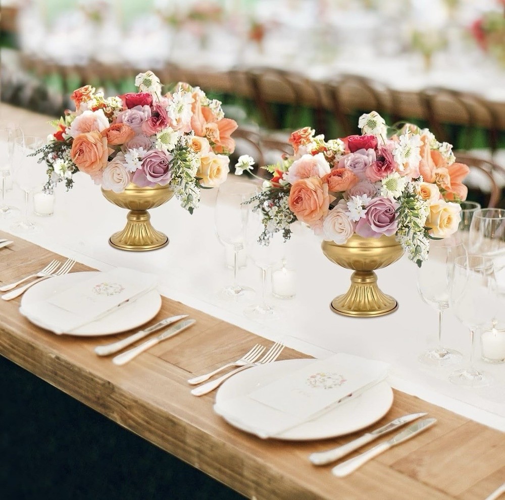 The Gold Compote Vases for Centerpieces are elegant and stylish flower vases perfect for a variety of occasions such as weddings, events, birthdays, anniversaries, and Christmas. Each vase stands at 6.5 inches tall and comes in a set of two, making them ideal for use as table centerpieces in the dining room, living room, or bedroom. With a classic European style and a matte finish, these vases add a touch of sophistication to any home décor. The gold color and floral pattern make them a timeless and chic addition to any space.