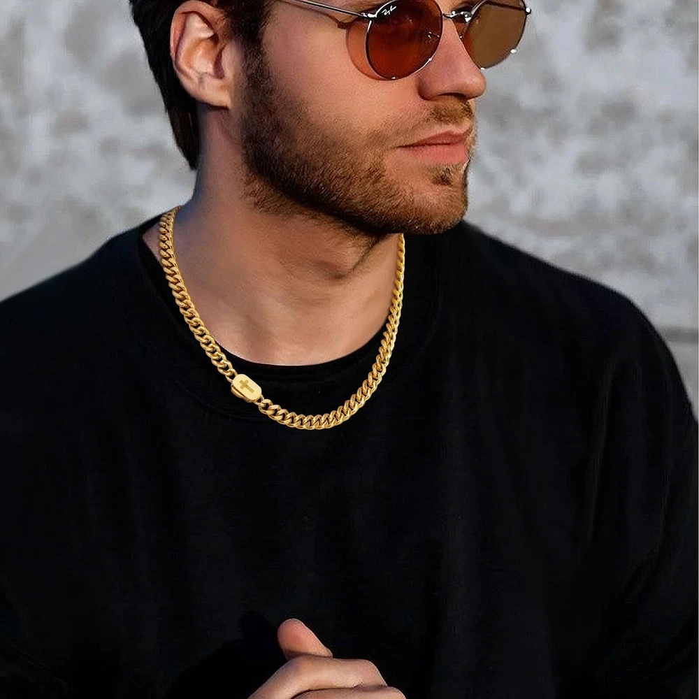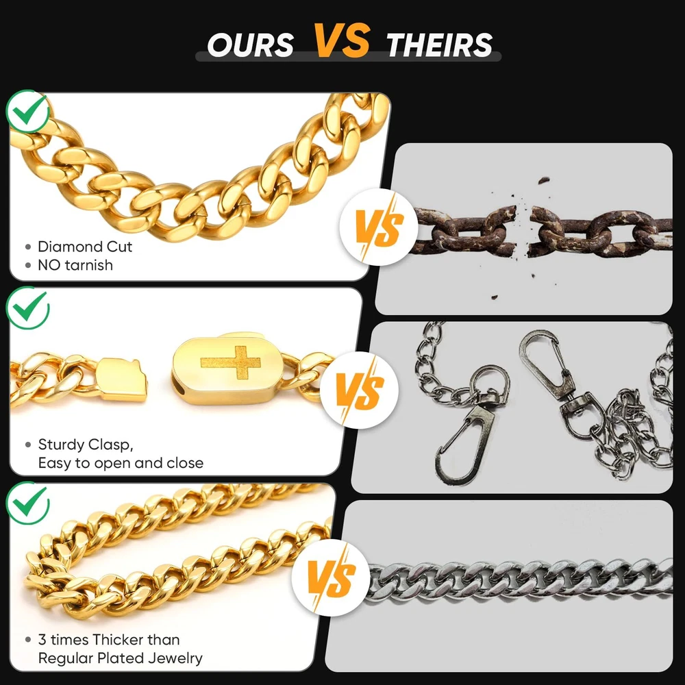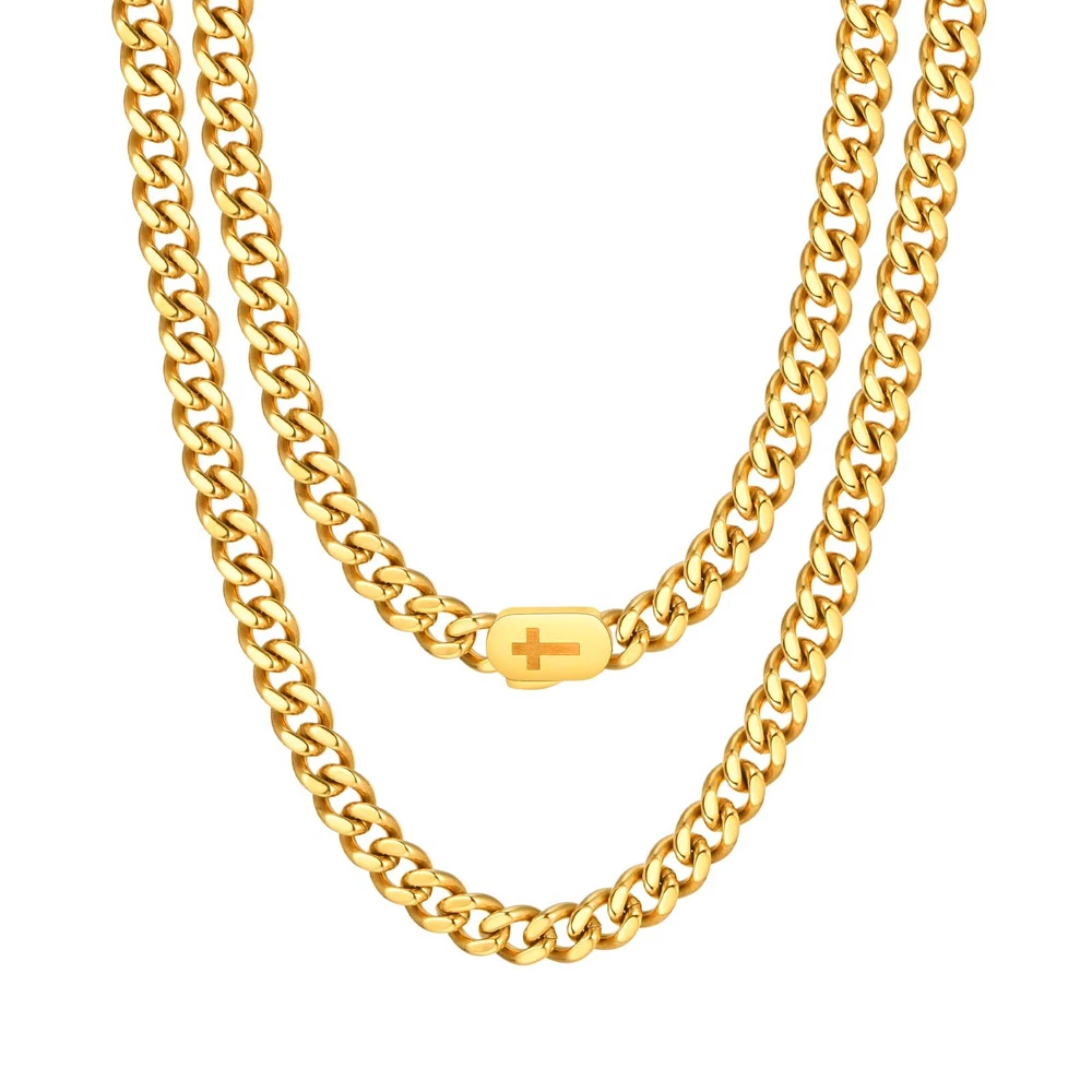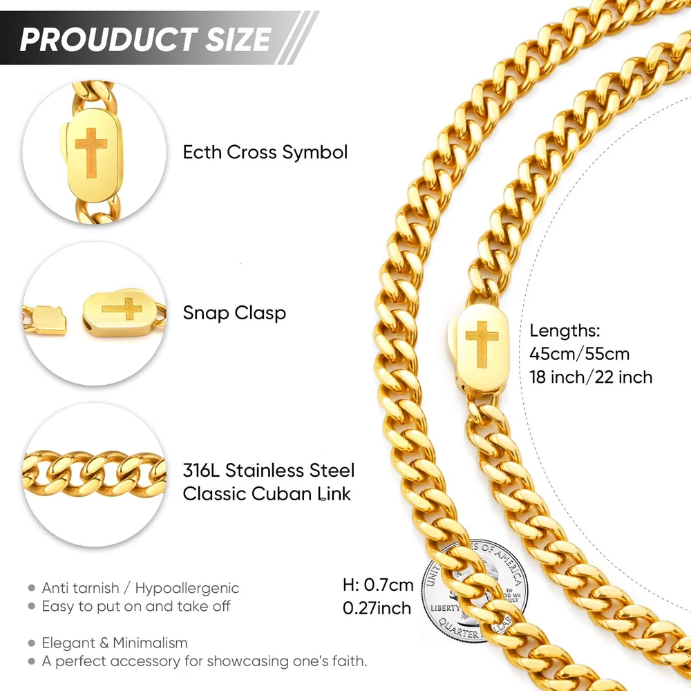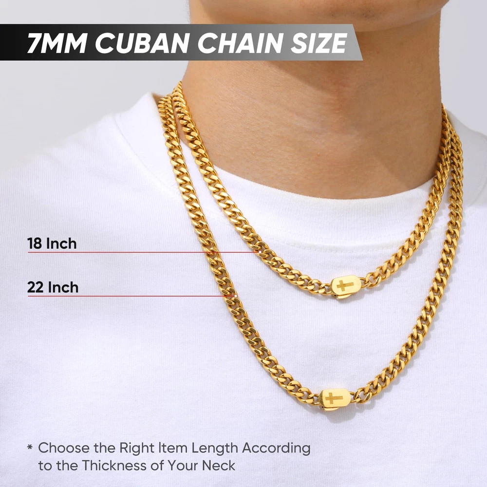 Cross Chain for Men: stainless steel chains for men crafted with high-quality craftsmanship, this Cuban chain features a robust design and a convenient special Snap Hook. Perfect for adding a touch of hip-hop flair to your outfit. Size : Available in 7mm in width and 20/24 inches in length, this silver/ gold plated stainless steel chain is a versatile accessory for men. Thick Stainless Steel Chain for Men: Made of sturdy 316L stainless steel and etch with a corrosion-resistant cross symbol, this 7MM chain is both durable and hypoallergenic, making it safe and comfortable for all skin types. Jewelry Gift for Men : Surprise your loved ones with this unique gift on Father’s Day, birthdays, Christmas, or any special occasion. This Cuban link chain is the perfect accessory for any casual day or special event. Warranty & Promise : Enjoy peace of mind with our 24-hour customer service and 90-day money-back guarantee. Shop confidently and upgrade your accessory game with this Men's Gold Cuban Link Chain.