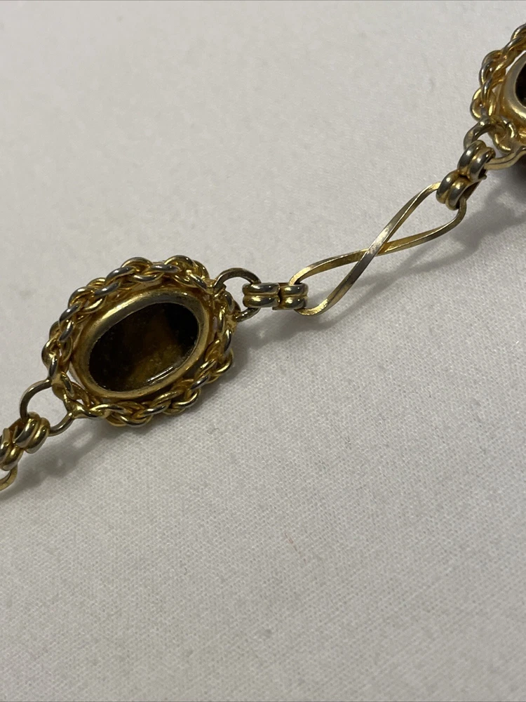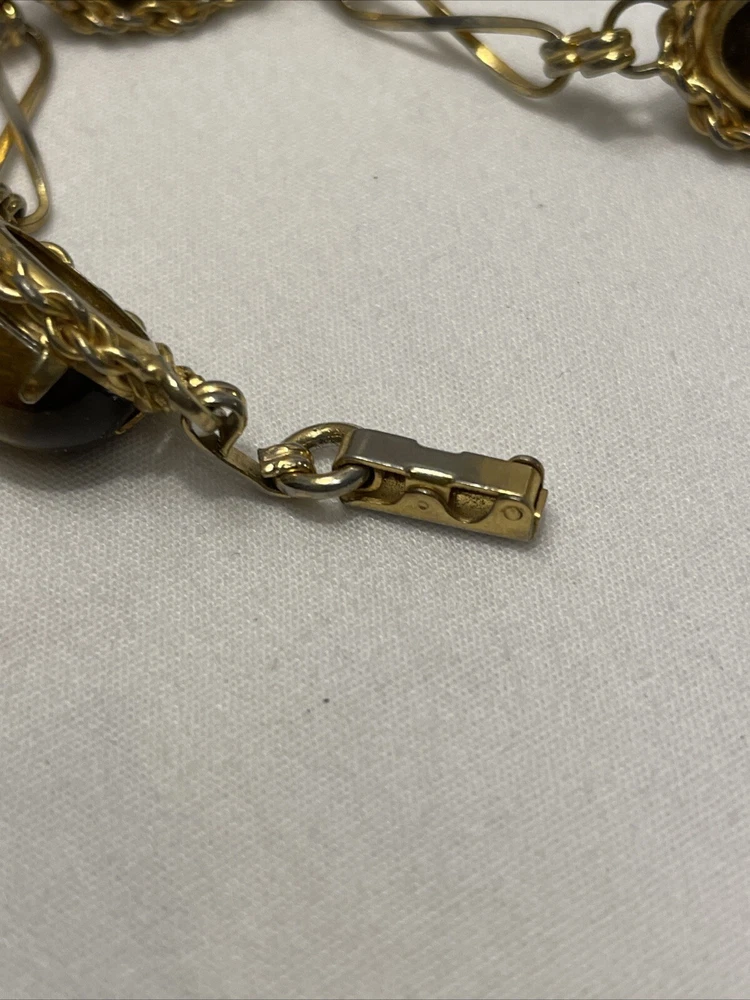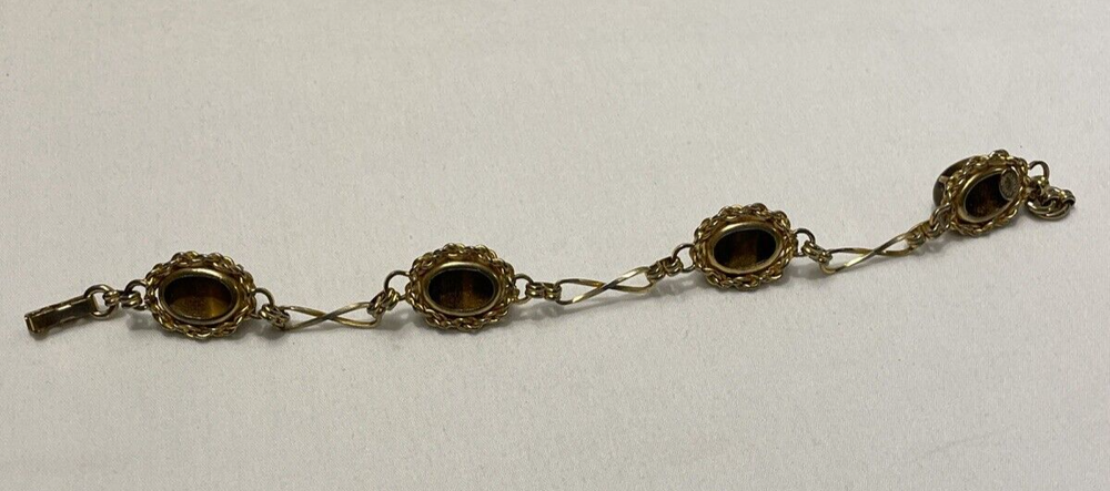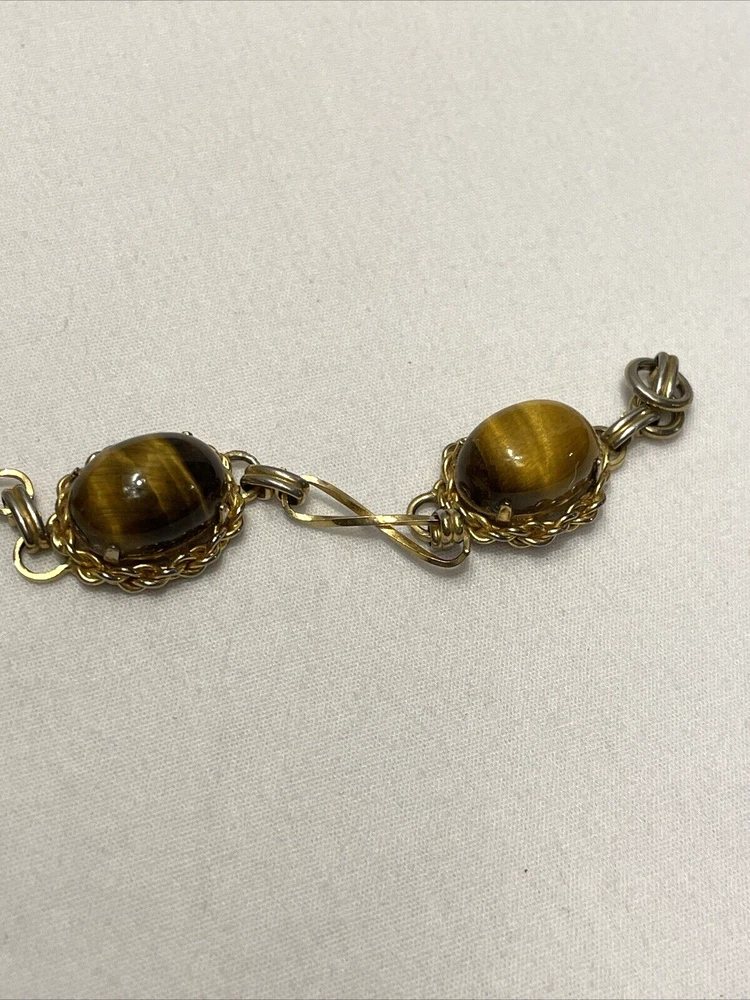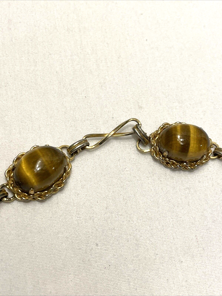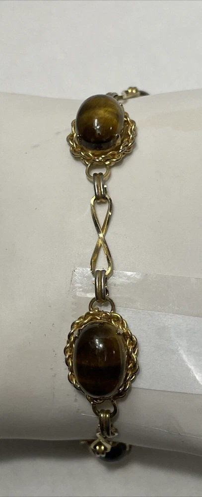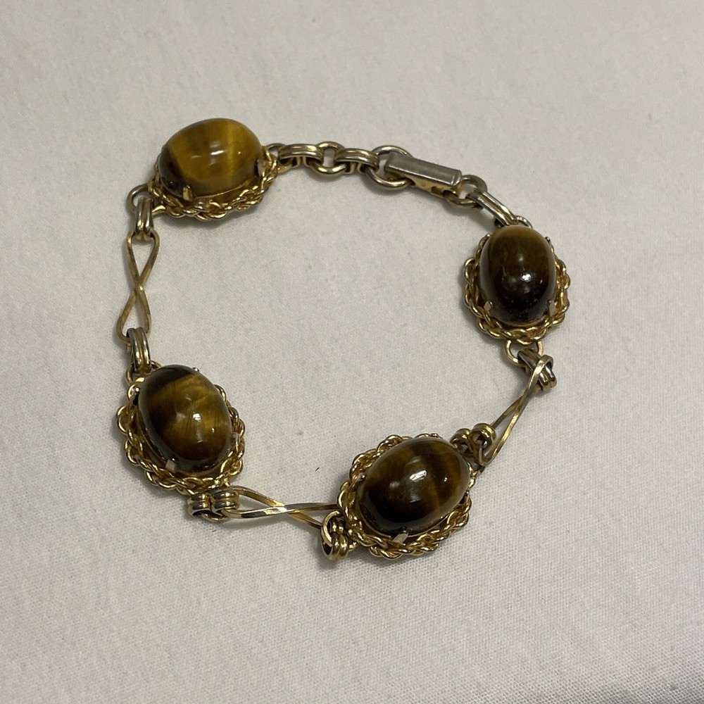 Add a touch of elegance to your outfit with this beautiful gold-filled bracelet. The bracelet features four stunning tiger's eye gemstones, with a fold-over closure for easy wear. Measuring 7.3 inches in length, this bracelet is perfect for any occasion, from birthdays to anniversaries, and is sure to make a statement. Crafted with care, this bracelet is a unique and original piece of jewelry that will make a wonderful addition to your collection. The oval-shaped gemstones are set in a prong style, and the bracelet is made with a 20/2 metal purity. This vintage piece is a true beauty, and it is sure to catch the eye of anyone who sees it. In excellent condition.