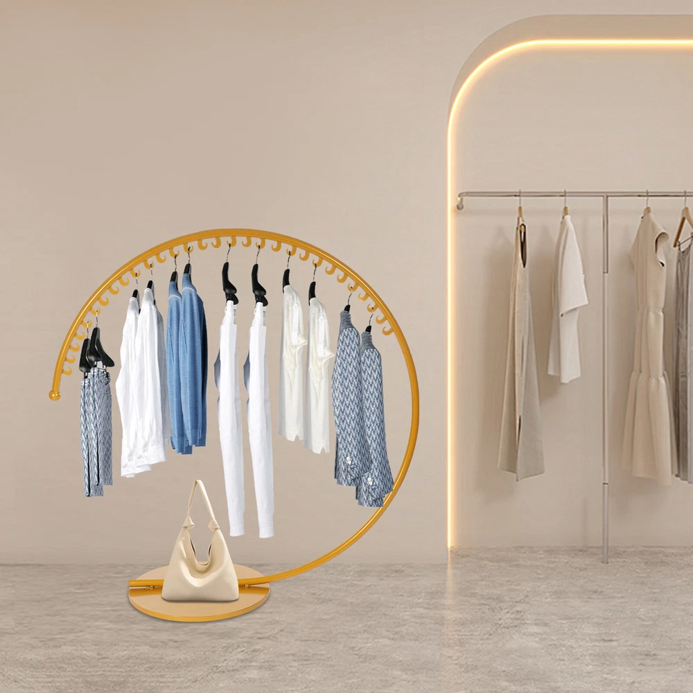 Gold Freestanding Clothing Display Rack Modern Coat Rack W/ 30 Moon-shaped Hooks Welcome to our store~ Description The coat rack measuring an ample 59.05in in height, is a testament to elegant functionality and durability designed for spaces demanding both style and practicality. Crafted with meticulous attention to detail, this freestanding coat rack not only serves as a clothes rack but also stands as a modern decoration that effortlessly complements any setting, from the sophistication of a boutique to the warmth of a modern household. Key Features Sturdy and Durable: This product is made of high-quality iron with a high-temperature baking paint process, which has good wear resistance , rust resistance , and a long service life. Fashionable Style: The C-shaped exterior design, classic gold color, and full, even, vibrant hue make this stylish and elegant product pair well with your furniture style. Strong Load-bearing Capacity: The solid construction, thickened base, and strong connection between the parts make this product withstand a heavy load of 551.15 lbs , you can store your daily clothes with confidence. Large Capacity: The 30 moon-shaped hooks are enough for your daily storage needs to avoid stacking your clothes, making it easier to place and access items. Moreover, the round base can hold shoes (not included), giving you more organized storage. Multi-function: This product can be used as a display rack, storage rack, or drying rack. You can not only hang skirts, pants, jackets, shirts but also bags, hats, scarves, towels and ties. It is suitable for a variety of scenes and needs. Suitable Height: It is high enough (59.05in) to prevent most clothes from touching the floor or getting dirty, so you can hang your pants, long skirts, jackets (not included), etc. with confidence. Simple Installation: The simple structure and complete accessories allow even novice installers to install it quickly and accurately. Easy to Clean: Thanks to the smooth surface, simple structure, and open design, you can easily wipe off the dirt on it with a soft cloth (not included). Ideal Gift: With a beautiful appearance and good performance, it would be a wonderful surprise for your wife, mother, daughter, friend, or loved ones. Details Sturdy Base: The round base (23.62 in) can stabilize this product well and prevent it from tipping over. Smooth Edges: The smooth edges not only add to the aesthetics of the product but also improve the safety of use. Application It can be used to hang jackets, scarves, hats, school bags, handbags, purses, suits, costumes, place shoes, and so on. It is suitable for retail stores, boutiques, children's stores, clothing stores, dormitories, bedrooms, living rooms, entrances, children's rooms, laundry rooms, apartments, hotels, dormitories, studios, dance studios, and other places. It can be used as a display rack, storage rack, or drying rack. Specifications Color: Gold Style: Modern Material: Iron Shape: C-shape Process: High-temperature Baking Paint Assembly Required: Yes Mounting Type: Free Standing Recommended Uses For Product: Clothes Total Load Capacity: 250kg/ 551.15 lbs Number of Hooks: 30 Product Size(D*H): 1.5*1.5m/ 4.92 ft Base Diameter: 60cm/ 23.62in Package Size: 155*65*7.5cm/61.02*25.59*2.95in Gross Weight: 8kg/17.64lbs Net Weight: 7.5kg/16.53lbs Package Included 1* Coat Rack 4* Screws Notes Please note that this product does not include any clothes. Please check the size carefully before ordering. Please do not expose the product to direct sunlight for extended periods of use. Please do not touch the product with sharp items. Please allow the slight color difference caused by the shooting light and 1-3cm error due to manual measurement, and make sure you do not mind before you order. Payment Delivery details Terms of sales About us Contact us Payment We accept ebay payment 。 Fees such as import duties, taxes are not included in the item price or shipping costs. These charges are the buyer's responsibility. Delivery details Shipping: 2-9 working days to: USA Terms of sales We maintain high standards of excellence and strive for hundred percent customer satisfaction. Feedback is very important to us. We hope that you contact us immediately before you give neutral or negative feedback, so that we can address your concerns. It is impossible to address issues if we do not know about them! About us Your satis faction is our ultimate goal. We work hard to earn your trust and future business. Our certified technicians have tested each item before shipping. The unit comes with 1 year limited warranty on all manufacturing defects. a) If you receive a defective item, you may return it or ask for a discount. Please contact us within 14 days after you receive the package. b) What you returned must be intact and in its original packaging as re? u. Customer is responsible for shipping costs of the returned item. c) We will cover the cost of shipping back t with the shipping rate indicated in the registration page. We will send you a new unit or refund the full payment you paid. Thank you. Contact us Business Hour Business Hour: Monday To Friday: 8:30 AM to 5:00 PM (Beijing China time) Due to time zones, our reply to your questions may not be immediately. But within above working time, we will reply your email within 24 hours. If it's non-workdays, please kindly be patient and wait till Monday. Please contact us with ebay message. Please feel free to contact us if you have any questions. Monday To Friday: 8:30 AM to 5:00 PM (Beijing China time) Due to time zones, our reply to your questions may not be immediately. But within above working time, we will reply your email within 24 hours. If it's non-workdays, please kindly be patient and wait till Monday. Please contact us with ebay message. Please feel free to contact us if you have any questions. Highlights Long service life, stable performance, High quality W/ warranty! Warranty 3-year Warranty Features Nice and Practi