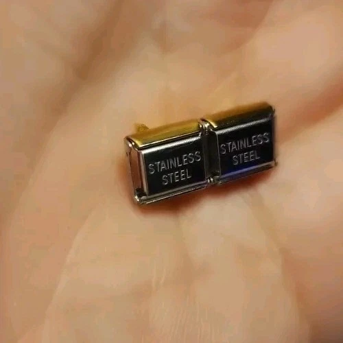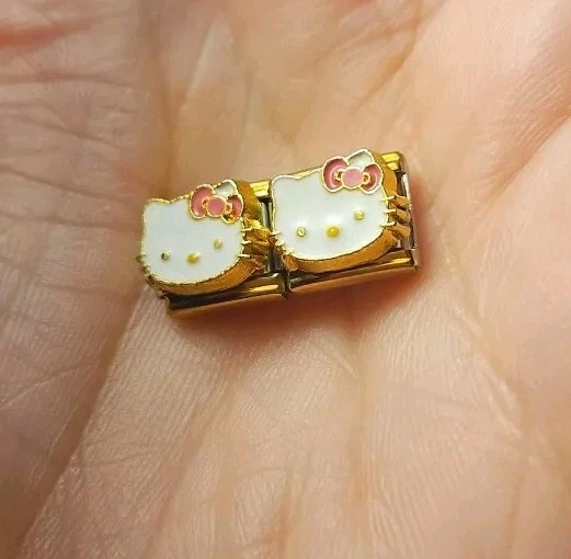 Hello Kitty Italian Charm gold trim. These silver color gold trim links are designed with 3d metal and enamel charms. The links are adjustable and can be connected to form a unique and fun bracelet. Perfect for any occasion, these charm links are suitable for gifts, Christmas, graduation, anniversary, birthday, engagement, Mother's Day, holiday, Father's Day, christening, confirmation/communion, Valentine's Day, or just because. The multicolor charms are made of stainless steel and enamel, and they are compatible with any 9MM setting style. Get your hands on these Italian charm links and add a touch of fun to your jewelry collection today!