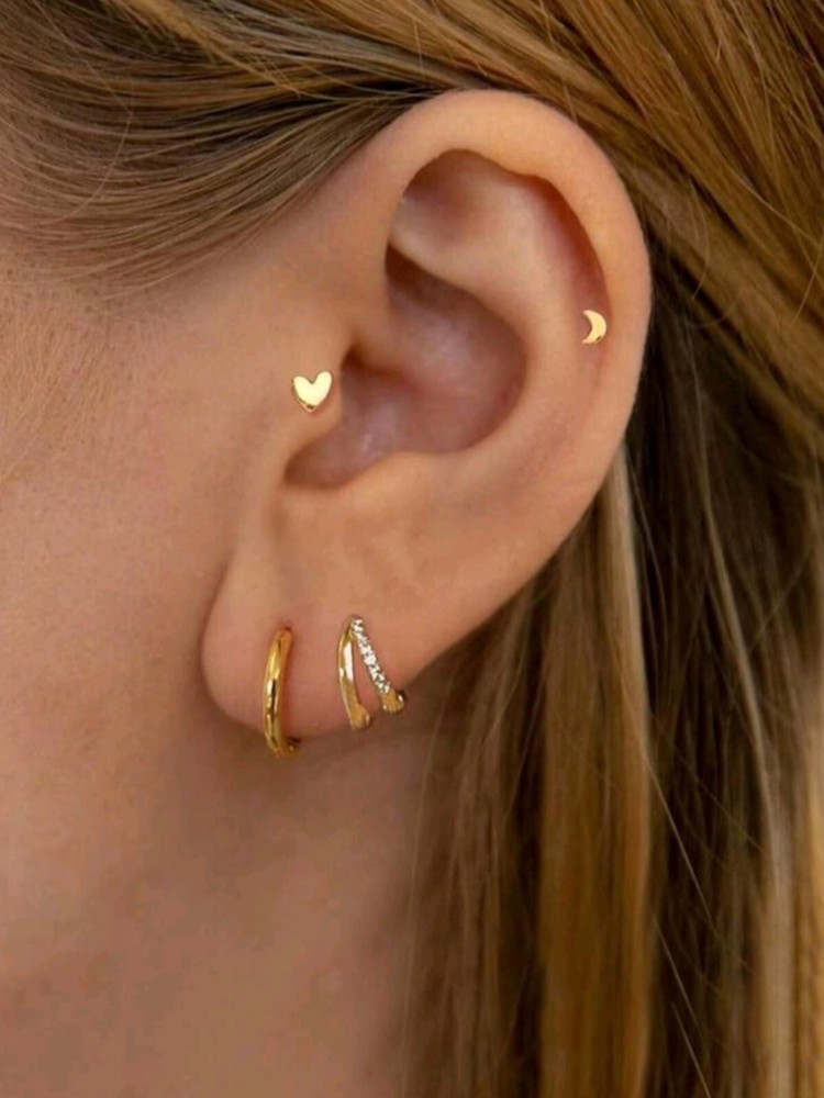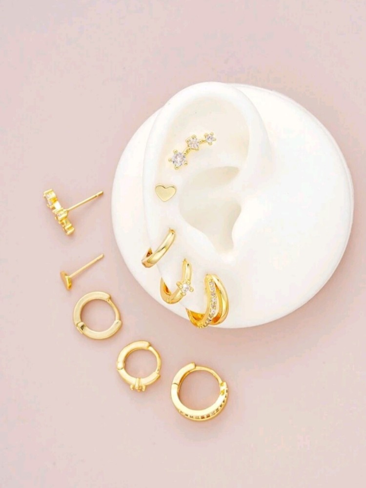 Unlock a treasure trove of versatility with this 6-pair earring set, designed to add effortless elegance to any look. Crafted with precision and 18K gold plating, this set is a playground for the adventurous spirit of women who love to mix and match. Why You’ll Adore Them: ✨ Golden Hugs for Your Ears: Featuring trendy huggie hoop earrings that embrace your lobes with timeless charm. ✨ Double the Drama: Bold double hoop earrings to amplify your style and spark conversations. ✨ A Touch of Magic: Delicate moon and butterfly stud earrings that whisper celestial stories of beauty. ✨ Cubic Zirconia Brilliance: Shimmering stones that rival starlight, adding the perfect dose of sparkle. Perfect for multiple piercings, these earrings are a dream come true for curating your ear stack. Wear them solo for a minimalist vibe or layer them up to make a bold statement. Whether you’re dressing for work, a casual outing, or a romantic evening, this set has you covered. Gift the Glow: Ideal for birthdays, anniversaries, or just because – give the gift of endless style options! Add this 6-pair earring set to your collection and let your inner stylist shine. Each pair isn’t just jewelry—it’s a golden opportunity to express YOU.