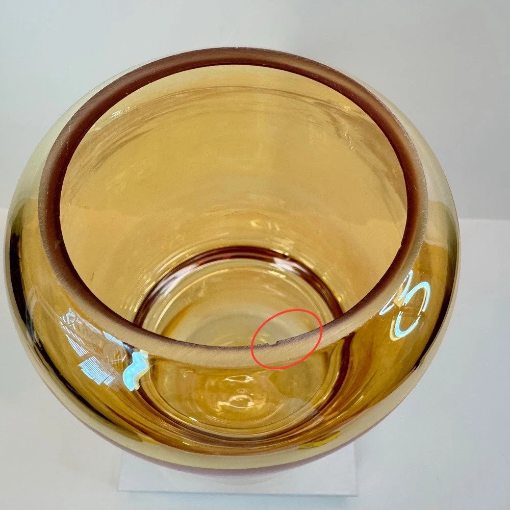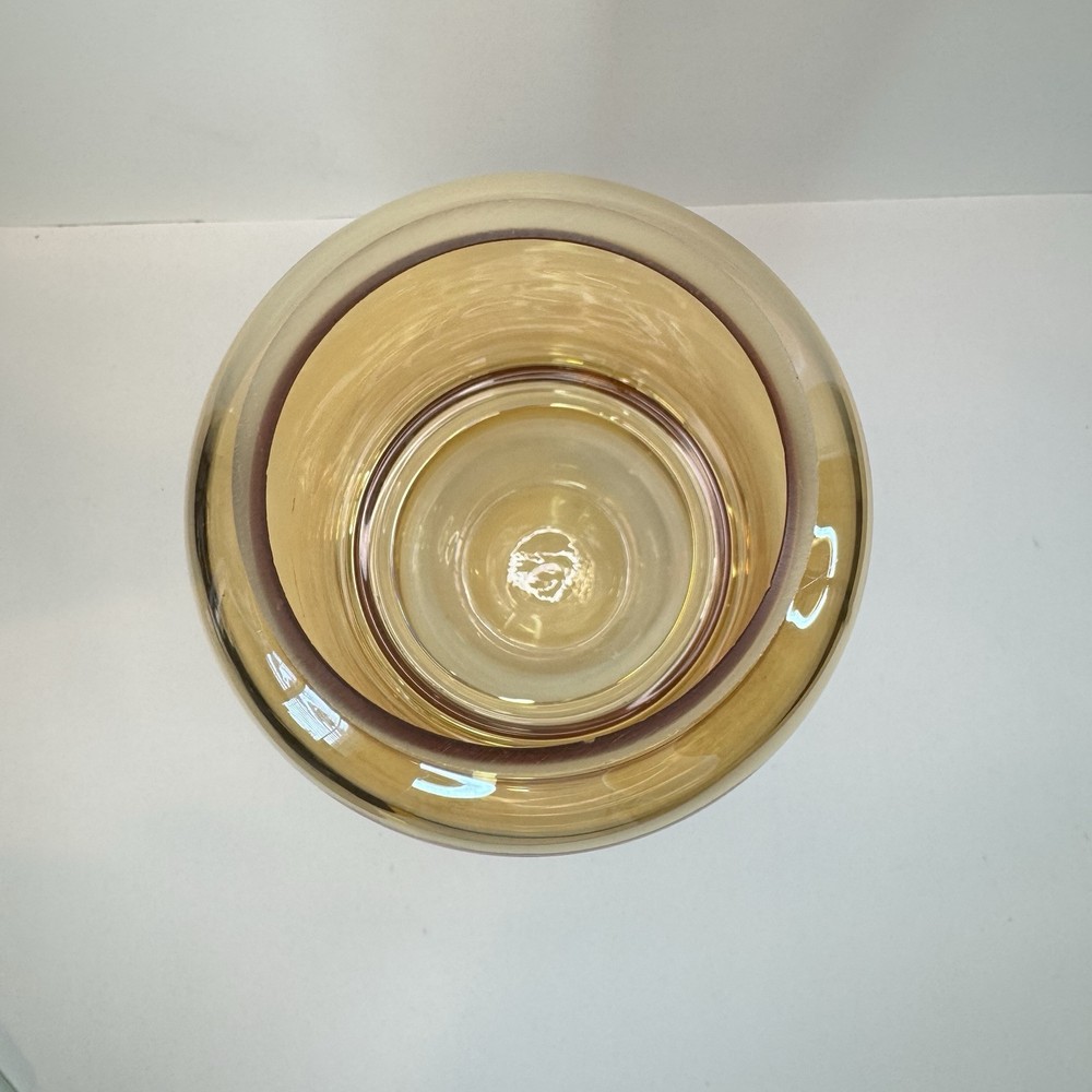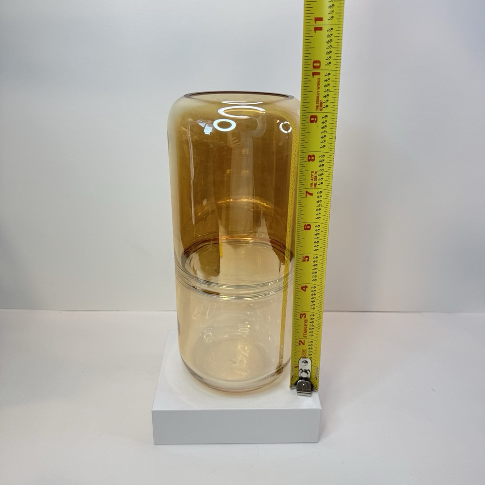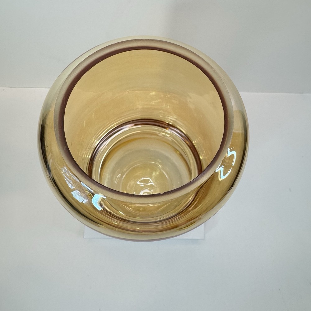 Add a touch of elegance to any room with this stunning gold iridescent pill-shaped glass vase. The oval shape and solid pattern make it a unique addition to your home decor, while the 9.5" length and 4" width provide ample space for your favorite flowers or decor. Crafted from high-quality glass, this vase is easy to clean with a damp cloth or spirit. Hand wash only to keep it looking its best. Its pop art style and flower vase type make it a perfect statement piece for any room. This vase is suitable for adults and does not require any additional parts to use. Good used condition. There is a small “flea bite” chip in the opening. Please see photos for details.