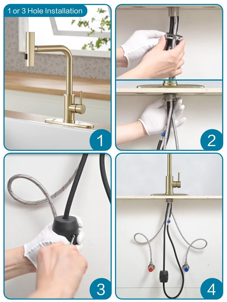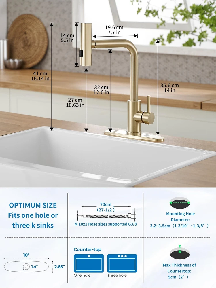 Gold Kitchen Faucets with Pull Down Sprayer,Waterfall Kitchen Sink Faucet,Commercial Utility Stainless Steel Kitchen Faucets,Single Handle Kitchen Sink Faucet with Pull Down Sprayer for 3 Function Product Details Color: Matte Gold Style: Waterfall Brand: JOOM MPN: JU011G01 UPC: Does not apply EAN: Does not apply Brand: JOOM Recommended Uses For Product: Kitchen Mounting Type: Deck Mount Finish Type: Lacquered Material: Stainless Steel Color: Matte Gold Number of Handles: 1 Included Components: Sprayer Hole Count: 1 Special Feature: Pull Down Sprayer Brand: JOOM Recommended Uses For Product: Kitchen Mounting Type: Deck Mount Finish Type: Lacquered Material: Stainless Steel Color: Matte Gold Number of Handles: 1 Included Components: Sprayer Hole Count: 1 Special Feature: Pull Down Sprayer Handle Type: Lever Style: Waterfall Installation Type: Single Hole Model Name: JU011-12 Handle Material: Stainless Steel Warranty Type: limited Handle Location: Center Spout Design: Waterfall Is Electric: No Manufacturer: JOOM Product Dimensions: 3.2"D x 9.5"W x 18"H Part Number: JU011G01 Item Weight: 3.63 pounds Country of Origin: China Item model number: JU011-12 Finish: Lacquered Special Features: Pull Down Sprayer Batteries Included?: No Batteries Required?: No Date First Available: March 11, 2024 Powerful faucet sprayer:The JOOM Kitchen Faucet a robust wide spray to eliminate stubborn residues, a gentle aeratorstream for delicate fruit rinsing, and a sweeping spray for extensive coverage. Unmatched Flexibility:The Kitchen Faucet provides unparalleled flexibility with a 360 swivel spout and a retractable PEX hose. Single-Handed Control:The single-handle mechanism empowers you to control water temperature and flow volume with one hand. Free up the other hand for multitasking, transforming kitchen chores into fluid, time-efficient activities. Premium Craftsmanship:The waterfall kitchen faucet. Crafted from eco-friendly SUS 304 stainless steel, it resists corrosion and rust. No Plumbers Needed:Designed for your convenience, the faucet for the kitchen sink comes with a pre-attached deck plate and pre-installed hoses.