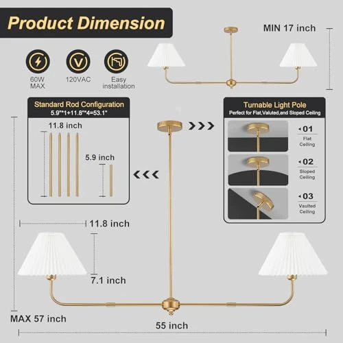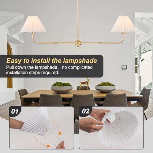 Return Policy Fast Delivery Trusted seller Gold Linear Chandelier, 2-Light Modern Chandelier for Dining Room Light Fixture, Dining Light Fixtures with White Fabric Shade Pendant Lights Kitchen Island for Restaurant, Living Room, Bedroom Product Description Pleated Fabric Design—This dining room chandelier showcases a matte black metal frame combined with pleated fabric lampshades. The construction of the fixture makes it resistant to rust and paint wear, ensuring both safety and long-lasting performance. The pleated fabric shades offer a warm and inviting atmosp, while protecting your eyes from intense light. Adjustable Height & Easy Installation—With a diameter of 55 inches and a canopy measuring 4.7 inches, our chandelier offers adjustable heights ranging from a minimum of 17 inches to a maximum of 57 inches to suit your needs. It is compatible with both sloped and flat ceilings. The gold chandelier is also straightforward to install; simply follow the provided instructions for a hassle-free assembly process. E26 Bulb Sockets & Dimmable—Featuring E26 bases, this gold chandelier light fixture is compatible with a range of bulb types, including incandescent, LED, CFL, and halogen. For adjustable brightness, it can be used with dimmable bulbs and dimmable switches. (Bulbs are not included.) Versatile Application: This dining room chandelier over table is perfect for various indoor settings, including the dining room, kitchen island, living room, over tables, entryways, restaurants, bedrooms, and hallways. Its design seamlessly combines traditional and modern elements, adding a warm and inviting ambiance to your home. After Sales Service--We are committed to providing customers with high quality products and good after-sales service, If you have any questions about this kitchen chandelier light fixture, please feel free to contact us,we will reply within 24 hours. Shipping Returns Payment Shipping Shipping is FREE to all addresses other than APO/PO boxes in the lower 48 states. All our stock ships from US-based warehouses. Shipped via USPS or UPS (depending on location and package weight) Unless stated otherwise, all orders will ship within 24-72 hours of your payment being processed. Check our feedback to see the great reviews of FAST shipping we offer. Returns Seller does not accept returns Payment We currently accept payment via eBay managed payments only. Once payment is cleared, we will dispatch your shipment within 1-3 business days. Please refer to the "Shipping" tab for more information regarding shipping speed to your destination.