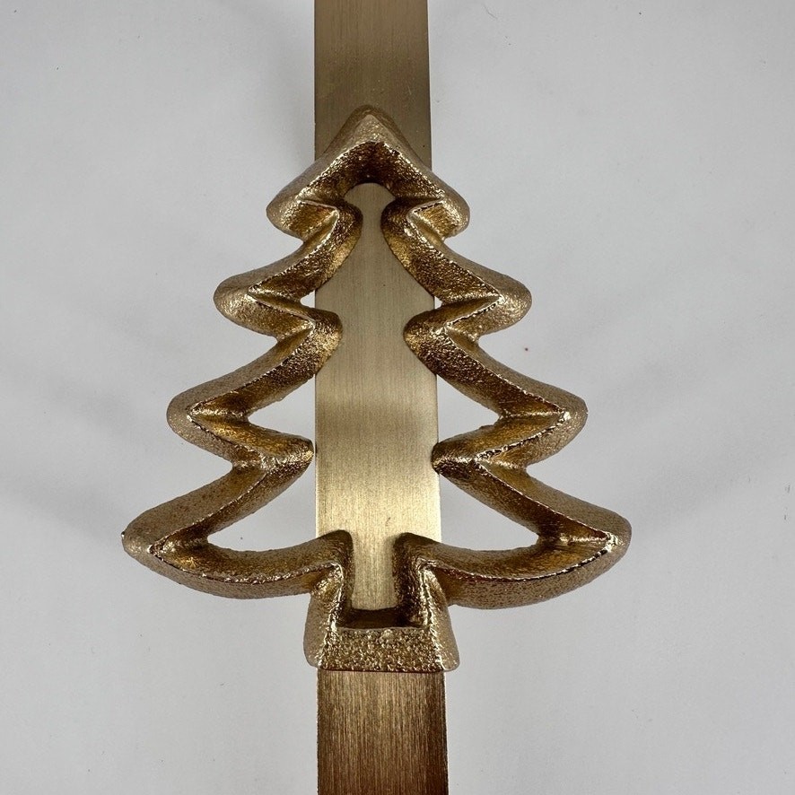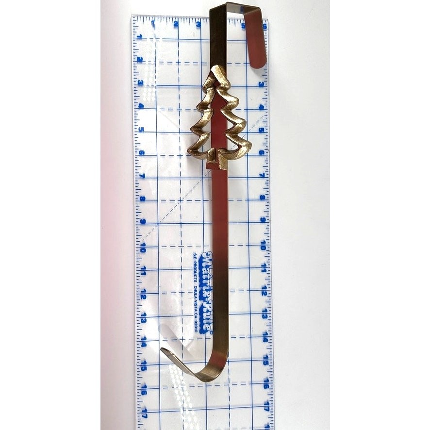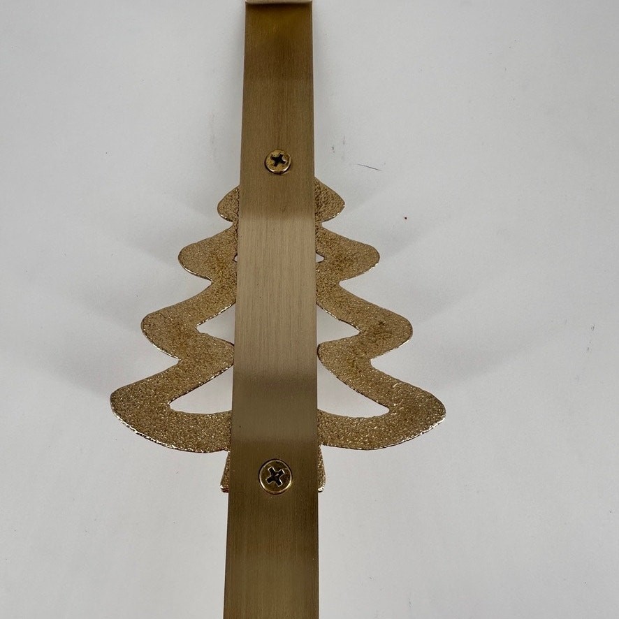 Add a festive touch to your front door this holiday season with this sturdy gold-tone metal wreath hanger featuring a dimensional Christmas tree design. This over-the-door hanger fits most standard doors and is great for holding wreaths, signs, or other holiday decorations. Textured metallic finish with a sculpted tree shape. Perfect for rustic, glam, or traditional holiday décor themes. Minor surface wear, no cracks or breaks. Please review pictures for details. Will wrap with bubble wrap and ship in a poly mailer to save shipping.