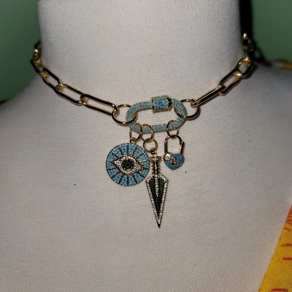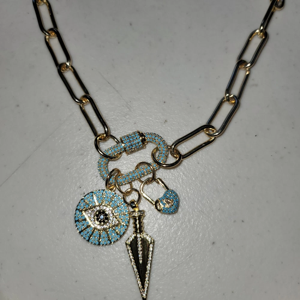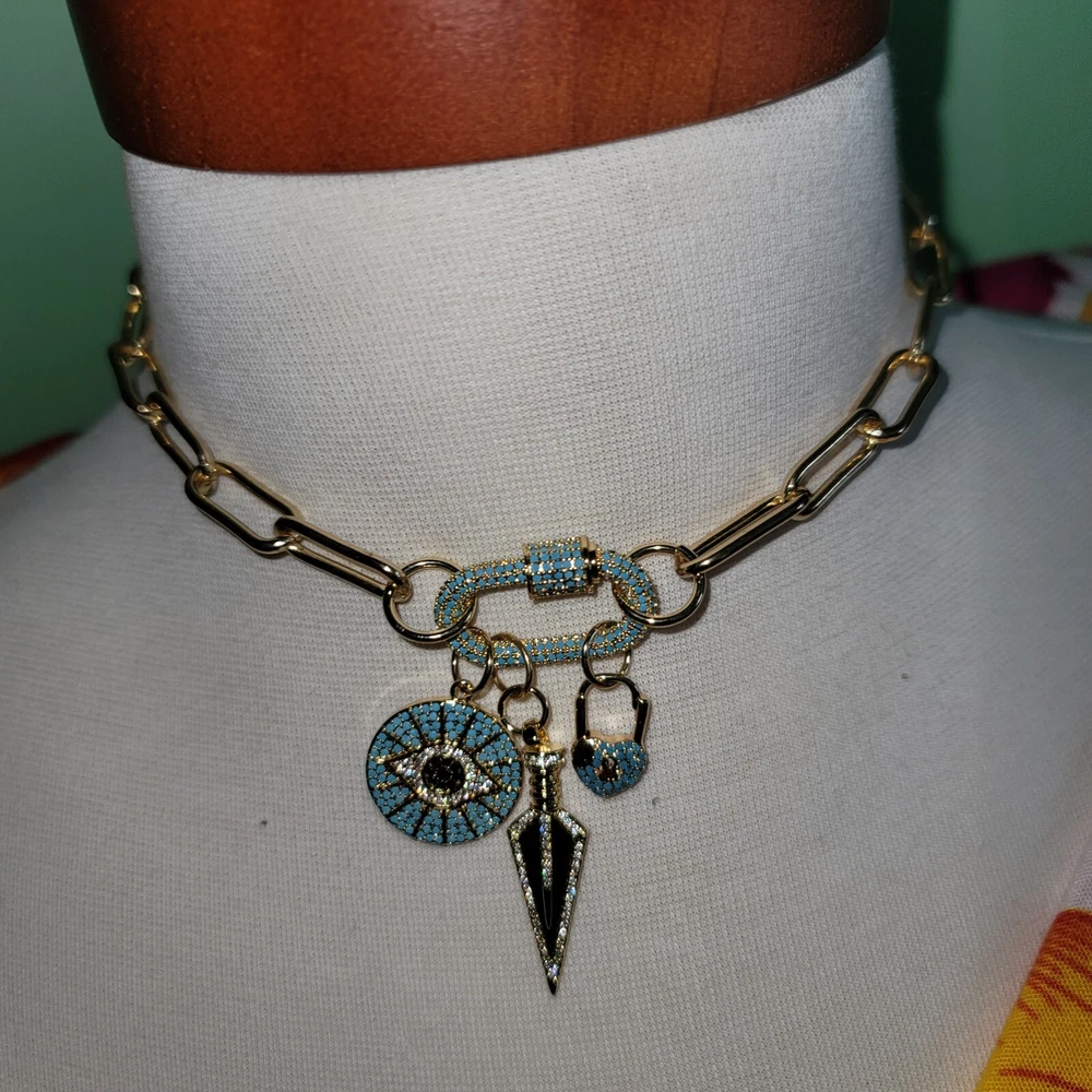 This Gold Paper Clip Crystal Carabiner Charm Necklace features an oval carabiner closure adorned with Aruba Blue Turquoise crystal charms. The necklace is 16 inches in length and made of brass plated metal. The unique design includes a stackable paper clip chain and is suitable for both men and women. With a statement, charm, and choker style, this piece encompasses themes of beauty, biker culture, love, bohemian vibes, ethnic influences, and hip hop fashion. It is a bold and eye-catching accessory perfect for adding a touch of personality to any outfit. Charms as photographed, metal, crystal and enamel. Brass gold plated. Please ask all questions prior to order. All sales are final. To open or close, spin barrel.