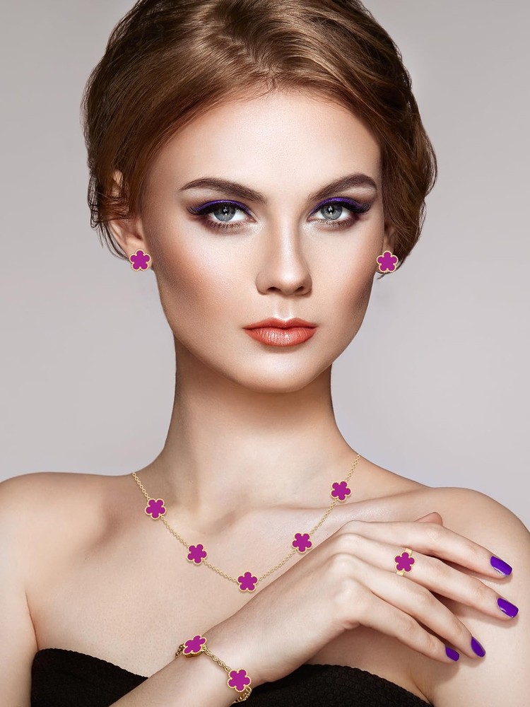 Gold Plated Five Leaf Clover Necklace Bracelet Rings and Stud Earrings Set for Women Lucky Flower Jewelry Product Details Color: Purple-14K Gold Plated Brand: Qinpan MPN: DZTZ1026 UPC: 737745261464 EAN: 0737745261464 Item Weight : 0.8 ounces Department : womens Date First Available : October 21, 2024 Manufacturer : QINPAN Brand, Seller, or Collection Name: Qinpan Material: Stainless Steel Gem Type: No Gemstone Item Length: 18 inches Chain: Link Chain Clasp: Lobster Clasp Ring size: 7.5 Number of stones: 13 Stone Weight: 13 cttw Metal: Yellow Gold Plated Stainless Steel Metal stamp: No Metal Stamp Metal Weight: 20 g Stone shape: Irregular Minimum clarity: Slightly Included Cut: Very Good Add endless sparkle to any special occasion with QINPAN's gorgeous necklace bracelet rings and stud set with plastic. Don't miss these set stunners, meticulously accented with inlaid chalcedony gems. These gleaming dangling necklace bracelet rings and earrings are surefire head-turners, whether worn for proms, bridesmaids, cocktail parties, mothers of the bride, holiday galas or with jeans and a sweater! We love the "dress up" or "dress down" versatility of these fashion dangle necklace earrings rings and bracelet set. Treat yourself or someone you love to some jewelry at a fabulous price. Caring For Your Jewelry: Our Jewelry are made of Genuine high-grade Material, as long as the proper maintenance, ensure wearing years still bright as new. They don't need to use very expensive maintenance water, just to avoid acid-base and moist environment.Perfume is also corrosive to jewelry. Humid conditions include: don't wear when shower, washing face, sweating, deposit before application of dry cloth to wipe dry.