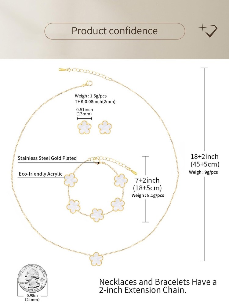 Gold Plated Five Leaf Clover Dot Necklace Bracelet and Stud Earrings Set for Women Lucky Flower Jewelry Product Details Color: White-14K Gold Plated Brand: Qinpan MPN: DZTZ1024 UPC: 737745260863 EAN: 0737745260863 Item Weight : 0.5 ounces Department : womens Date First Available : October 10, 2024 Manufacturer : QINPAN Brand, Seller, or Collection Name: Qinpan Material: Stainless Steel Gem Type: No Gemstone Item Length: 18 inches Chain: Link Chain Clasp: Lobster Clasp Number of stones: 8 Stone Weight: 10 cttw Metal: Yellow Gold Plated Stainless Steel Metal stamp: No Metal Stamp Metal Weight: 12 g Stone shape: Irregular Minimum clarity: Slightly Included Cut: Very Good Add endless sparkle to any special occasion with QINPAN's gorgeous necklace bracelet and earring stud set with plastic. Don't miss these set stunners, meticulously accented with inlaid chalcedony gems. These gleaming dangling necklace bracelet and earrings are surefire head-turners, whether worn for proms, bridesmaids, cocktail parties, mothers of the bride, holiday galas or with jeans and a sweater! We love the "dress up" or "dress down" versatility of these fashion dangle necklace earrings and bracelet set. Treat yourself or someone you love to some jewelry at a fabulous price. Caring For Your Jewelry: Our Jewelry are made of Genuine high-grade Material, as long as the proper maintenance, ensure wearing years still bright as new. They don't need to use very expensive maintenance water, just to avoid acid-base and moist environment.Perfume is also corrosive to jewelry. Humid conditions include: don't wear when shower, washing face, sweating, deposit before application of dry cloth to wipe dry.