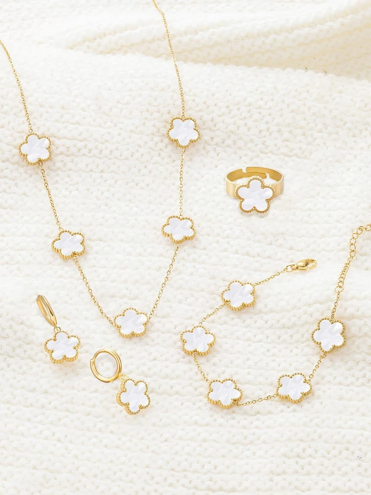 Gold Plated Five Leaf Clover Necklace Bracelet Rings and Dangle Earrings Set for Women Lucky Flower Jewelry Product Details Color: White-14K Gold Plated Brand: Qinpan MPN: DZTZ1032 UPC: 737745262072 EAN: 0737745262072 Item Weight : 0.85 ounces Department : womens Date First Available : October 22, 2024 Manufacturer : QINPAN Brand, Seller, or Collection Name: Qinpan Material: Stainless Steel Gem Type: No Gemstone Item Length: 18 inches Chain: Link Chain Clasp: Lobster Clasp Ring size: 7.5 Number of stones: 13 Stone Weight: 13 cttw Metal: Yellow Gold Plated Stainless Steel Metal stamp: No Metal Stamp Metal Weight: 21 g Stone shape: Irregular Minimum clarity: Slightly Included Cut: Very Good Add endless sparkle to any special occasion with QINPAN's gorgeous necklace bracelet rings and earrings set with plastic. Don't miss these set stunners, meticulously accented with inlaid chalcedony gems. These gleaming dangling necklace bracelet rings and dangle earrings are surefire head-turners, whether worn for proms, bridesmaids, cocktail parties, mothers of the bride, holiday galas or with jeans and a sweater! We love the "dress up" or "dress down" versatility of these fashion dangly earrings necklace rings and bracelet set. Treat yourself or someone you love to some jewelry at a fabulous price. Caring For Your Jewelry: Our Jewelry are made of Genuine high-grade Material, as long as the proper maintenance, ensure wearing years still bright as new. They don't need to use very expensive maintenance water, just to avoid acid-base and moist environment.Perfume is also corrosive to jewelry. Humid conditions include: don't wear when shower, washing face, sweating, deposit before application of dry cloth to wipe dry.