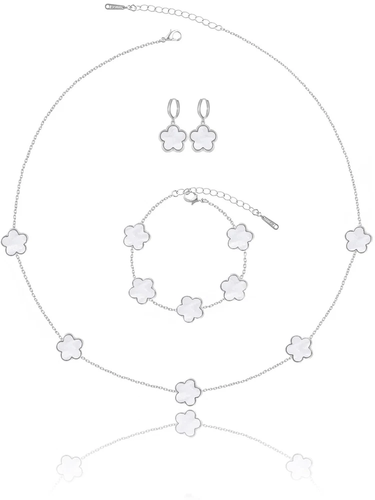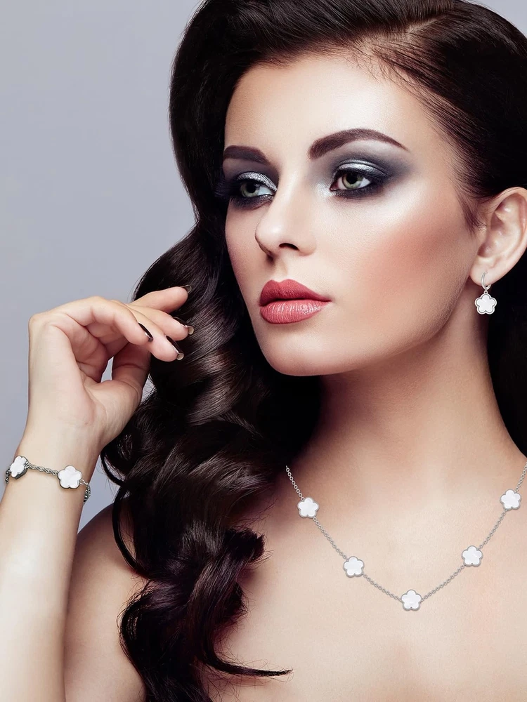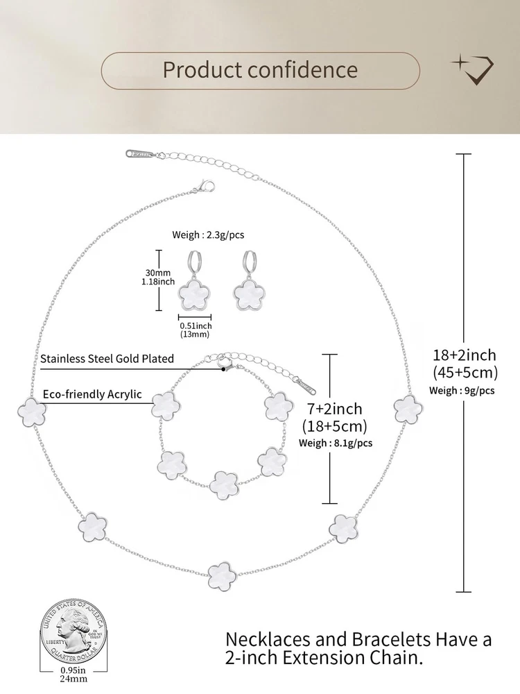 Gold Plated Five Leaf Clover Necklace Bracelet and Dangle Earrings Set for Women Lucky Flower Jewelry Product Details Color: White-White Gold Plated Brand: Qinpan MPN: DZTZ1013 UPC: 782279245701 EAN: 0782279245701 Item Weight : 0.75 ounces Department : womens Date First Available : October 8, 2024 Manufacturer : QINPAN Brand, Seller, or Collection Name: Qinpan Material: Stainless Steel Gem Type: No Gemstone Setting: Bezel Setting Item Length: 18 inches Chain: Link Chain Clasp: Lobster Clasp Ring size: 8 Number of stones: 12 Stone Weight: 15.00 cttw Model number: DZTZ1001 Metal: Yellow Gold Plated Stainless Steel Metal stamp: No Metal Stamp Metal Weight: 19 g Minimum color: White Minimum clarity: SI1-SI2 Stone shape: Flower Cut: Very Good Stone Creation Method: Synthetic Stone Treatment Method: Clarity Enhanced Add endless sparkle to any special occasion with QINPAN's gorgeous necklace bracelet and dangle earring set with plastic. Don't miss these set stunners, meticulously accented with inlaid chalcedony gems. These gleaming dangling necklace bracelet and earrings are surefire head-turners, whether worn for proms, bridesmaids, cocktail parties, mothers of the bride, holiday galas or with jeans and a sweater! We love the "dress up" or "dress down" versatility of these fashion dangle necklace earrings and bracelet set. Treat yourself or someone you love to some jewelry at a fabulous price. Caring For Your Jewelry: Our Jewelry are made of Genuine high-grade Material, as long as the proper maintenance, ensure wearing years still bright as new. They don't need to use very expensive maintenance water, just to avoid acid-base and moist environment.Perfume is also corrosive to jewelry. Humid conditions include: don't wear when shower, washing face, sweating, deposit before application of dry cloth to wipe dry.