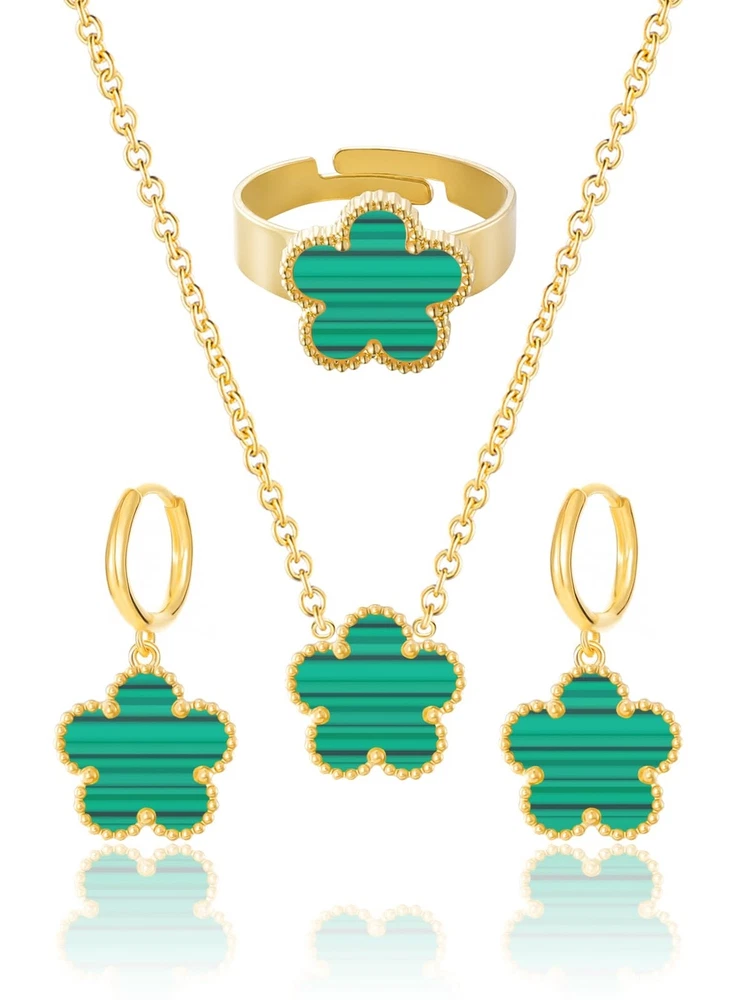 Gold Plated Five Leaf Clover Necklace Rings and Dangle Earrings Set for Women Lucky Flower Jewelry Product Details Color: Green Stripe-14K Gold Plated Brand: Qinpan MPN: DZTZ1036 UPC: 737745262591 EAN: 0737745262591 Item Weight : 0.35 ounces Department : womens Date First Available : October 22, 2024 Manufacturer : QINPAN Brand, Seller, or Collection Name: Qinpan Material: Stainless Steel Gem Type: No Gemstone Item Length: 18 inches Chain: Link Chain Clasp: Lobster Clasp Ring size: 7.5 Number of stones: 4 Stone Weight: 4 cttw Metal: Yellow Gold Plated Stainless Steel Metal stamp: No Metal Stamp Metal Weight: 9 g Stone shape: Irregular Minimum clarity: Slightly Included Cut: Very Good Add endless sparkle to any special occasion with QINPAN's gorgeous necklace rings and earrings set with plastic. Don't miss these set stunners, meticulously accented with inlaid chalcedony gems. These gleaming dangling necklace rings and dangle earrings are surefire head-turners, whether worn for proms, bridesmaids, cocktail parties, mothers of the bride, holiday galas or with jeans and a sweater! We love the "dress up" or "dress down" versatility of these fashion dangly earrings necklace and rings set. Treat yourself or someone you love to some jewelry at a fabulous price. Caring For Your Jewelry: Our Jewelry are made of Genuine high-grade Material, as long as the proper maintenance, ensure wearing years still bright as new. They don't need to use very expensive maintenance water, just to avoid acid-base and moist environment.Perfume is also corrosive to jewelry. Humid conditions include: don't wear when shower, washing face, sweating, deposit before application of dry cloth to wipe dry.