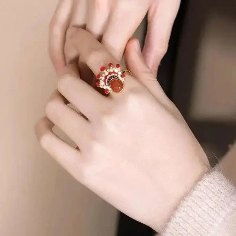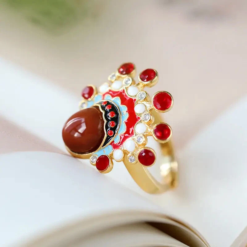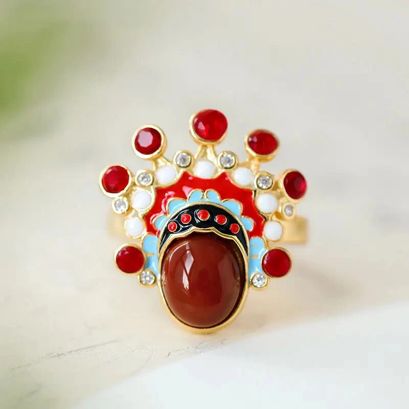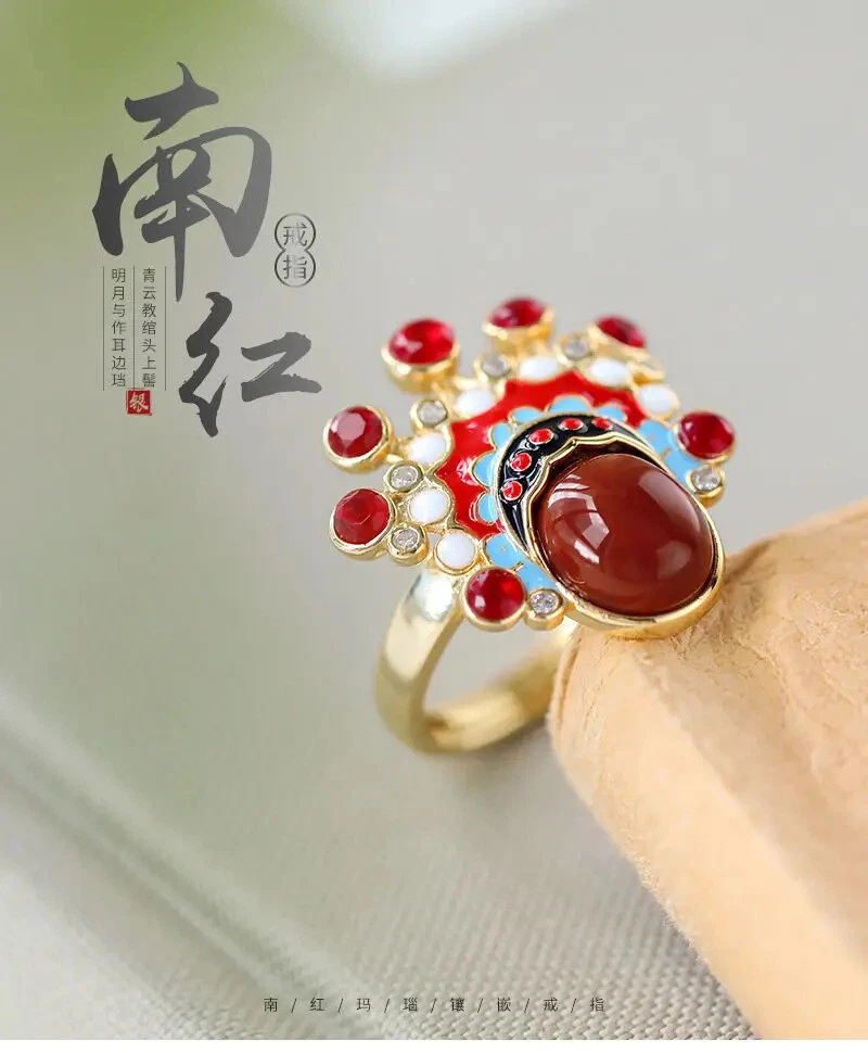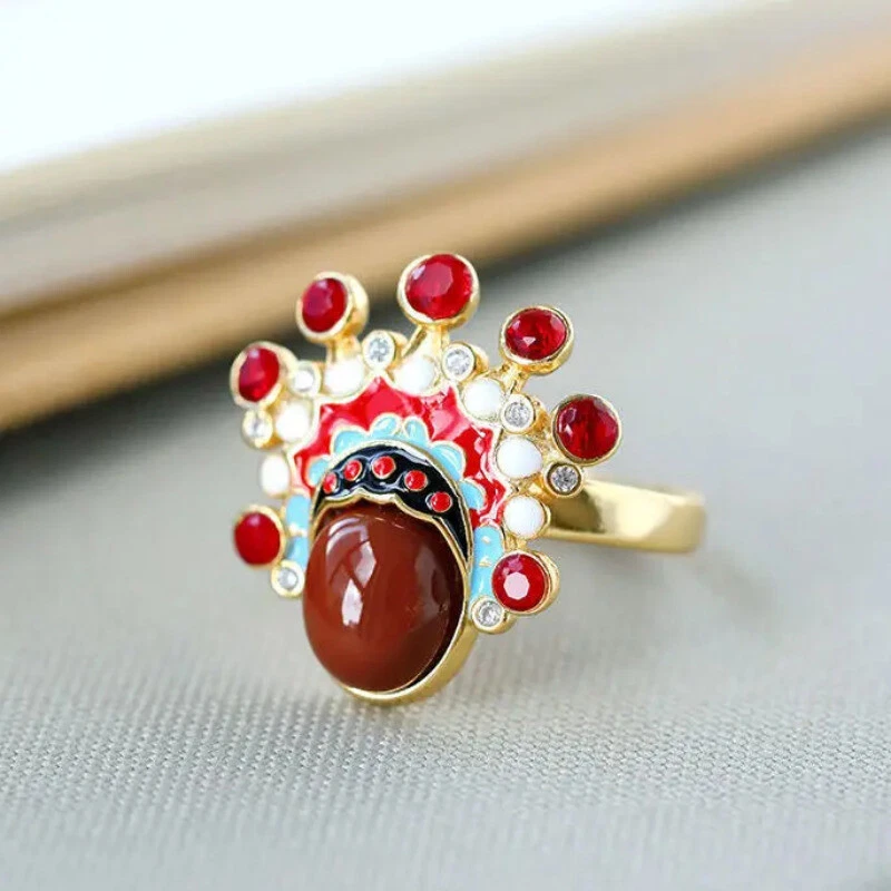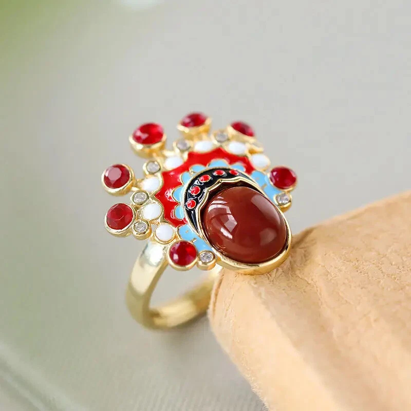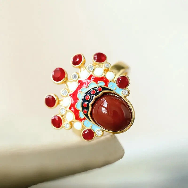 Gold Plated Southern Red Agate Cloisonne Beijing Opera Famous Open Ring