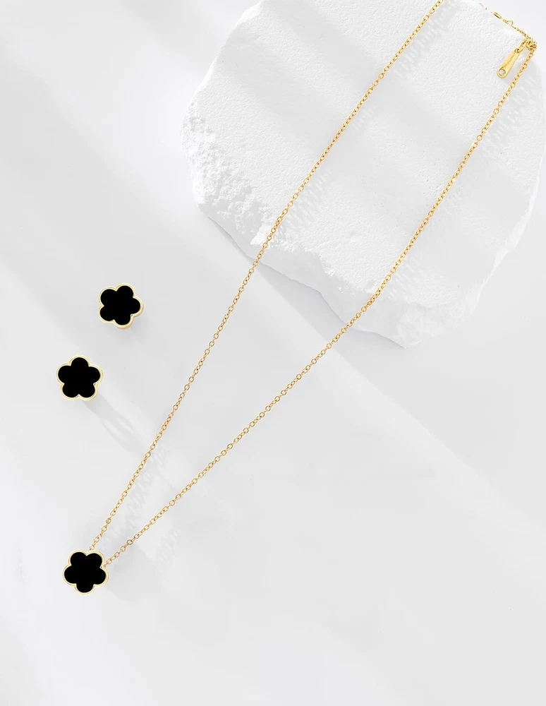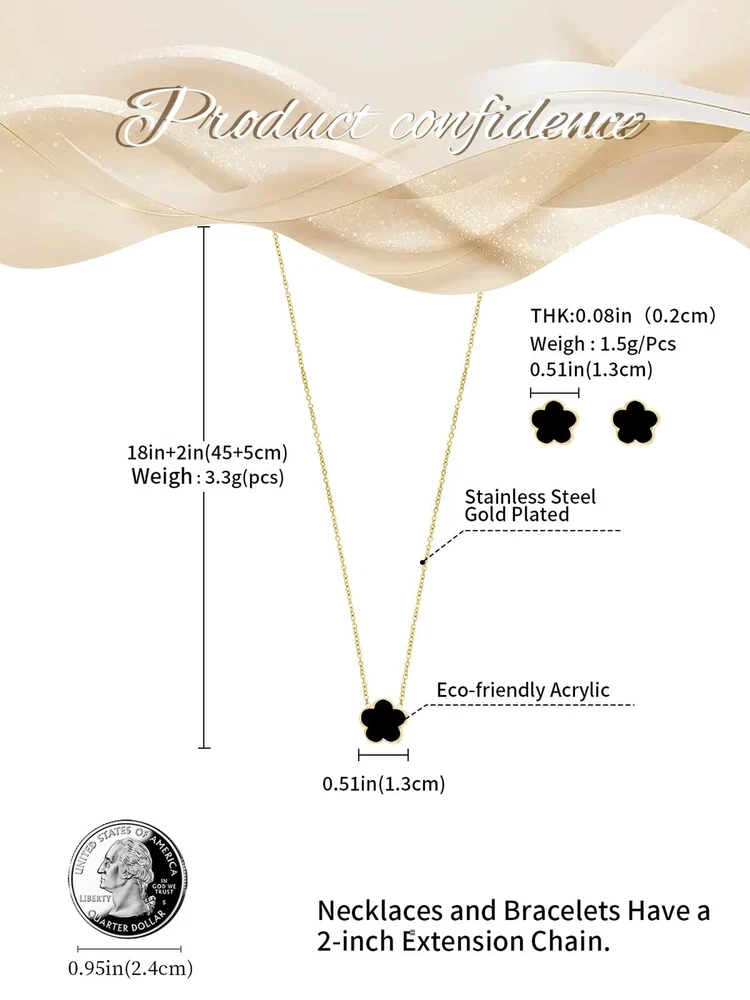 Gold Plated Stainless Steel Flower Necklace and Stud Jewelry Set for Women Product Details Color: Black-Gold Plated Brand: JIEMUCHU MPN: TZ10006 UPC: 784853515170 EAN: 0784853515170 Product Dimensions : 17.72 x 0.51 x 0.08 inches; 0.25 ounces Item model number : TZ10006 Department : womens Date First Available : June 11, 2024 Manufacturer : JIEMUCHU Brand, Seller, or Collection Name: JIEMUCHU Material: Yellow Gold Gem Type: No Gemstone Setting: Prong Setting Item Length: 17.72 inches Diameter: 1.30 centimeters Length: 50.00 centimeters Chain: c_link Clasp: Lobster Clasp Ring size: adjustable Stone Weight: 2.00 carats Model number: TZ10006 Metal: Gold Plated Copper Metal stamp: 14K Gold Plated Metal Weight: 6 g Surface markings and blemishes: Lightly Blemished Stone shape: Irregular Minimum color: Black Minimum clarity: Slightly Included Cut: Fair cut