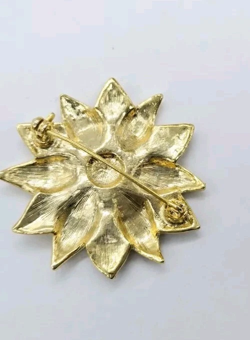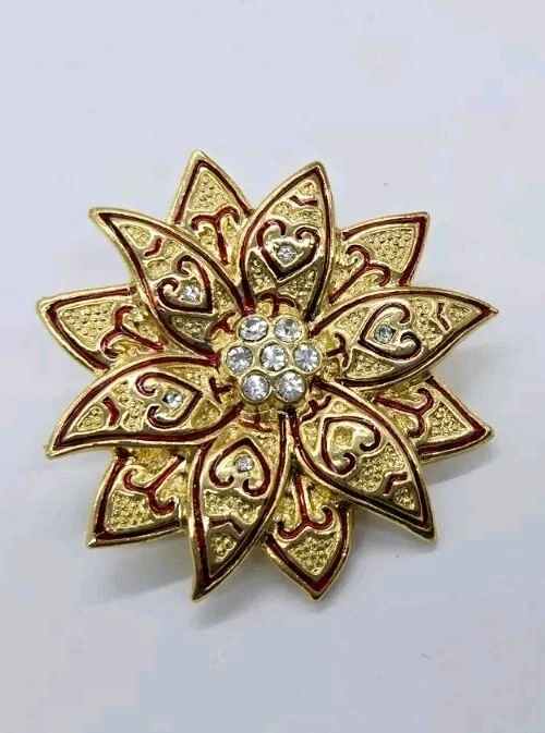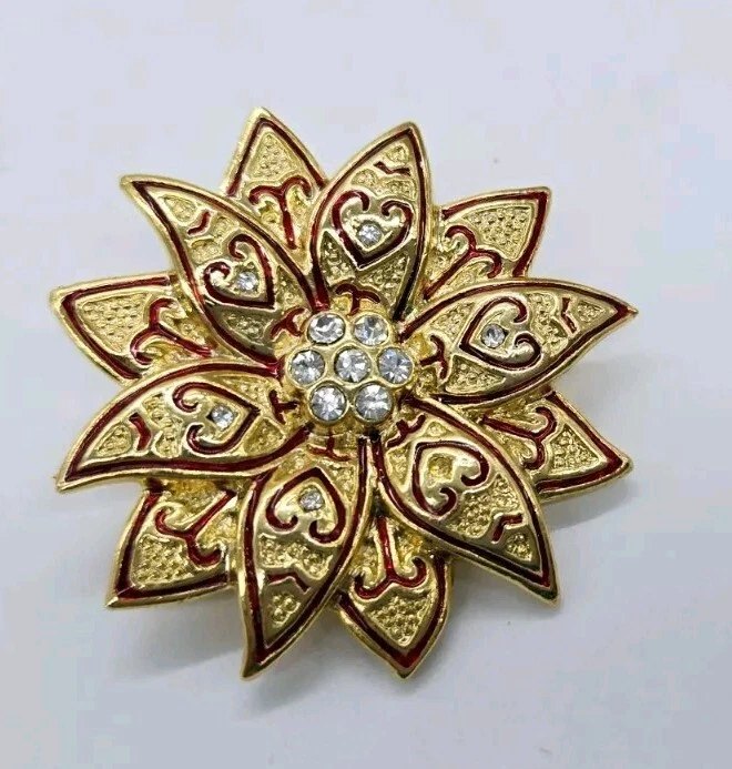 Gold Poinsettia Brooch Pin Red ENAMEL Christmas Crystal Accent 1.75" Holiday