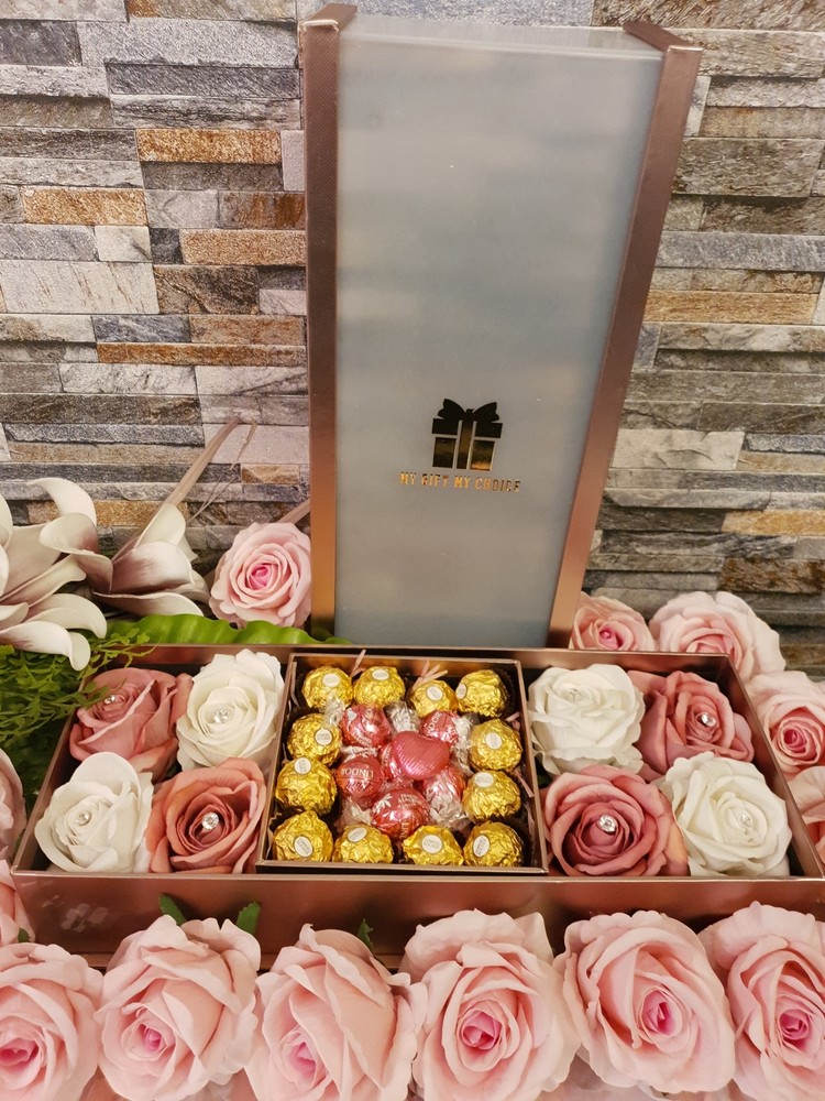 This Gift Box is a Luxury gift to your loved ones elegant and glamorous box with artificial roses. You can customise your box and make it extra special. Free customisation. You can request different flowers colour , different types of chocolates or add more items we will do our best to make it possible You can add messages and note to your basket. No Need for wrapping You can add a message to your gift at the checkout No Substitution what you see is what you will receive This Gift Box Includes: 1 Gift Box Lindor and Ferrero Rocher chocolate Heart shape Milk Chocolate You can add extra items to your box from our collections e.g. Jewellery or keyrings, mugs and more. Extra Large Velvet Rose with Crystal