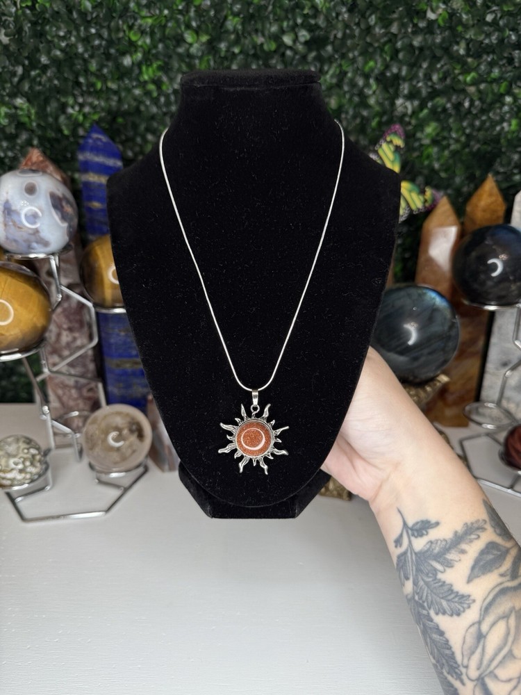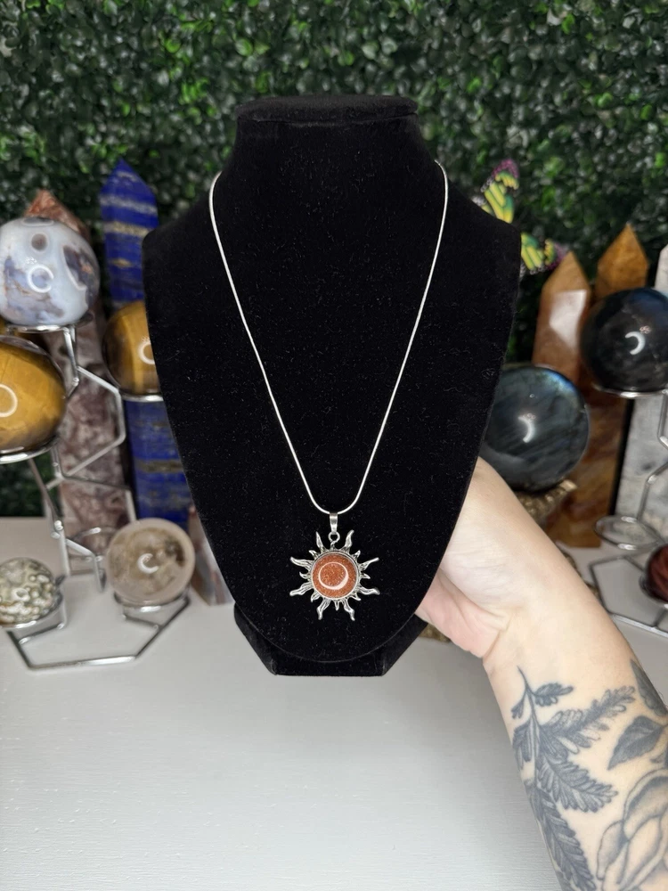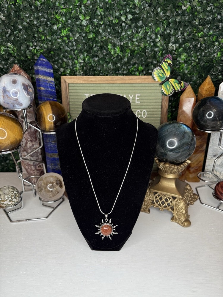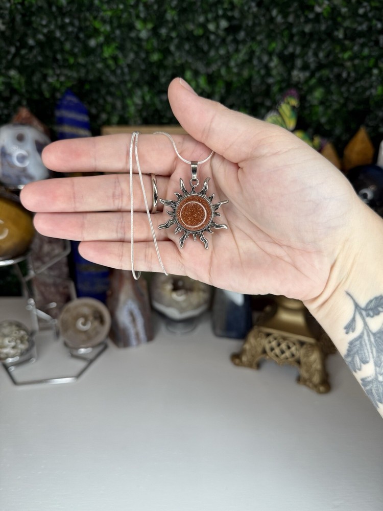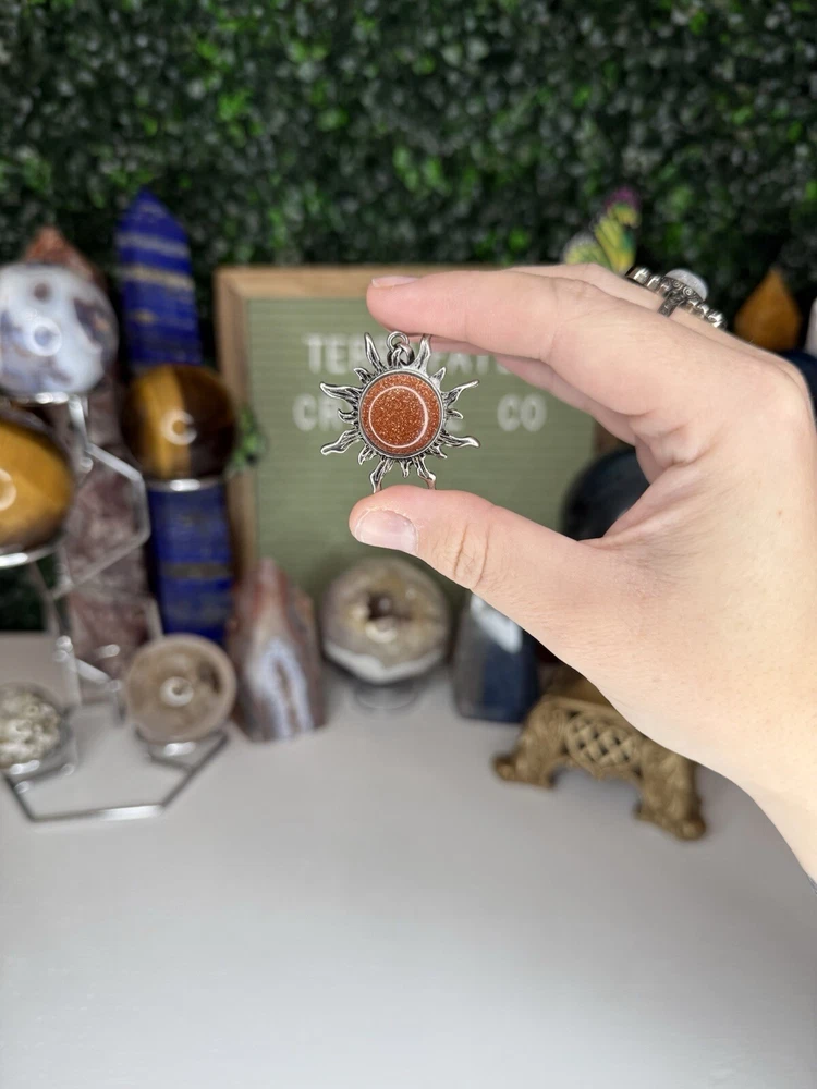 Listing is for one (1) Gold Sandstone Crystal Sun necklace. Pendant comes on 18in chain, 925 silver plated (copper), 1.2mm. Chain is durable, bright, and dainty. Lobster claw clasp. Jewelry Care Instruction card will be included in each order. Avoid sprays or lotions near jewelry to avoid tarnishing. Keep jewelry from getting wet; remove before bathing, swimming, hand washing. Remove before vigorous exercise. #crystal #sun #necklace #jewelry #sandstone