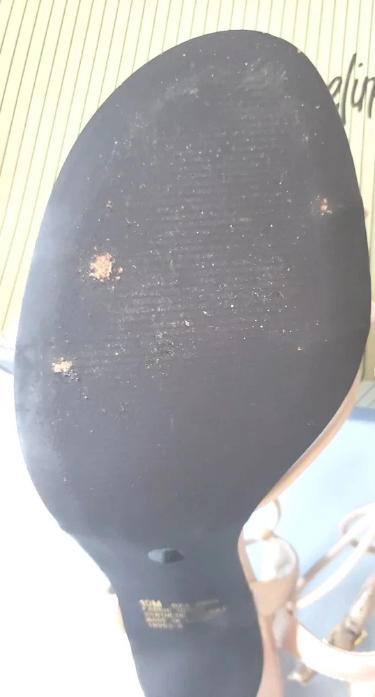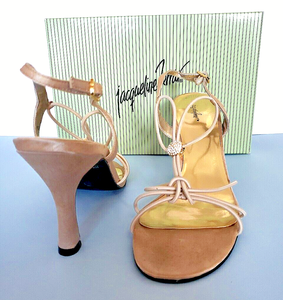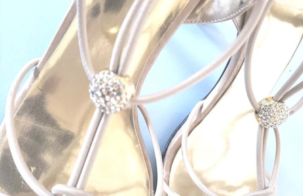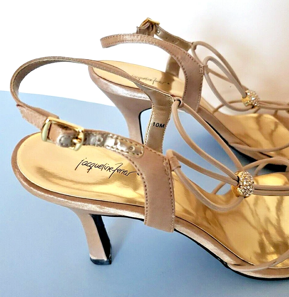 Elevate your party/cocktail/formal attire with these stunning size 10 strappy gold satin heel sandals from Jacqueline Ferrar. Rhinestone accents on the straps provide a touch of glamor, making these sandals perfect for any special occasion for all seasons. Made with synthetic material, these sandals feature a solid pattern in a beautiful gold shade. You can also wear these strappy heels to elevate the more casual feel of jeans also great for weddings, and proms. Slight wear on outer sole. Original shoe box included.