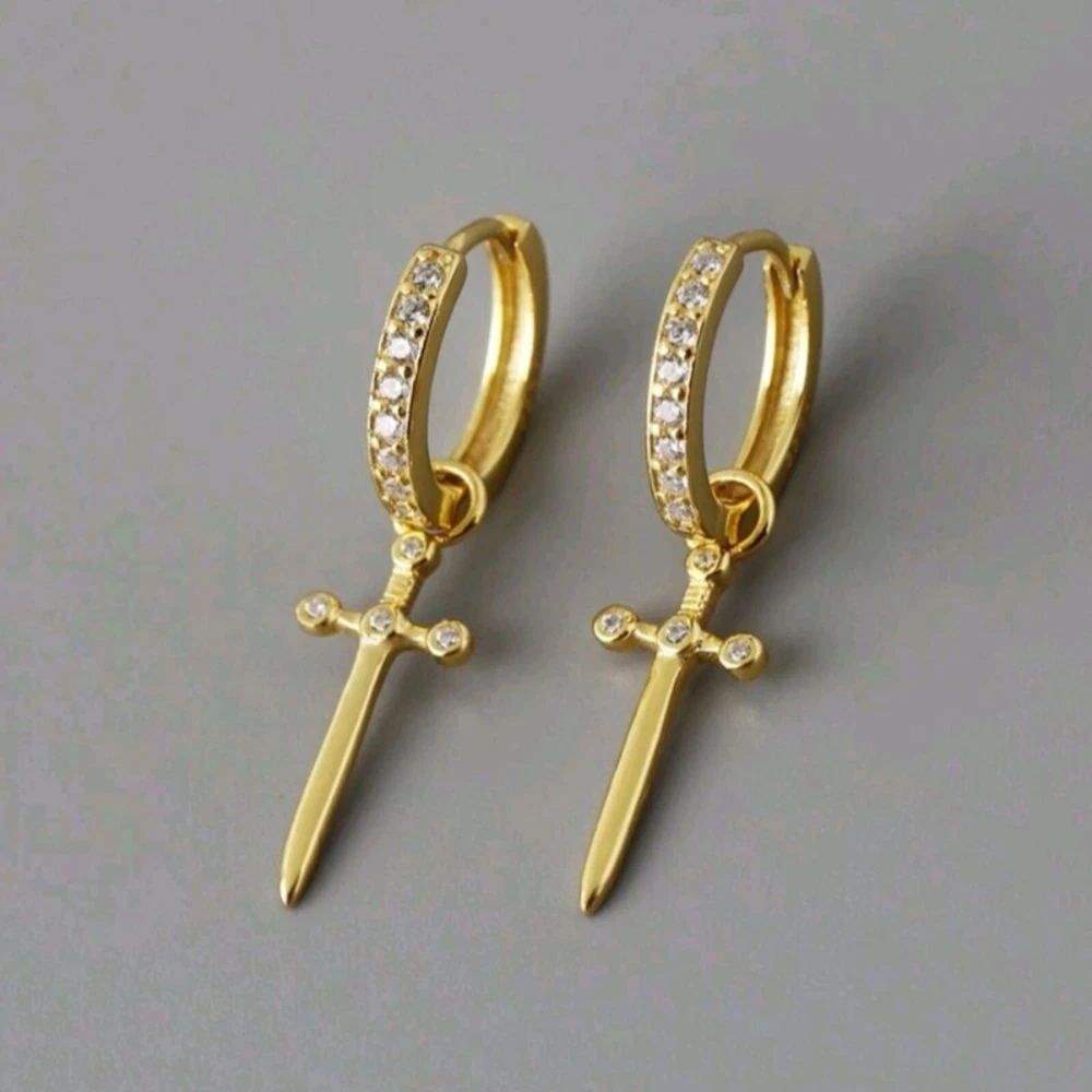 Add a touch of daring elegance to your look with these 18k Gold Plated Dagger Earrings. Each earring features a sleek, dagger-inspired design, sparkling with carefully set cubic zirconia stones that catch the light at every angle. Perfect for those who love to mix a bit of edge with their glamour, these earrings are lightweight and comfortable for all-day wear. Whether you're heading to a chic party or simply want to elevate your everyday style, these dagger earrings will make a bold statement. Own a piece of jewelry that's as fierce and unique as you are—limited stock, grab yours now!