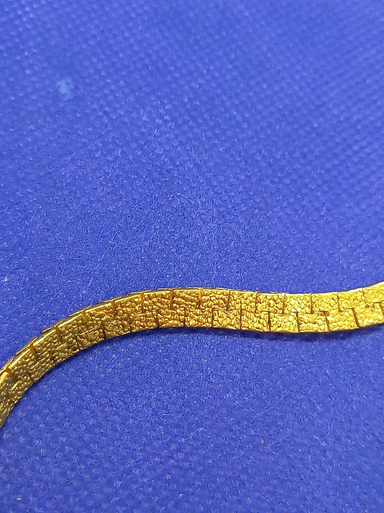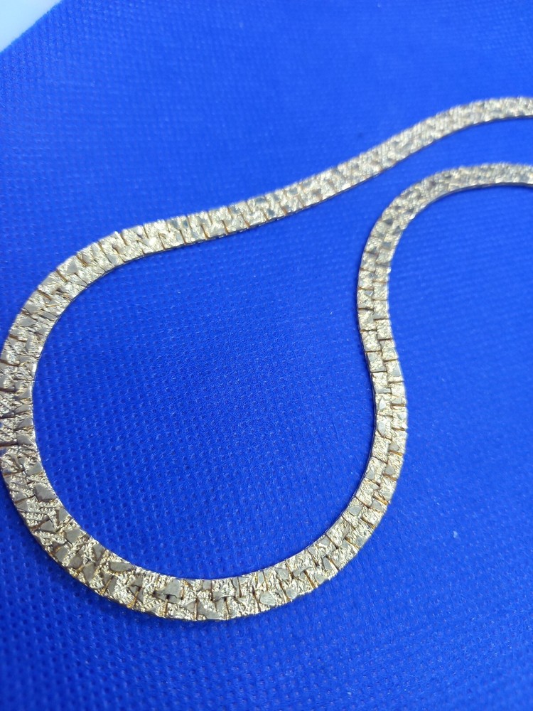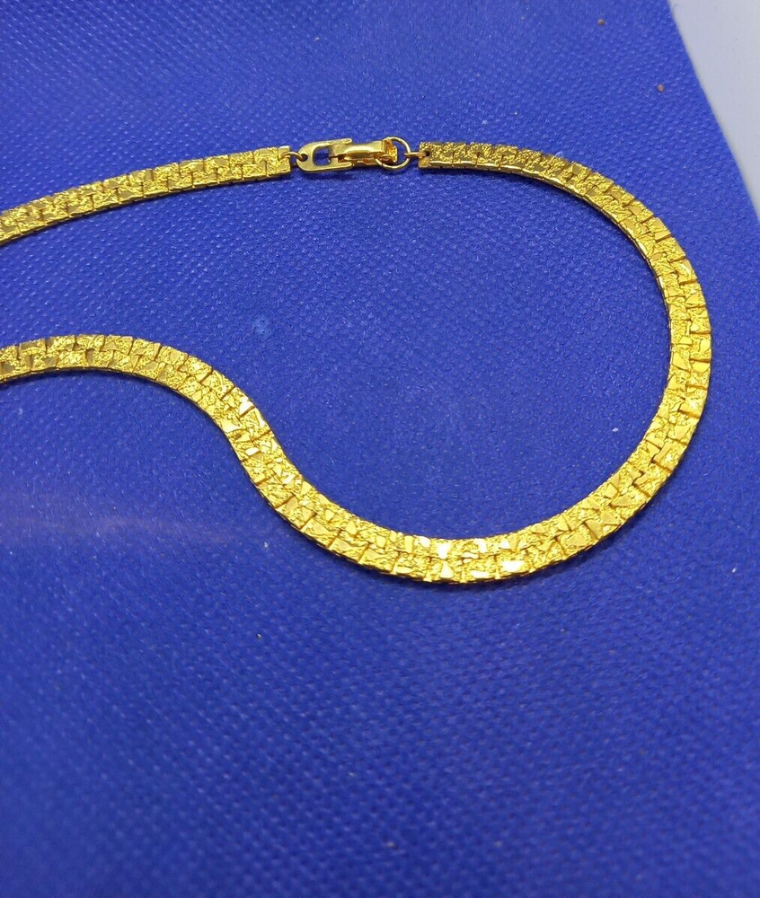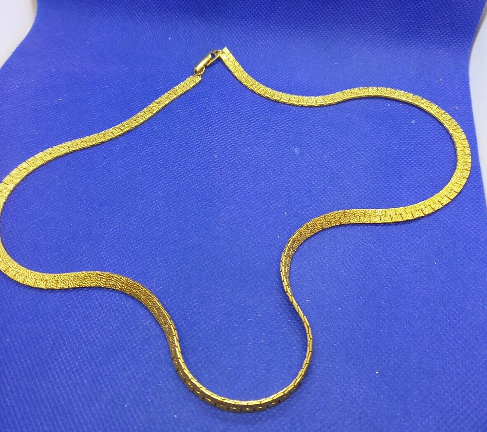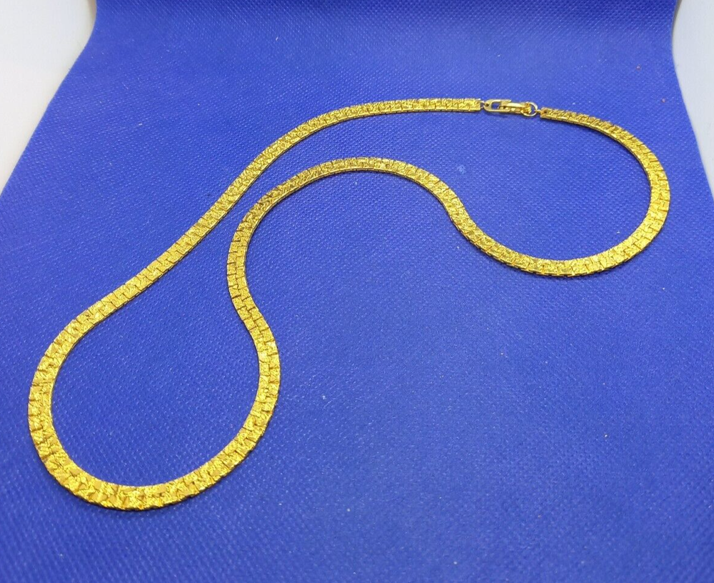 Great vintage condition with very little wear. 0.8cm wide textured on both sides gold tone or plated? chain in fab order. 24" long. Foldover clasp.