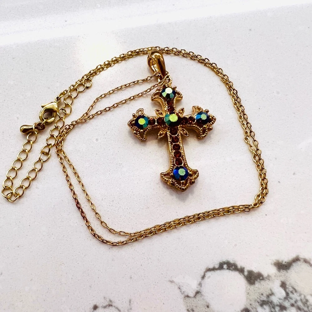 Gold Tone Cross Pendant with Blue / Purple Aurora Crystal Rhinestones Accents Gold tone cross pendant with aurora and amber rhinestone accents. Lobster clasp closure Approximate Measurements 18” full Length 2.5” extension 1.25” length x 1” width pendant Smoke Free | Pet Free Environment