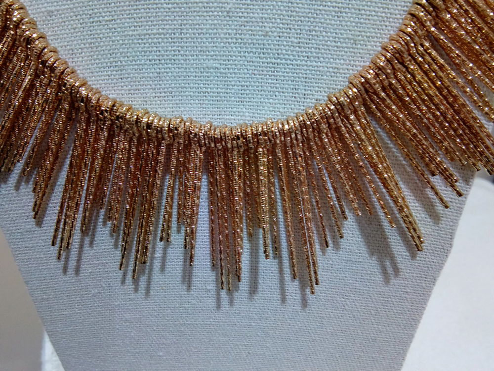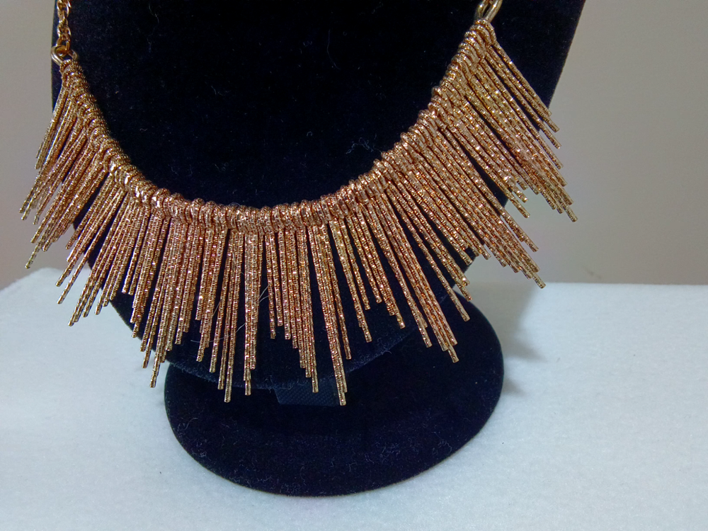 This is a unique piece. It is gold tone and has a 9" drop with a 2" extender. The fringe varies from 1" to 1 3/4". It has a very sturdy chain with a lobster closure.