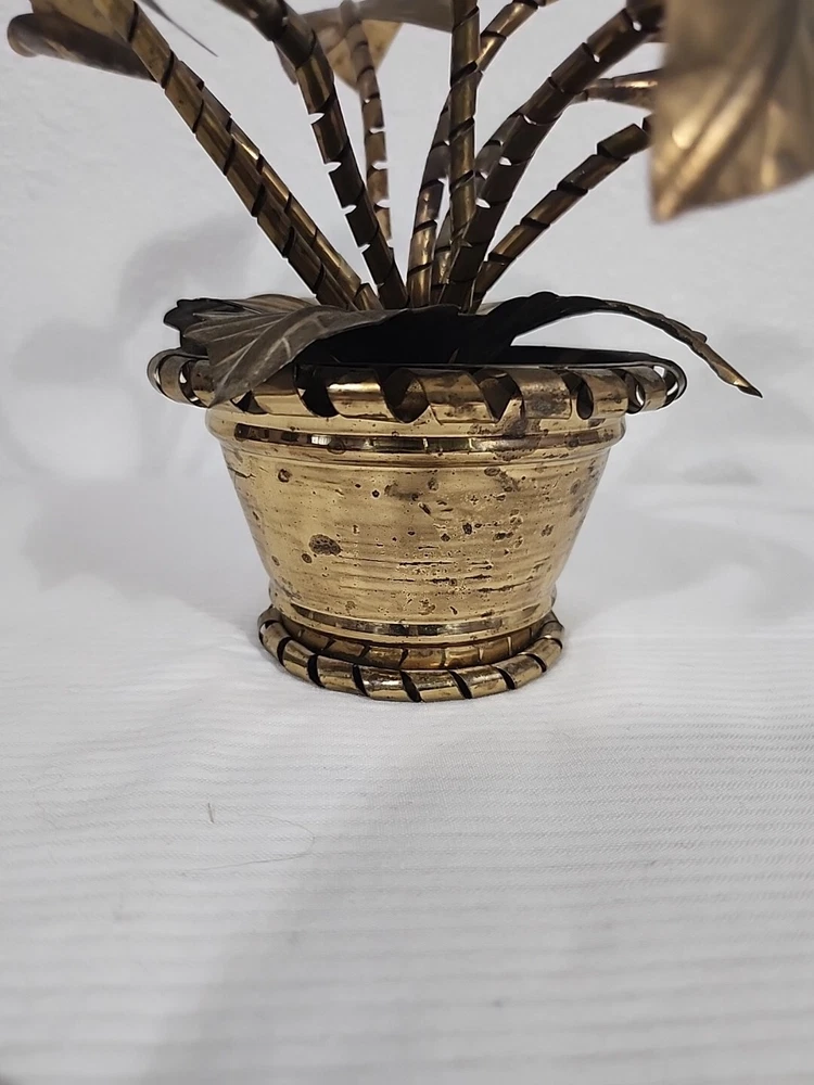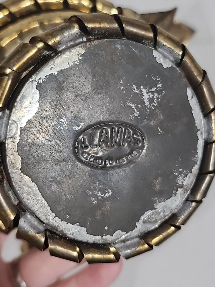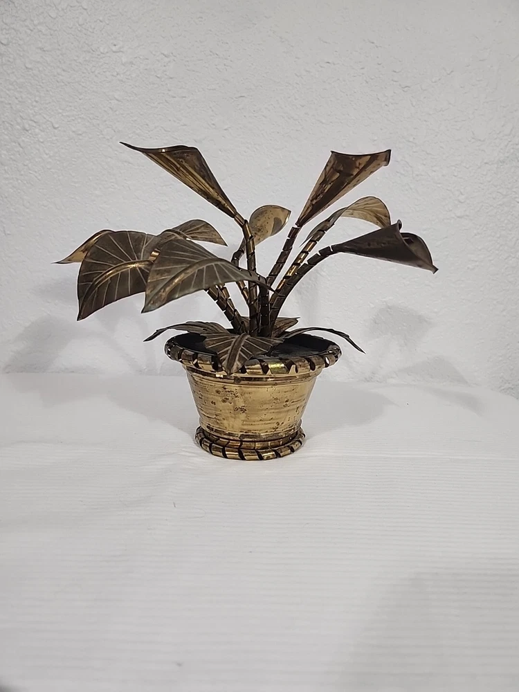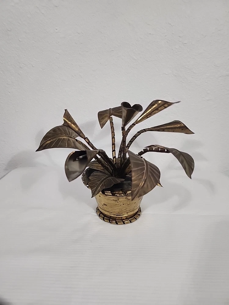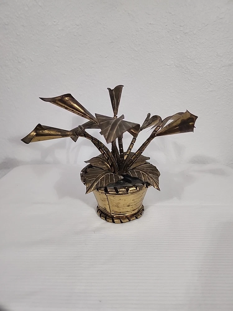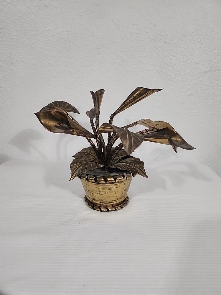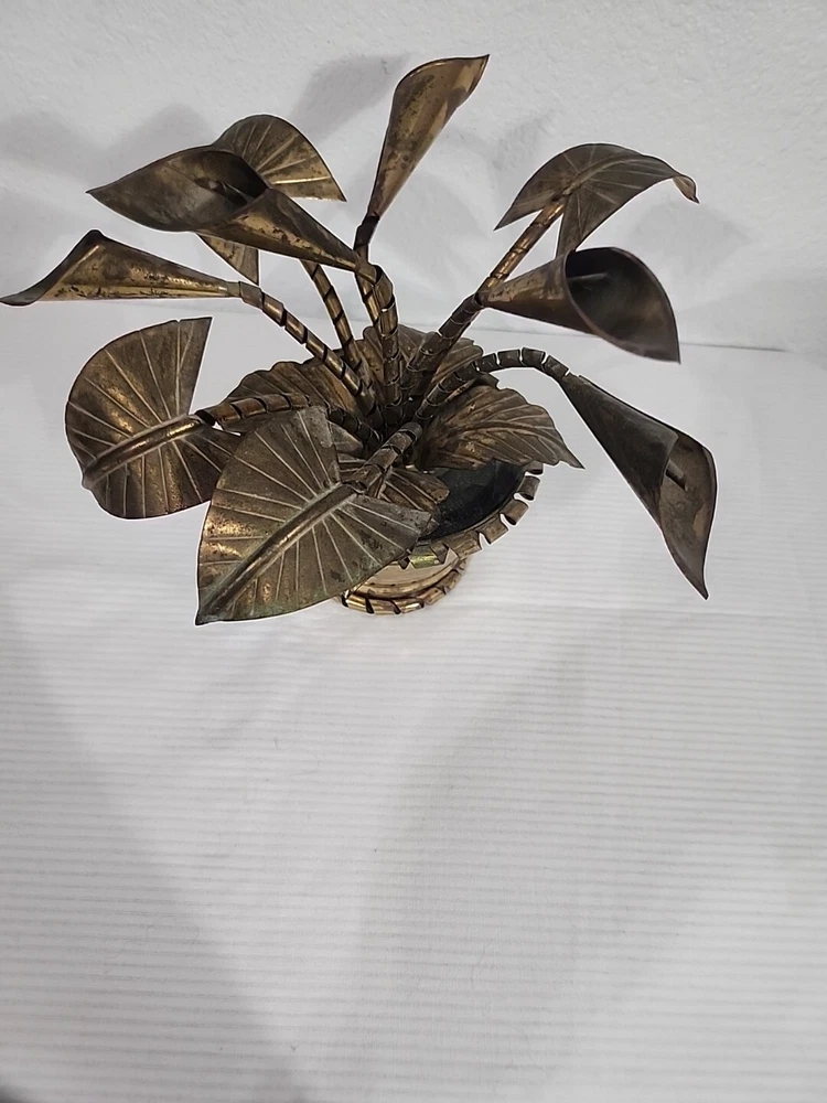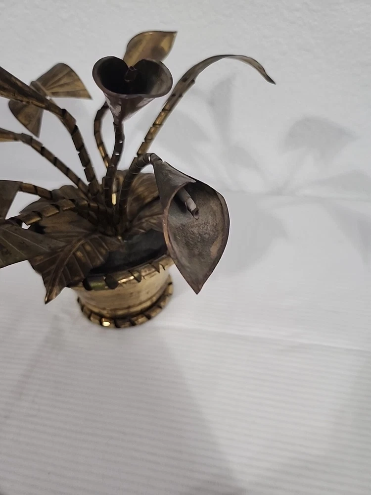 This is a medium-sized gold-tone metal sculpture of Cala Lily flowers by Llamas. The abstract art piece is 8 inches in length, height, and width, with a free-standing mounting. The sculpture features a stylized interpretation of Cala Lily flowers in an Art Deco style that have movement with touch or a breeze. Add to your all-season porch or sitting area, perfect for floral and garden-themed decor.