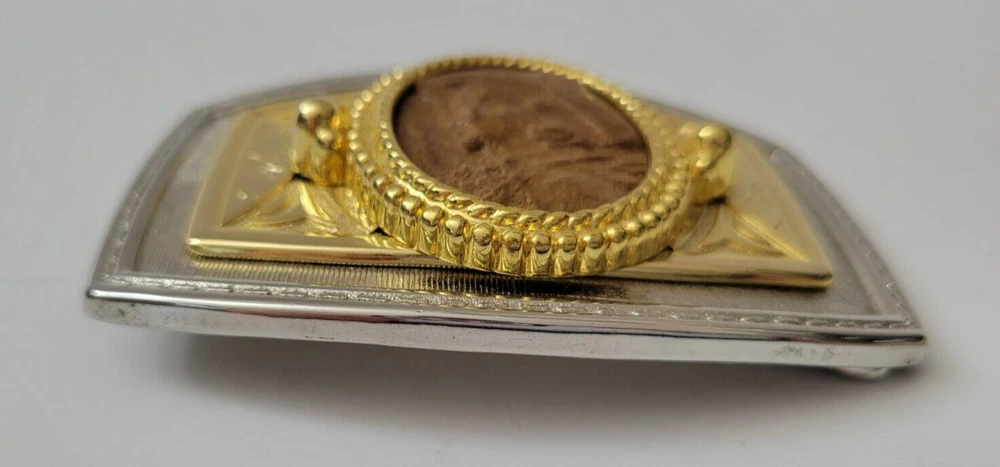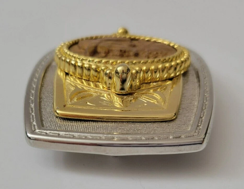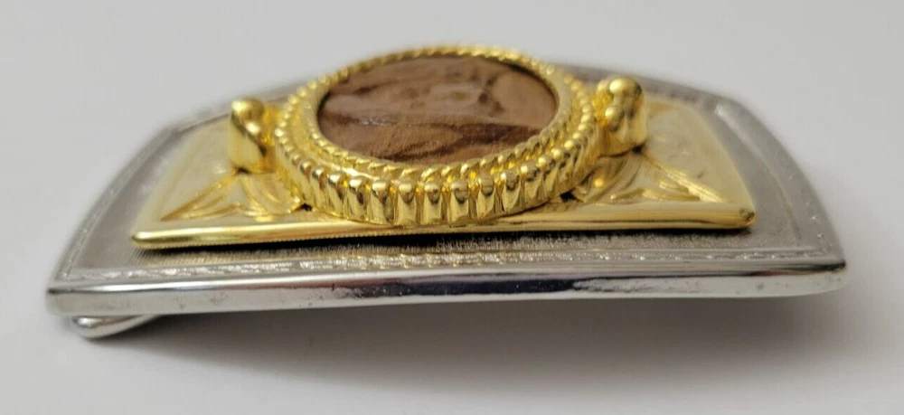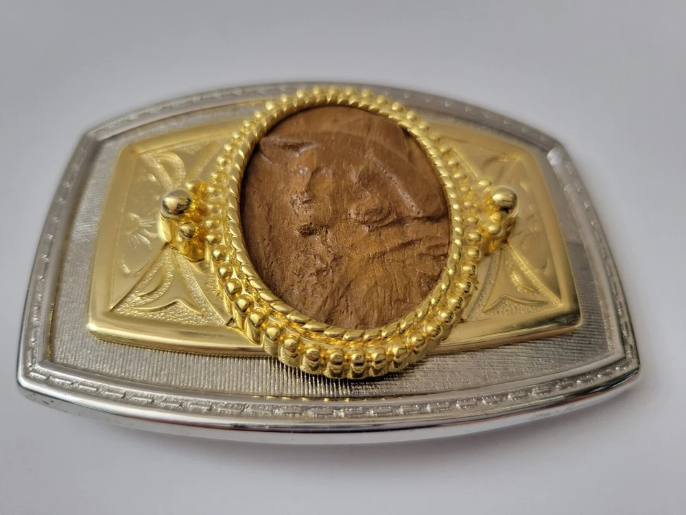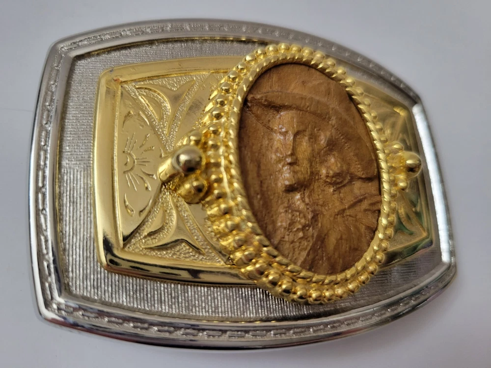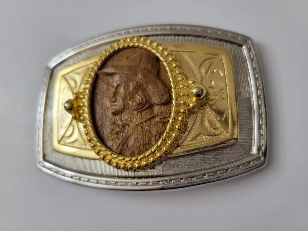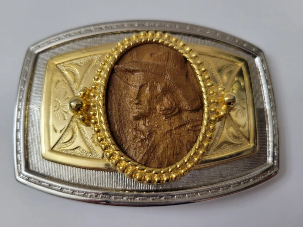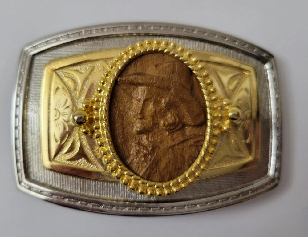 Gold and Silver Belt Buckle with Wooden Cowboy Portrait Metals Untested Each item is carefully packaged to prevent any damage and is shipped immediately with tracking.