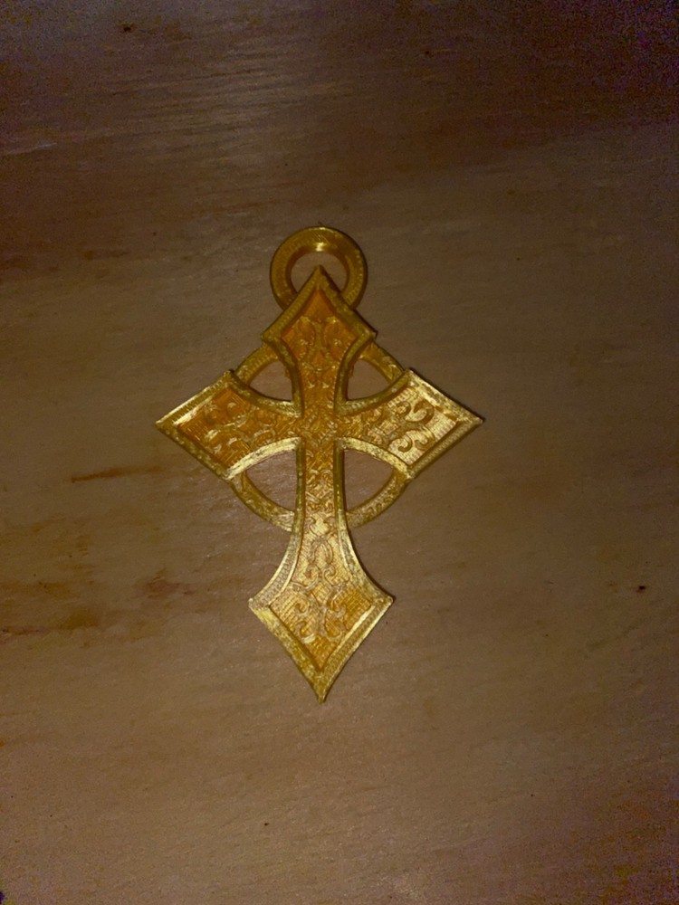 This product is a gold colored plastic 3D printed cross pendant, available in multiple sizes. As a pendant of religious theme, it could be used for adornments or as a symbol of faith. Made from durable plastic, this pendant is sure to last for years to come.