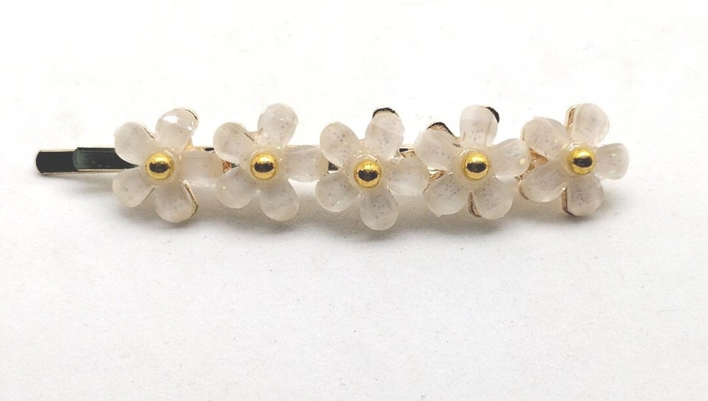 This is a gold-toned hair clip featuring a white daisy flower design, perfect for women with thin hair. It is ideal for various occasions such as weddings, parties, casual outings, and business settings. The clip is made of metal and can be used as a stylish accessory to sweep hair to the side. Gold Toned White Daisy Flower Hair Clip Accessory Bobby Pin Jewelry Side Swept 2.5in We use our pictures as part of our condition and description on each item. This item may need to be polished or cleaned as we try to keep everything how we found the item. Combined shipping on orders is always available! *Props are not included, such as jewelry boxes, earring holders, ECT... **Please follow the Biba Dushi Treasures store so that you are notified of new items!!!! ***No returns on International Sales!!! International Shipping will ONLY be through Global Shipping!!!!