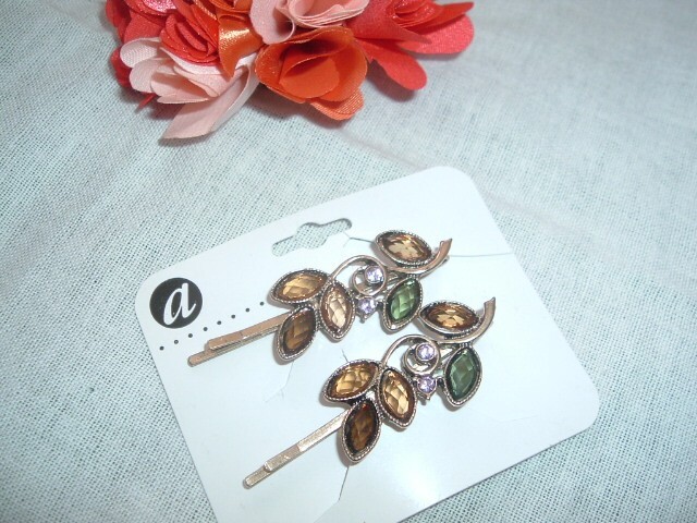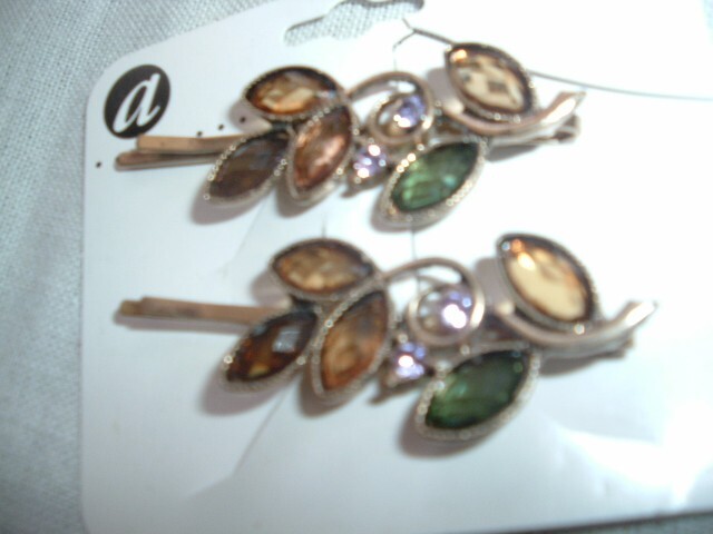 From the closing of a downtown Chicago boutique, a pair of polished goldtone bobby pins with emerald green, amber and pink crystal flowers measuring 2" long. Condition is excellent, gorgeous color combination, classic and sparkling on. We combine ship.