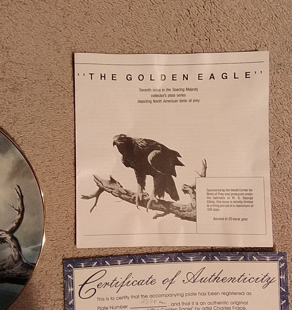 Elevate your collection with the Bradford Exchange Soaring Majesty collector plate, featuring the exquisite craftsmanship of Charles Frace. This 8.5-inch ceramic plate, from the 1991 series, showcases a majestic golden eagle in vivid, multicolor detail, capturing the spirit of wild animal themes beloved by collectors. The round shape and decorative style reflect the artistry of late 20th-century American pottery, making it a standout piece for any display. Complete with a stand for easy presentation, this collector's item embodies the production style of art pottery with a touch of historical significance. Whether you're commemorating special occasions or simply celebrating the beauty of nature, this plate is a timeless representation of both the Bradford Exchange legacy and the enduring allure of collector's items. You Will Receive The Item(s) Pictured. We Do COMBINE SHIPPING So Take A Look At Our Other Items. If You Would Like To Take Advantage Of The COMBINED SHIPPING Please Wait For Invoice Before Payment. If You Have Any Questions We Will Be Happy To Answer Them.