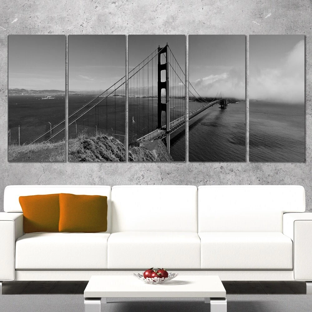 This beautiful Photography Canvas Art is printed using the highest quality fade resistant ink on canvas. Every one of our fine art giclee canvas prints is printed on premium quality cotton canvas, using the finest quality inks which will not fade over time. Each giclee print is stretched tightly over a 1 inch wood sub frame ensuring the canvas is taught and does not buckle. This canvas art print is gallery-wrapped (the design continues on the sides) , giving it a real art gallery feel. All of our canvas prints are carefully packaged with plastic protection, fragile labeling and sturdy boxes to ensure a safe delivery. Every canvas print arrives ready to hang on the wall, with the hanging kits includedPeriod: ContemporaryOrientation: HorizontalSubject: Photography, Architecture, Matching Free Shipping Over $49.99* Details Golden Gate Bridge in Gray Panorama - Sea Bridge Canvas Wall Gold Product Description: This beautiful Photography Canvas Art is printed using the highest quality fade resistant ink on canvas. Every one of our fine art giclee canvas prints is printed on premium quality cotton canvas, using the finest quality inks which will not fade over time. Each giclee print is stretched tightly over a 1 inch wood sub frame ensuring the canvas is taught and does not buckle. This canvas art print is gallery-wrapped (the design continues on the sides) , giving it a real art gallery feel. All of our canvas prints are carefully packaged with plastic protection, fragile labeling and sturdy boxes to ensure a safe delivery. Every canvas print arrives ready to hang on the wall, with the hanging kits included PeriodContemporary OrientationHorizontal SubjectPhotography, Architecture, Matching Set, Modern, Decorative, Horizontal TypeCanvas Art, Fine Art, Fine Art Giclee, Print, Wrapped MaterialCanvas, Cotton, Wood StylePhotography, Architecture, Matching Set, Modern, Decorative, Horizontal Number of Pieces4+ FramedFramed Exact ColorGold SizeOversized ColorGold