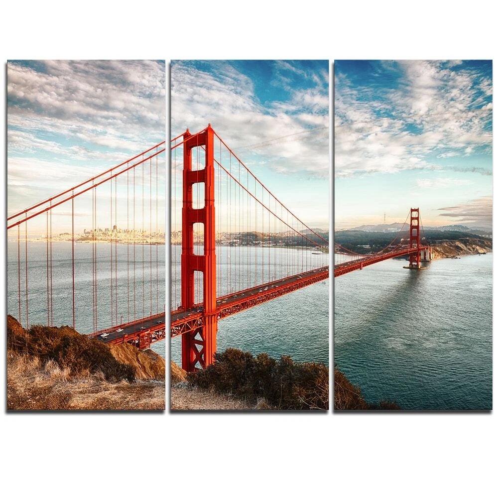 This beautiful Photography Canvas Art is printed using the highest quality fade resistant ink on canvas. Every one of our fine art giclee canvas prints is printed on premium quality cotton canvas, using the finest quality inks which will not fade over time. Each giclee print is stretched tightly over a 1 inch wood sub frame ensuring the canvas is taught and does not buckle. This canvas art print is gallery-wrapped (the design continues on the sides) , giving it a real art gallery feel. All of our canvas prints are carefully packaged with bubble wrap, fragile labeling and sturdy boxes to ensure a safe delivery. Every canvas print arrives ready to hang on the wall, with the hanging kits included Period: ContemporaryOrientation: HorizontalSubject: Photography, Architecture, Matching Set, Free Shipping Over $49.99* Details Golden Gate Bridge in San Francisco - Sea Bridge Canvas Wall Artwork Print Product Description: This beautiful Photography Canvas Art is printed using the highest quality fade resistant ink on canvas. Every one of our fine art giclee canvas prints is printed on premium quality cotton canvas, using the finest quality inks which will not fade over time. Each giclee print is stretched tightly over a 1 inch wood sub frame ensuring the canvas is taught and does not buckle. This canvas art print is gallery-wrapped (the design continues on the sides) , giving it a real art gallery feel. All of our canvas prints are carefully packaged with bubble wrap, fragile labeling and sturdy boxes to ensure a safe delivery. Every canvas print arrives ready to hang on the wall, with the hanging kits included PeriodContemporary OrientationHorizontal SubjectPhotography, Architecture, Matching Set, Modern, Decorative, Horizontal TypeCanvas Art, Fine Art, Fine Art Giclee, Print, Wrapped MaterialCanvas, Cotton, Wood StylePhotography, Architecture, Matching Set, Modern, Decorative, Horizontal Number of Pieces3 FramedFramed Exact ColorBlue SizeLarge ColorBlue, Orange