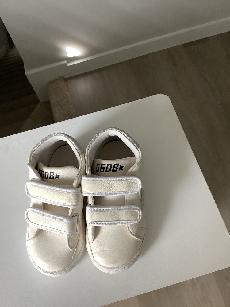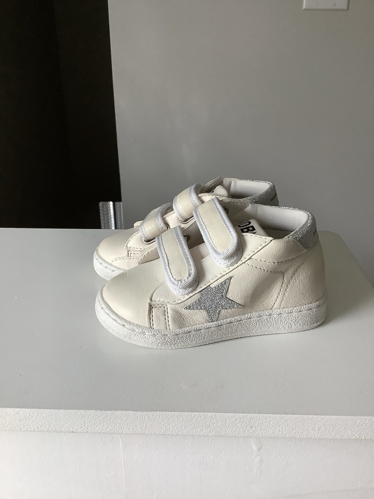 The Golden Goose Toddler Shoes Size 23 High Top White Silver Star Glitter are stylish and comfortable sneakers for girls. These shoes feature a round toe shape, velcro straps and flat heel for easy wear. The white color with silver star glitter accents adds a touch of sparkle to the design, making them perfect for casual occasions like school or playtime. Made of high-quality leather with a rubber outsole, these shoes provide comfort and durability for toddlers on the go. Perfect for summer, fall, and spring, these athletic shoes from Golden Goose are a fashionable choice for any little girl.