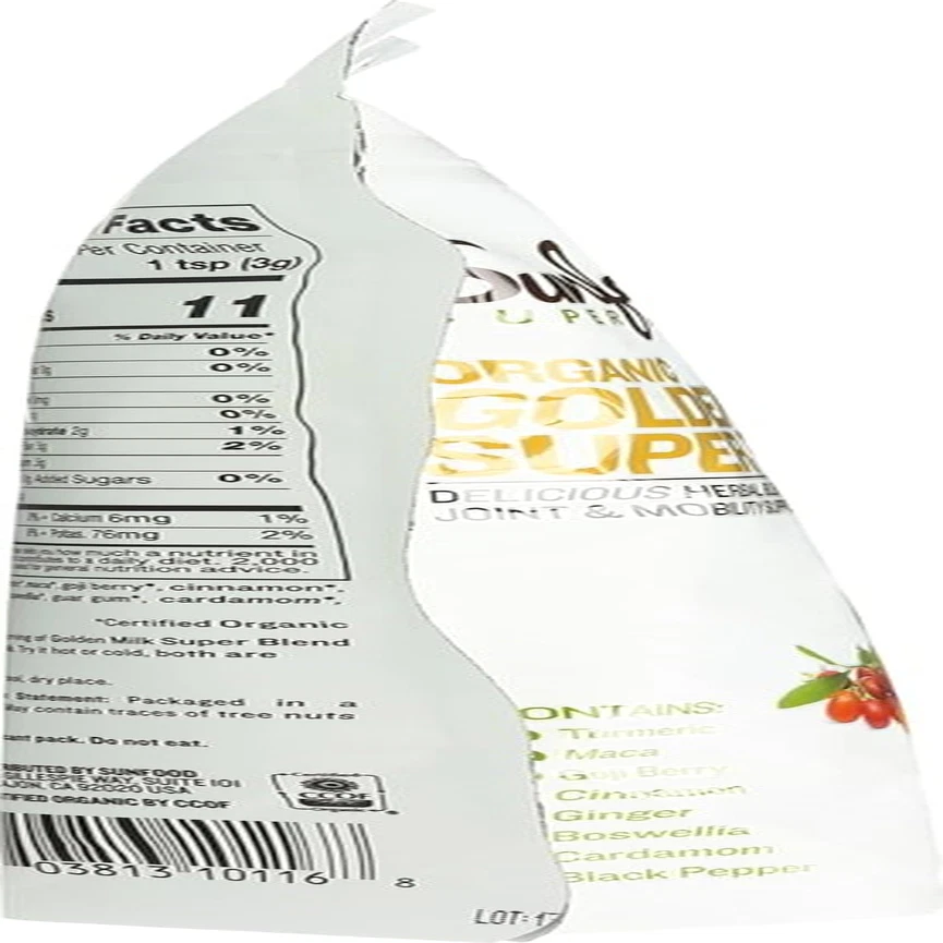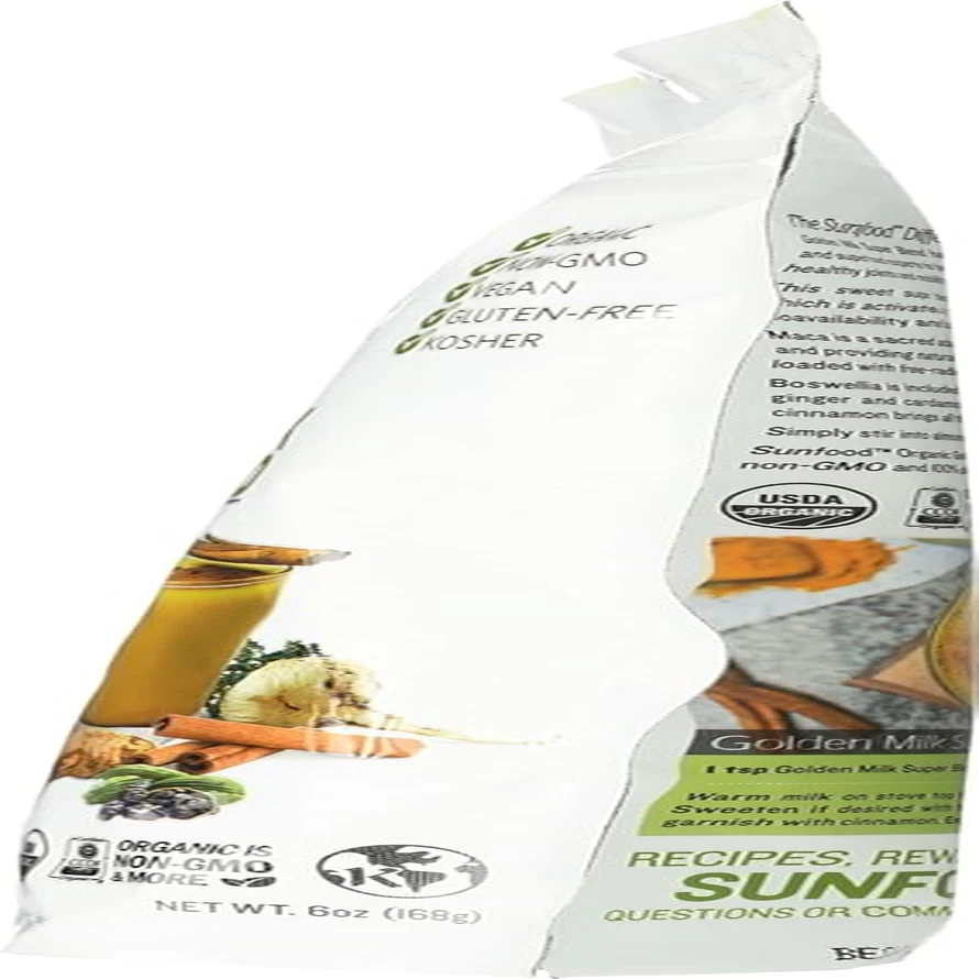 Store New Arrivals Add to Favorite View Feedback Contact Fast deliveries to the customer's home Quality customer service John Make the customers happy! s Golden Milk Super Blend - Superfood Golden Milk, Turmeric Powder, Superfood with Turmeric and Ginger, Black Pepper, Cinnamon & Cardamom, Turmeric Latte Powder, Vegan, USDA Organic - 6 Oz Description PREMIUM GOLDEN MILK POWDER - Our golden milk powder with turmeric and ginger is a powerful nutritious blend to add to your daily routine. Make a turmeric latte, add it to a smoothie, or mix with milk! POWERFUL BLEND - This ginger turmeric pepper powder is full of powerful superfoods including cinnamon, cardamom, maca, and boswellia, so you can start your day with comprehensive support PACKED WITH BENEFITS - Turmeric is renowned for its ability to support digestive and immune health. This golden milk powder blend is also rich in antioxidants, adaptogens, and superfoods CERTIFIED ORGANIC - Sunfoods Golden Milk Super Blend is certified USDA Organic, Non GMO, and Kosher. Plus, our turmeric milk powder is raw, vegan, and 100% ethically sourced ABOUT SUNFOOD - We are a family-owned company based in San Diego, dedicated to creating supplements & nutritious snacks. We use ethically sourced natural ingredients & never compromise on quality Product Description Golden Milk Super Blend Golden Milk Super Blend has been formulated by our herbal and superfood experts to be a delicious elixir that helps support healthy joints and mobility. This sweet super blend contains curcumin-rich turmeric, which is activated by the added black pepper to increase its bioavailability and balance inflammation throughout the body. Golden Milk is an ancient Ayurvedic beverage that has a mildly sweet taste and can be served warm or cold. Turmeric is the main ingredient in this blend and is activated by black pepper for increased bioavailability. In combination with maca - an adaptogenic root – it can help induce a sense of balance. Maca is a sacred adaptogenic superfood, balancing hormones and providing natural energy. Goji berry is naturally sweet and loaded with free-radical fighting antioxidants. Boswellia is included to help support immune function, while ginger and cardamom support normal digestion. A dash of cinnamon brings all the flavors together harmoniously. Simply stir into coconut milk and let it go to work. Sunfood Organic Golden Milk Super Blend is certified organic, non-GMO and 100% plant-based. A nti-Inflammation + Antioxidant Immune Support + Digestive Health + Balance & Stress Relief Our Beliefs & Mission We believe the key to good health, natural energy and long life is diet and nutrition. We believe Mother Nature has provided an abundance of diverse, nutritionally-rich plants that can be sustainably grown and harvested for the benefit of human-kind. We believe in the restorative and healing power of superfoods. It is our mission to share these superfoods with people seeking a truly natural solution to improve their health and well-being. Along the way, we hope to open more minds to our beliefs by gathering and spreading knowledge on the science behind superfoods, and their wide-ranging health benefits. Turmeric Root = Anti-Inflammation Contains a powerful compound called curcumin that help to balance and normalize inflammation in the body. Helps with joint strength and mobility, perfect for athletes or people with joint problems. High in antioxidants that fight free radical damage and boosts the immune system. Black Pepper = Activation and Absorption Activates curcumin content and increases the bioavailability allowing for better absorption by the body. Ginger Root = Digestive Health Helps balance inflammation in the body, and promotes a happy digestive system. Helps reduce nausea and indigestion. Boosts immune system, contains antioxidants gingerol that promotes healthy cell growth. Helps to balance blood sugar levels. Maca Root = Hormone Balance, Energy & Stress Relief Adaptogenic herb that helps balance hormones and relieve stress in the body. Contains calcium and magnesium, which may contribute to normal bone health and immunity. Helps increase energy, endurance, and stamina. Goji Berry = Immune Defense Rich in antioxidants which may provide a boost to immunity. Contains vitamin A, selenium, vitamin C and potassium. A natural whole fruit powder that has a sweet taste. Cinnamon = Flavor & Antioxidant Boost Rich in antioxidants that aid in normalizing inflammation. Supports heart, brain, and blood sugar health. Cinnamon may help with heart health and maintaining optimal cholesterol levels. SUGGESTED USE & INDICATIONS Stir 1 serving of Golden Milk Super Blend into 8oz coconut milk. Try it hot or cold, both are delicious! Ingredients: Turmeric*, maca*, goji berry*, cinnamon*, stevia*, ginger*, boswellia*, guar gum*, cardamom*, black pepper* ( *Certified Organic) Storage: Reseal bag after opening. Store in a cool, dry place. FDA Disclaimer: These statements have not been evaluated by the Food and Drug Administration. This product is not intended to diagnose, treat, cure, or prevent any disease. ORGANIC Organic food is produced without using harmful or toxic pesticides, sewage sludge or petroleum-based synthetic fertilizers, genetically modified organisms (GMOs), bioengineering, or ionizing radiation. NON-GMO This product has been verified to be absent of GMOs. Sunfood does not support the use of GMOs. All Sunfood products, including those that are not certified organic, are sourced to be free of GMOs. VEGAN / PLANT-BASED This product is made entirely from plant-based ingredients. No animal products are used at any point in the manufacturing process, and none of our products are ever tested on animals. GLUTEN-FREE This is a gluten-free product. No glutinous ingredients are used and no ingredients come into contact with glutinous materials during the processing. GOLDEN MILK FAQs What is organic turmeric powder good for? Organic turmeric powder is good for 