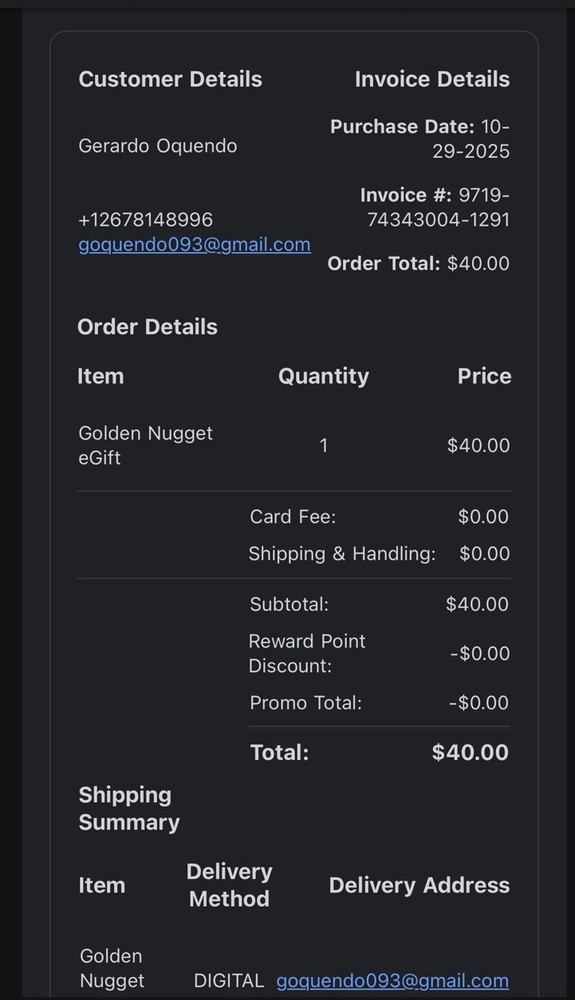 Golden Nugget $40 eGift Card Casinos Digital Valid for 35$ OBF
