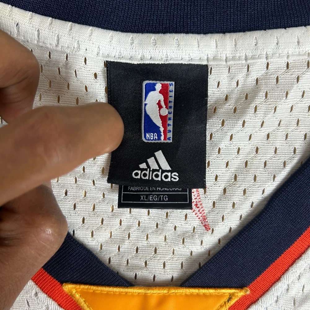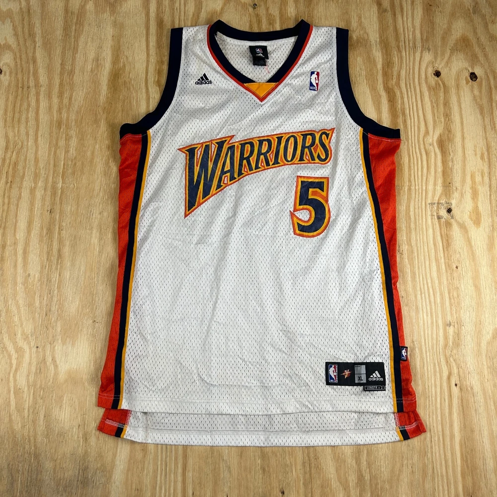 Show your love for the Golden State Warriors with this vintage Baron Davis #5 basketball jersey. Made by adidas, this men's XL jersey is perfect for any fan of the National Basketball Association (NBA). The jersey features the iconic Warriors logo in white on blue, with Davis' name and number on the back. This jersey is perfect for regular season games and is made in Honduras. Get your hands on this piece of fan apparel and show your support for the team on game day. SKU: HB-08-89