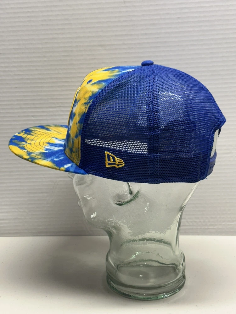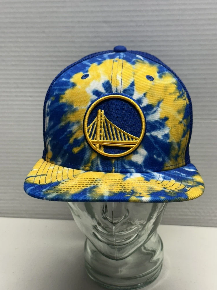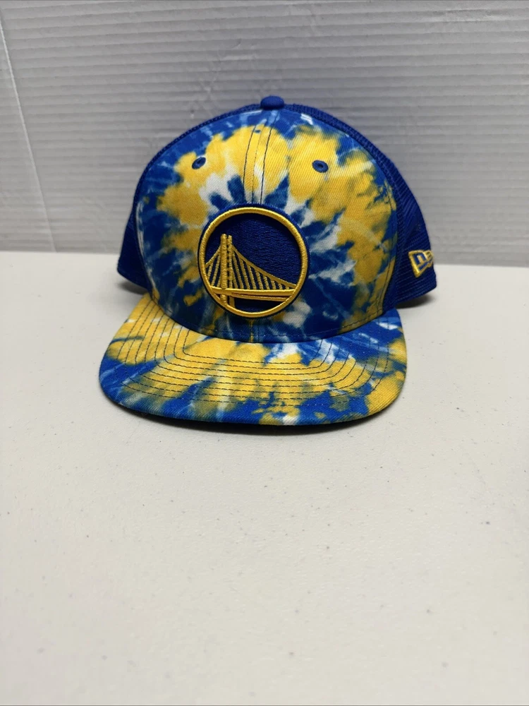 This is a Golden State Warriors New Era 9Fifty Tie Dye Adjustable Hat Cap, officially licensed by the National Basketball Association. It is designed for unisex adults and features a multi-color tie-dye pattern. The hat is one size fits all and is made in Vietnam. Perfect for showing support for the Golden State Warriors in regular NBA season games. 616