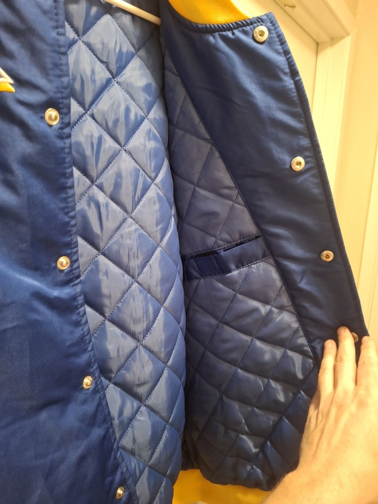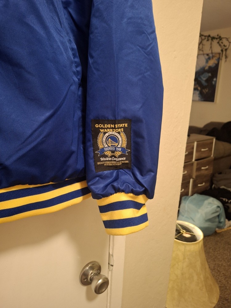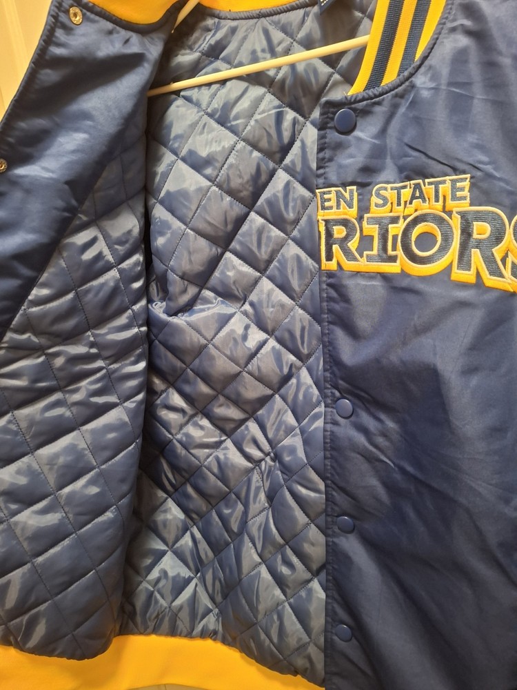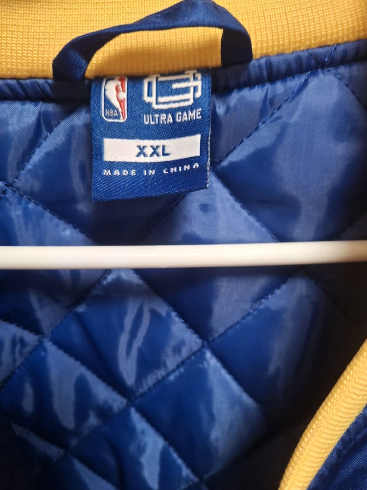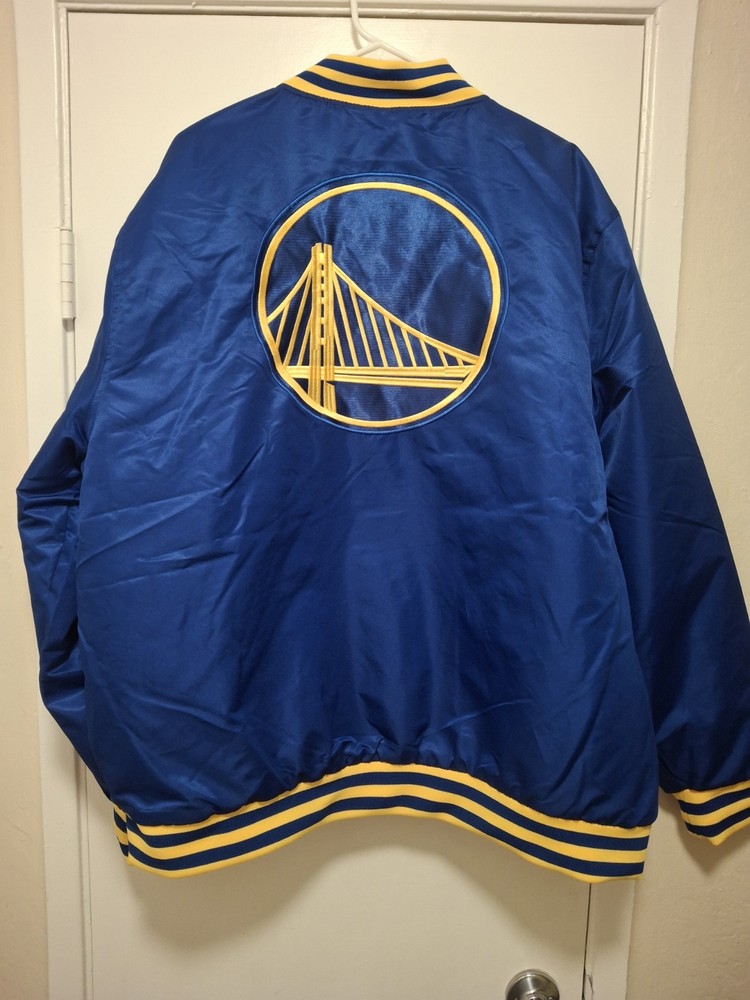 The product is a Golden State Warriors satin varsity jacket, featuring the team's logo and colors. This jacket is a fan apparel item that showcases support for the NBA team, making it a perfect addition to any basketball fan's wardrobe. The size XXL, ensuring a comfortable and stylish fit for fans of the Golden State Warriors.