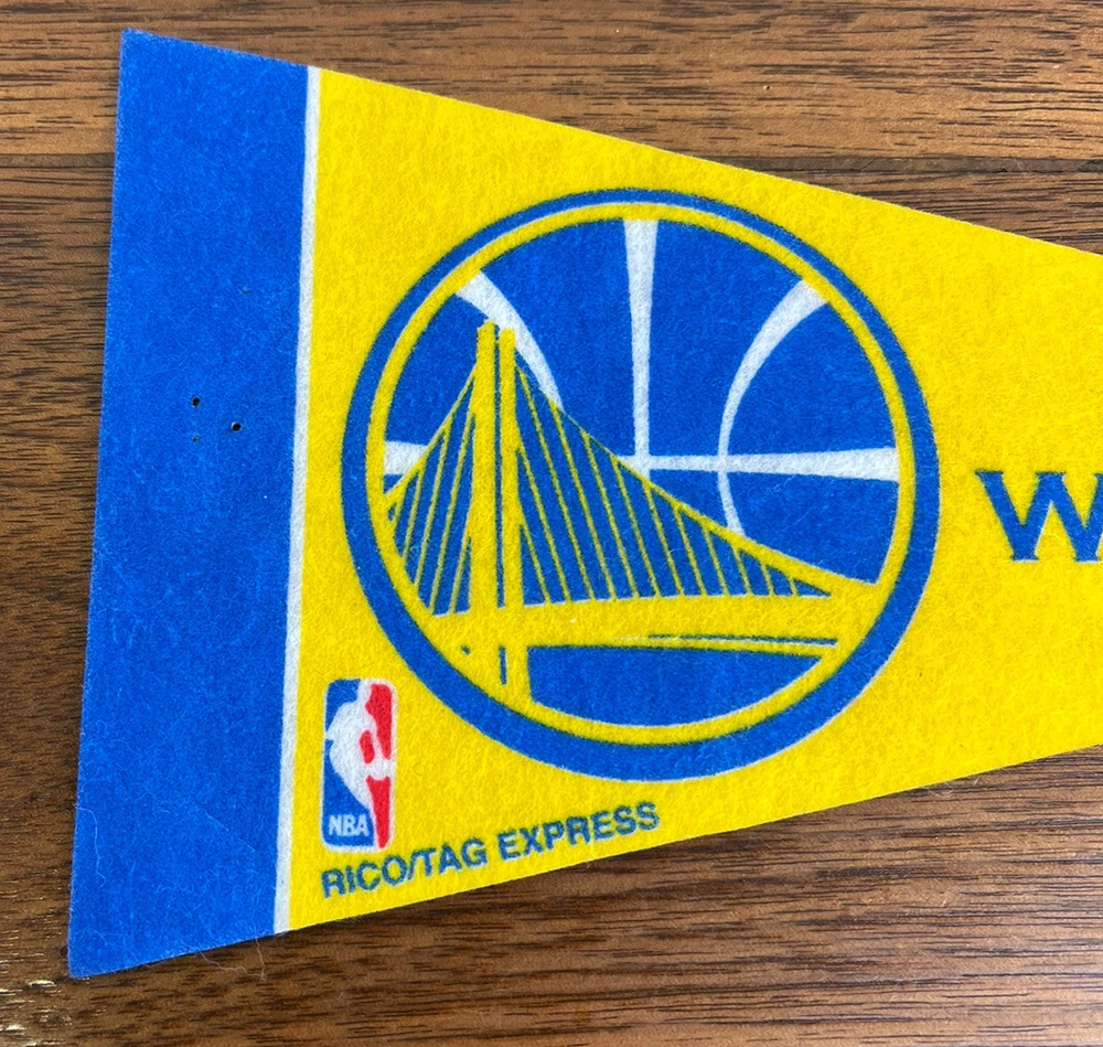 Golden State Warriors Vtg NBA Mini Pennants, 4" x 9" Rico Tag Express. Condition: good Preowned, has some tiny pin holes on the edges from hanging and some light wear and bending on the tip. See pictures, sold as is. Ships usps first class.