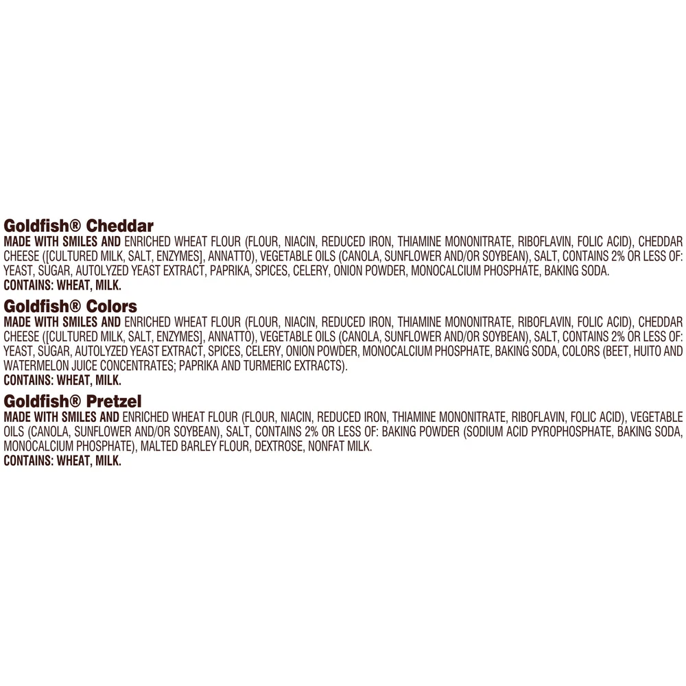 The irresistible little snack that always delights! This assortment of munchable, crunchable snack crackers includes Goldfish Cheddar, Goldfish Colors Cheddar and tasty Goldfish Pretzels. Goldfish Cheddar and Goldfish Colors Cheddar are baked with 100% Cheddar cheese. Goldfish Pretzels are crisp and delicious. All three flavors are always baked and made with no artificial flavors or preservatives. Talk about a feel-good snack! Goldfish snack crackers are great for lunch as well as snack-time munching. You can also add them to soups or add them as a side with your sandwich. That’s all it takes to whip up a meal that’s tasty and fun! Kids and adults alike love Goldfish crackers, and being able to choose from their favorites is sure to be a big hit with everyone. With 30 single-serve Snack Packs, you’ve made the right choice for lunches, on-the-go snacking and sharing. Expect big smiles all around. Next time you’re craving something delicious, go for the handful! VARIETY PACK INCLUDES: 10 single-serving packs of Goldfish Colors, 12 packs of Goldfish Cheddar, 8 packs of Goldfish Pretzels ALWAYS BAKED, NEVER FRIED: Goldfish crackers are always baked with no artificial flavors or preservatives KEEP GOLDFISH WITHIN REACH: From after-school snacking to mealtime, you can have all your favorite Goldfish flavors handy PERFECT FOR SHARING OR ENJOYING SOLO: Everyone loves the yummy taste of Goldfish crackers, so they’re perfect when spending time with family, friends or enjoying on your own ADD EXCITEMENT TO YOUR MEALS: Add Goldfish crackers to soups, sprinkle them on salads, or simply serve as a side to your lunchtime sandwich GO FOR THE HANDFUL: 10 Colors, 12 Cheddar and 8 Pretzel single-serve Snack Packs of Goldfish means there’s always a variety on hand and ready to enjoy