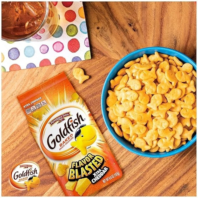 Kick snack time up a notch with the intense flavor of Pepperidge Farm Goldfish Flavor Blasted Xtra Cheddar Cheese Crackers, the fun, fish-shaped snack crackers with a smile. Packed with extra cheesy flavor, these baked cheese snacks are made with ingredients you can feel good about, including real Cheddar cheese and no artificial flavors or preservatives. The great taste and fun, bite-sized shape of these extra cheddar Goldfish crackers make them the perfect at-home or on-the-go snacks for kids and adults. Crunchy and cheesy with a big, bold flavor, they’re a munchable must-have for school lunches, study sessions, road trips, movie nights, game days and more. Make meals more exciting by serving Flavor Blasted Goldfish Xtra Cheddar Crackers with a sandwich and fruit as part of a balanced lunch, or try them as soup crackers or salad croutons for dinner. You can even crumble them up and use them to bread chicken breasts for a cheesy twist on a classic. Looking for fun, crowd-pleasing party snacks for your next gathering? Add Goldfish Cheddar Crackers to your charcuterie or snack boards or use them as an ingredient in your homemade snack mixes. From snack time to meal time, there are so many ways to enjoy the goodness of Goldfish. Each satisfying serving of 51 Flavor Blasted Goldfish contains 140 calories and 5 grams of fat. This 6.6-ounce bag contains roughly 6 servings and is the ideal size for snacking alone or sharing. Goldfish Flavor Blasted Xtra Cheddar Cheese Crackers are also available in 30-ounce cartons that contain 28 servings, as well as convenient single-serve packs for easier on-the-go snacking. Try Goldfish Cheddar Crackers Made with Whole Grain for the same great taste with 12 grams of whole grain per serving. Goldfish snack crackers are also available in other cheesy flavors, including Cheddar Jack’d and Cheesy Pizza. Go for the handful with Goldfish. THE SNACK THAT SMILES BACK: Goldfish Flavor Blasted Xtra Cheddar Cheese Crackers are fun, fish-shaped snack crackers with a smile INGREDIENTS YOU CAN FEEL GOOD ABOUT: These baked cheese snacks are made with real cheese and no artificial flavors or preservatives FOR KIDS AND KIDS AT HEART: The great taste and fun shape of Goldfish crackers make them the perfect at-home or on-the-go snacks for kids and adults MORE EXCITING MEALS: Enjoy these extra cheddar Goldfish with a sandwich for lunch, or use them as soup crackers or salad croutons for dinner CROWD-PLEASING PARTY SNACKS: Add Goldfish crackers to charcuterie or snack boards or use them in homemade snack mixes GO FOR THE HANDFUL: A single satisfying serving contains 51 Flavor Blasted Goldfish; each 6.6-ounce bag contains 6 servings