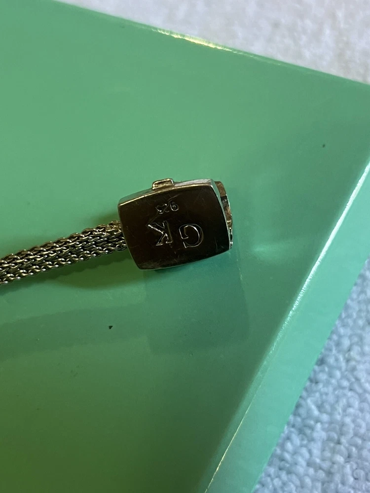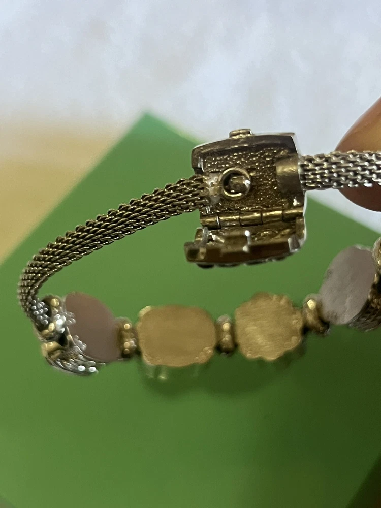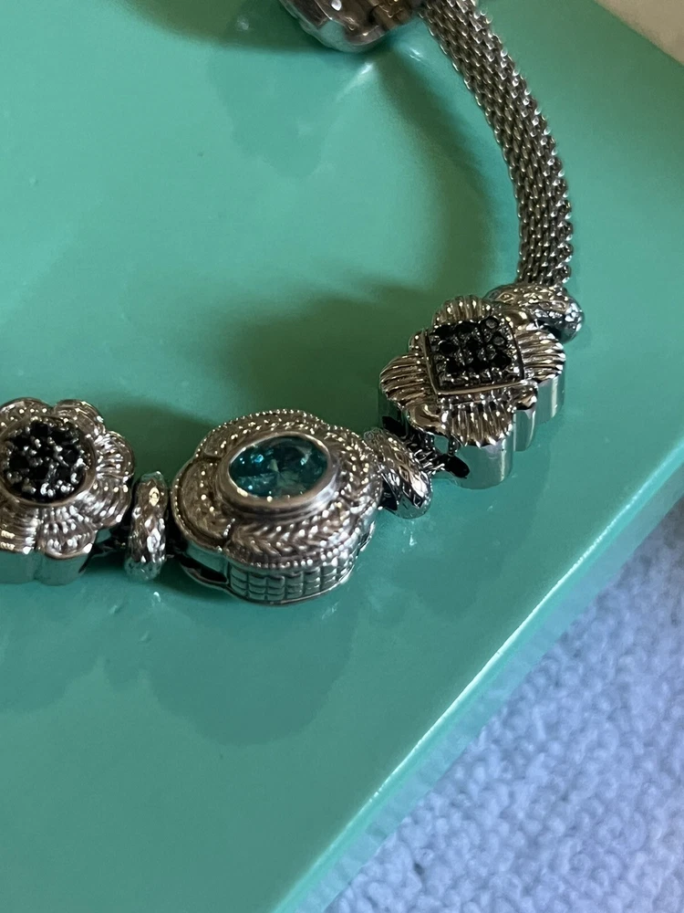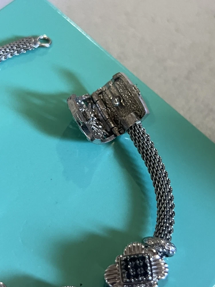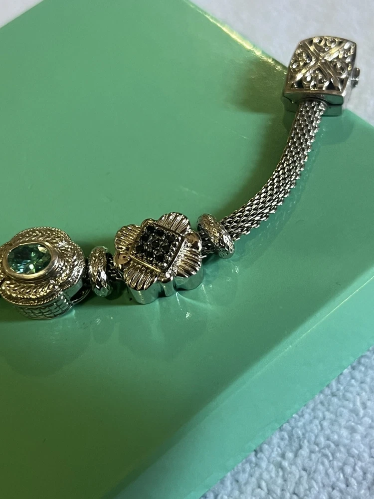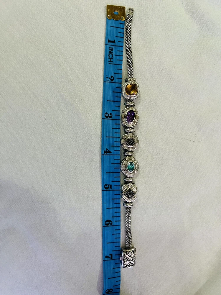 This stunning Goldman Kolber bracelet is a must-have for any jewelry collection. Crafted with excellent cut grade and a mesh chain type, this bracelet is both stylish and comfortable to wear. Its charm style and dividers make it a perfect accessory for any occasion. Included in the purchase are 5 slides charms and 6 dividers, adding a unique touch to the already gorgeous bracelet. Whether you're dressing up for a special event or adding a touch of elegance to your everyday look, this bracelet is sure to impress. Don't miss out on the opportunity to own this exquisite piece of fine jewelry. This item in excellent condition . Pictures are part of description. Over $1000 value for all most half price. The bracelet is bit over 7 inches long .