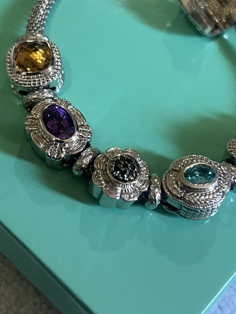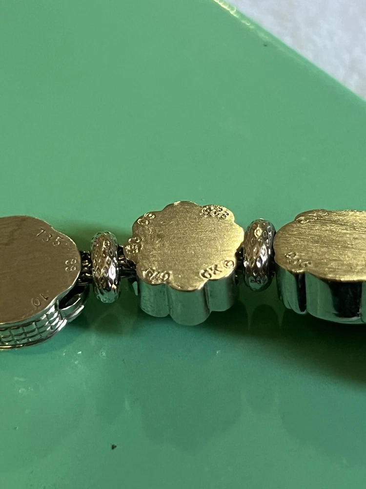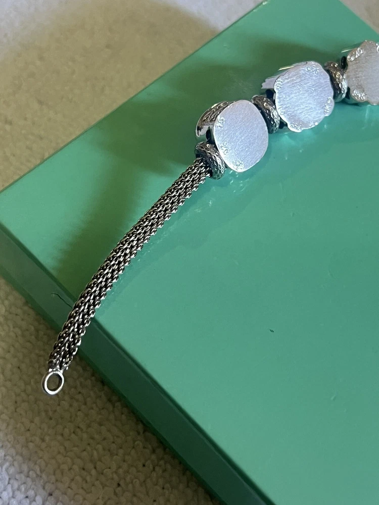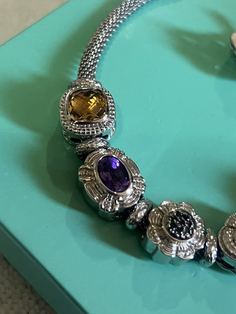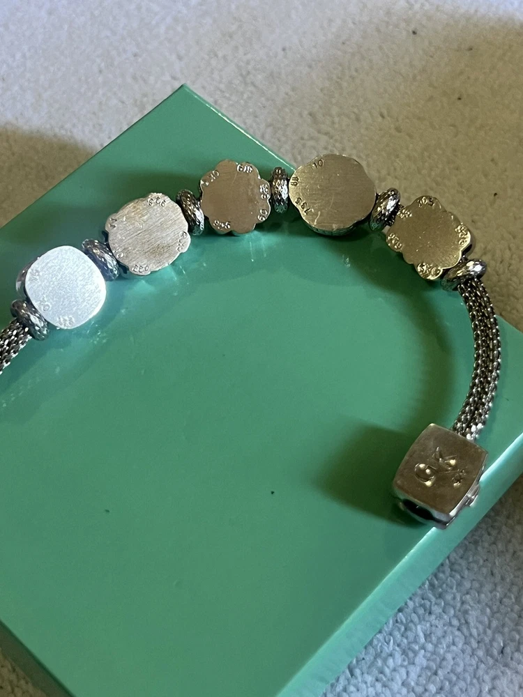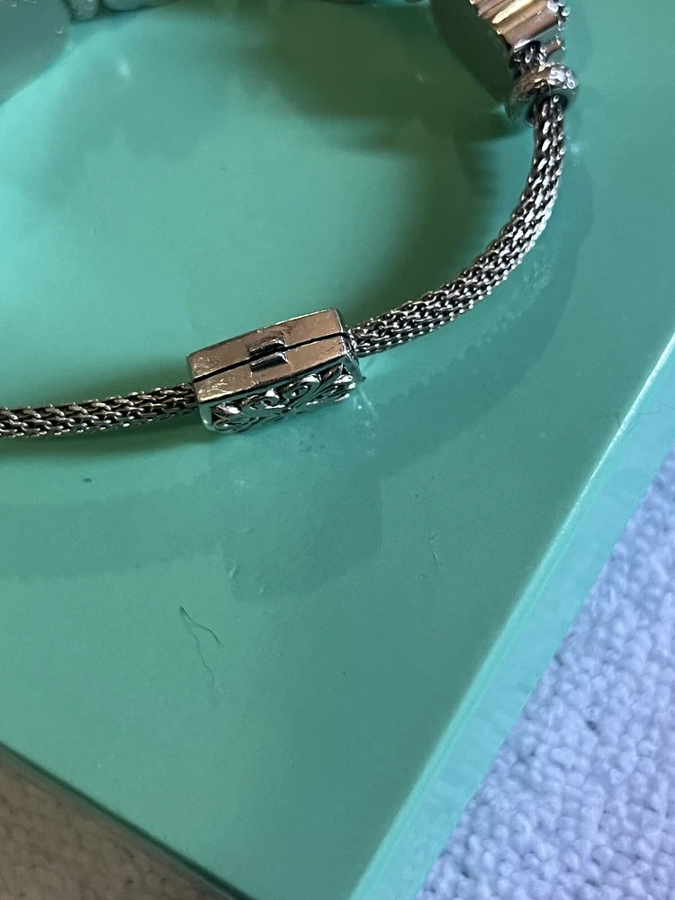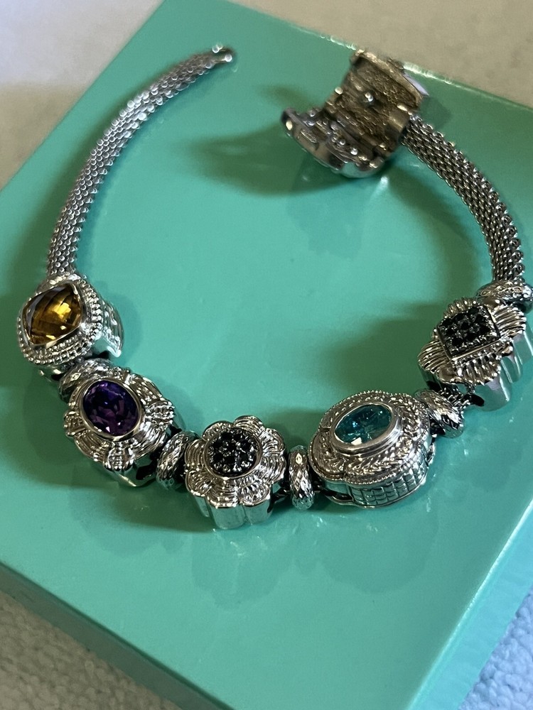 This stunning Goldman Kolber bracelet is a must-have for any jewelry collection. Crafted with excellent cut grade and a mesh chain type, this bracelet is both stylish and comfortable to wear. Its charm style and dividers make it a perfect accessory for any occasion. Included in the purchase are 5 slides charms and 6 dividers, adding a unique touch to the already gorgeous bracelet. Whether you're dressing up for a special event or adding a touch of elegance to your everyday look, this bracelet is sure to impress. Don't miss out on the opportunity to own this exquisite piece of fine jewelry. This item in excellent condition . Pictures are part of description. Over $1000 value for all most half price. The bracelet is bit over 7 inches long .