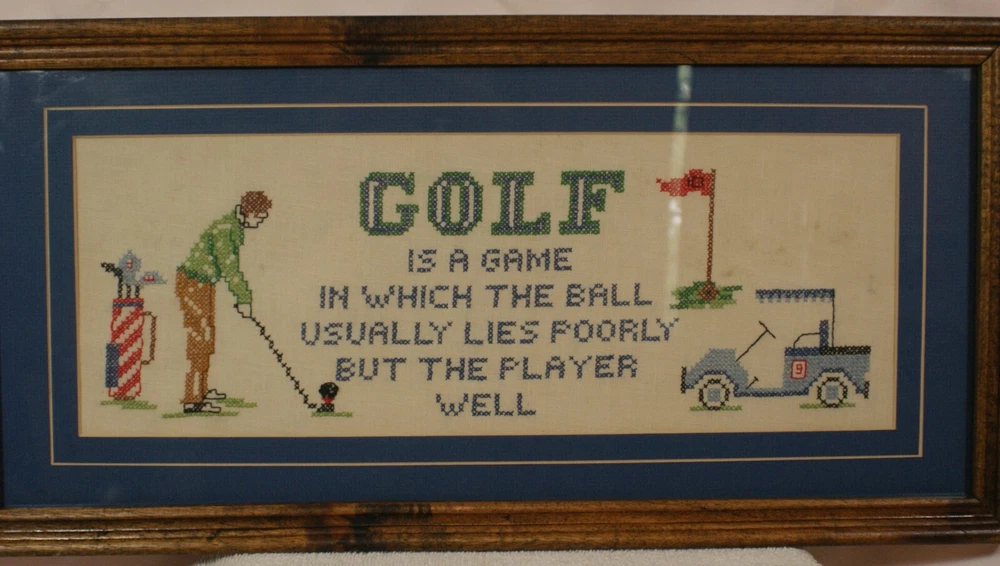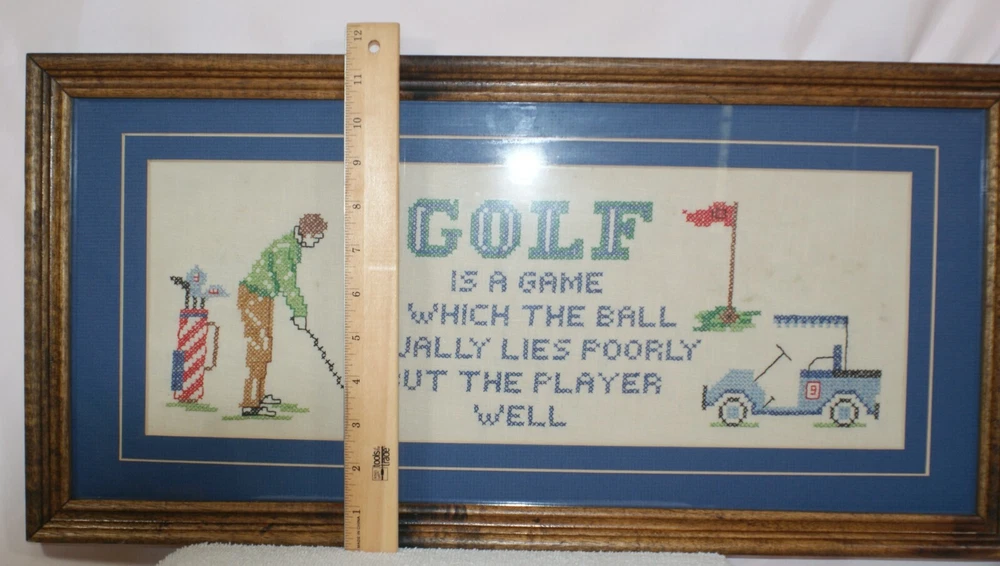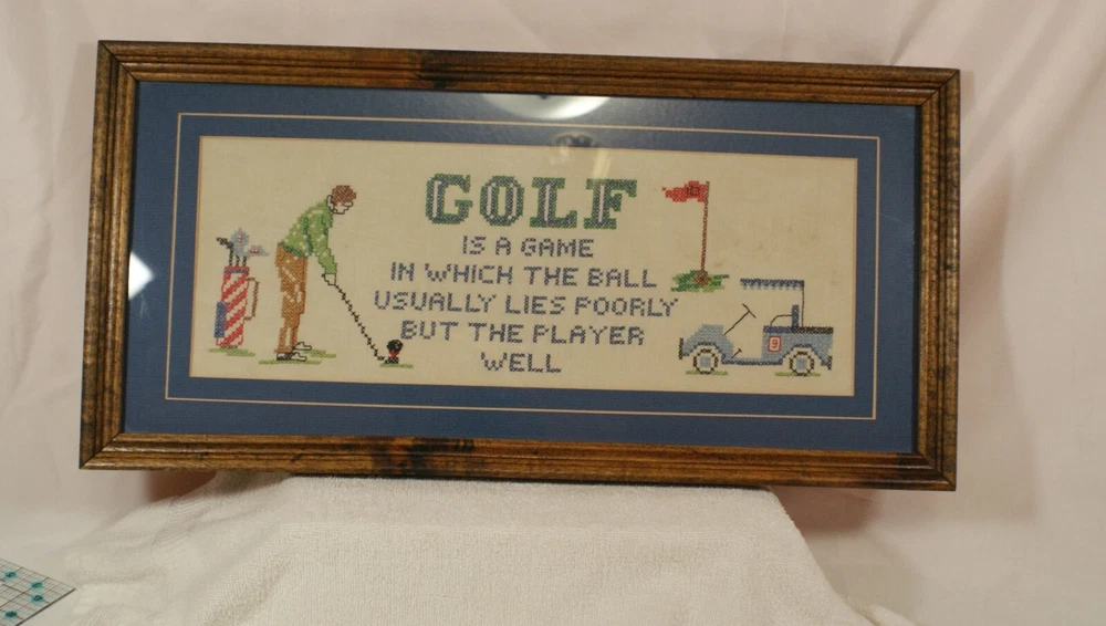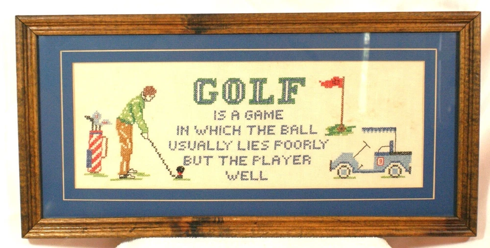 Enhance your golf-themed decor with this beautifully designed cross stitch framed artwork. The multi-colored needlework depicts a golfer in action, with a vintage quote adding a touch of class. It's perfect for any golf enthusiast and would look great in a home or office setting. This product is specifically designed for fans of the sport, adding a unique touch to your collection of golf-themed decor. The high-quality framing ensures the artwork is protected and can be displayed for years to come. Don't miss out on this opportunity to own a piece of exquisite golfing art.