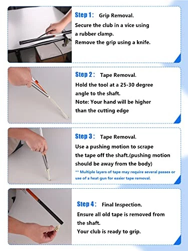 30 Days Return Policy Fast Delivery Trusted seller Golf Grip Tape Stripper Remove Tool, No Tape Residue Rapid Removal - Perfect for Regripping Graphite and Steel Shafts Golf Club Grip Repair Kits Product Description This set including 1pc grip tape remove tool and 15pcs golf grip tape. CONVENIENT & FAST: The Upgraded Golf Grip Tape Stripper helps you remove the tape on the club shafts faster, saving your time and energy. It is a necessary tool for professional and amateur golfers, say goodbye to traditional razor blades. EASY OPERATION: Follow the easy 4-step instruction process. After removing the grip, use the tool to push it repeatedly for several times to easily remove the tape (At the same time, use the heat gun to make the tape fall off more easily) FRIENDLY DESIGN: The rod made of high quality alloy with good durability. Ball handle to improve the feel, more convenient to use. Rubber cover is used to protect the tool, also easy to store. FITS YOUR SHAFTS: Our Remove Tool uses a flatter metal cutting end to fit your club shafts perfectly, whether it is graphite or steel shaft. Shipping Returns Payment Shipping Shipping is FREE to all addresses other than APO/PO boxes in the lower 48 states. All our stock ships from US-based warehouses. Shipped via USPS or UPS (depending on location and package weight) Unless stated otherwise, all orders will ship within 24-72 hours of your payment being processed. Check our feedback to see the great reviews of FAST shipping we offer. Returns As our valued customer, we will do our best to make sure the product you receive arrives to you on time and as expected. If you are not satisfied with your purchase, please contact us within 30 days of receiving your order to process a return. Payment We currently accept payment via eBay managed payments only. Once payment is cleared, we will dispatch your shipment within 1-3 business days. Please refer to the "Shipping" tab for more information regarding shipping speed to your destination.